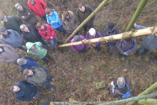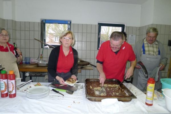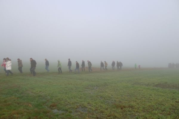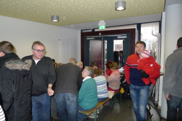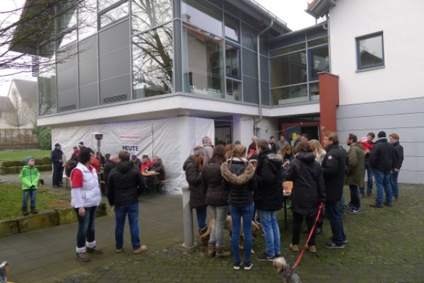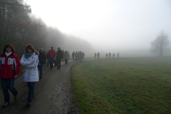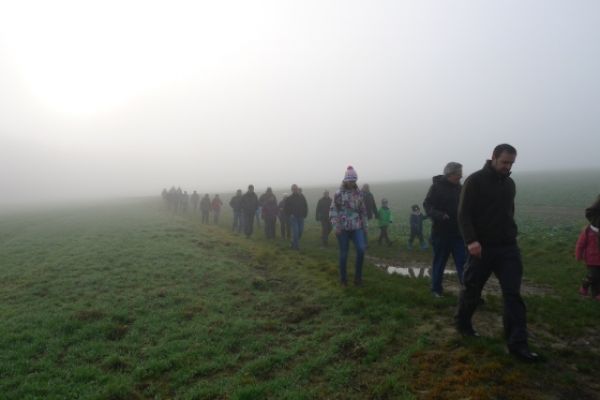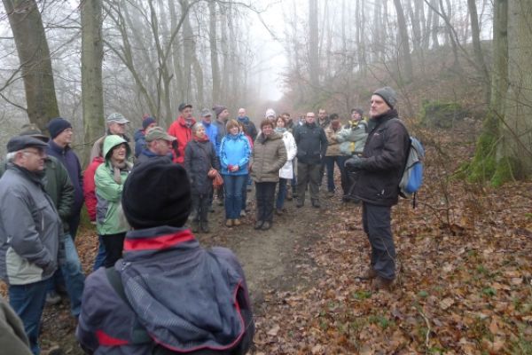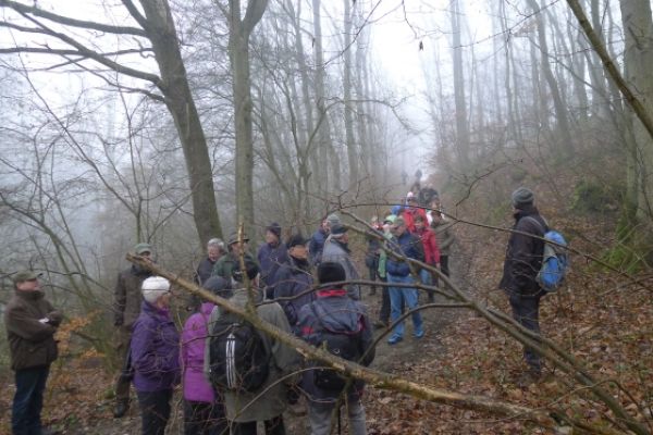 Wie haben sich Gemarkungsgrenzen entwickelt ? Warum gibt es Grenzgänge ? Seit wann gibt es Grenzsteine ? welche Arten von Grenzsteinen gibt es ? Welche Geheimnisse stecken hinter den steinernen Grenzmarkierungen ? Diese und weitere spannende Fragen zu Grenzen und Grenzsteinen beantwortete Grenzsteinobmann Daniel Singer anlässlich einer Führung zu der der TUS Vollnkirchen im Rahmen der Veranstaltungen zu seinem 50-jährigen Jubiläum eingeladen hatte. Über 40 geschichtsinteressierte Teilnehmer aus nah und fern konnte der erste Vorsitzende des TUS, Dr. Clemens Ruppert, zu der historischen Grenzwanderung begrüßen. Die Wanderung führte in den südlichen Teil der Vollnkirchener Gemarkung entlang der Grenze zum Nachbardorf Volpertshausen. Im Tal des Schwingbaches erläuterte Singer wie natürliche Landschaftselemente, wie zum Beispiel Bäche und Flüsse, oder künstlich geschaffene Gräben oder Wälle zur Grenzmarkierung genutzt wurden. Im Bereich der Gemarkung Wertshausen konnten dann Grenzsteine aus vornapoleonischer Zeit bestaunt werden. Im Jahre 1780 wurde hier die Herrschaftsgrenze zwischen dem Fürstentum Nassau-Weilburg und der Grafschaft Solms-Braunfels „abgesteint“. Auf dem gut erhaltenen Grenzstein sind die Aufschrift „NW“ für Nassau-Weilburg und „SB“ für Solms-Braunfels, sowie die Jahreszahl der Steinsetzung noch gut zu erkennen. Entlang dieser alten Grenzlinie verläuft heutzutage die Grenze zwischen Vollnkirchen und Oberwetz. An einer anderen Stelle konnte Singer mit einem sogenannten Güterstein einen weiteren Grenzsteintyp vorstellen. Er trägt die Aufschrift „NW“ und weist ein Eigenterritorium innerhalb der ehemaligen nassauischen Gemarkung aus. Zum Abschluss des Rundgangs wusste Clemens Ruppert Wissenswertes über die mittelalterliche Wüstung Wertshausen, die im Jahre 810 erstmals urkundlich erwähnt wurde und ca. 600 Jahre bestand, zu berichten. Im Jahr 2006 wurde im Rahmen der Dorferneuerung Vollnkirchen das Schicksal des mittelalterlichen Dorfes erforscht. Durch die Auswertung schriftlicher Quellen, einer geomagnetischen Untersuchung des Untergrundes und Feldbegehungen zur Suche von keramischen Scherben konnte so ein recht genaues Bild von der Lage des ehemaligen Dorfes gezeichnet werden. Nach gut drei Stunden Wanderung im teils dichten Nebel waren die Teilnehmer wieder zurück am Ausgangspunkt, genau rechtzeitig, um sich mit regionalen Köstlichkeiten aus dem Vollnkirchener Backhaus zu stärken. Die Mitglieder des Fördervereins Handball haben zum 9. Backhausfest zwischen den Jahren wieder das beliebte „arme Leute Essen“ Dulges, Braten und frischen Backhauskuchen zubereitet. Zahlreiche Besucher weit über die Grenzen Vollnkirchens hinaus waren in den kleinsten Hüttenberger Ortsteil gekommen