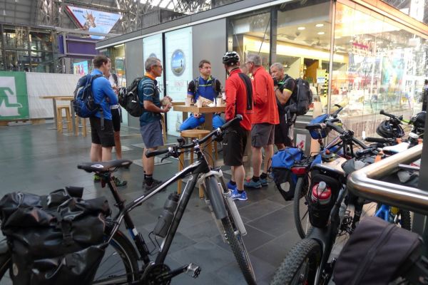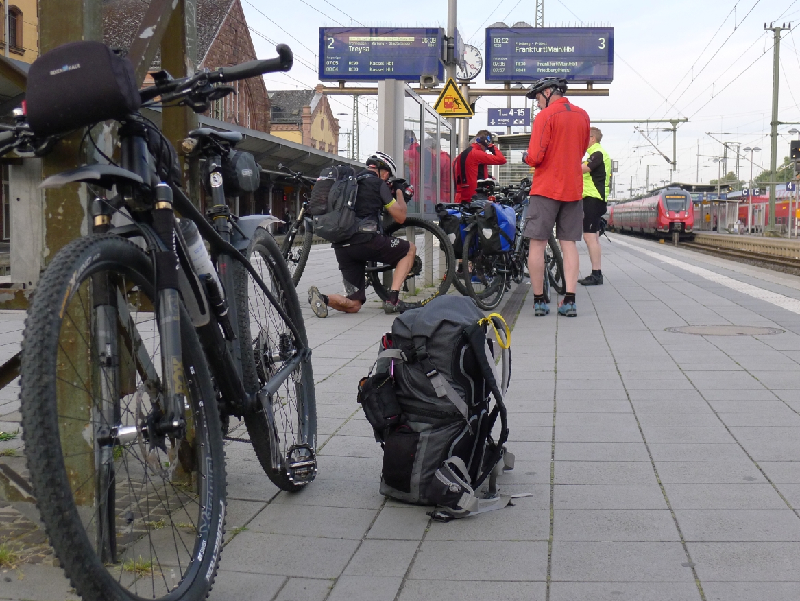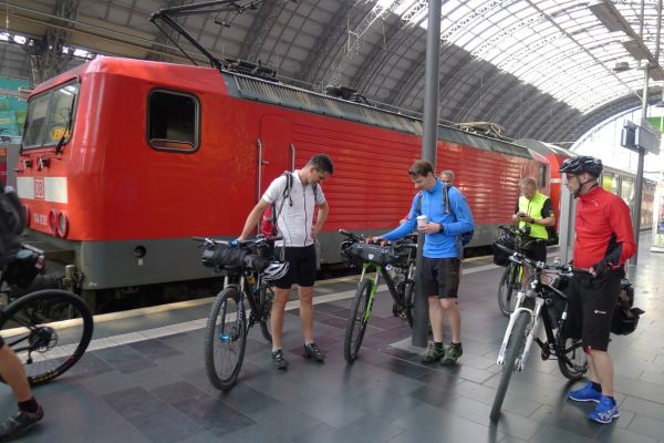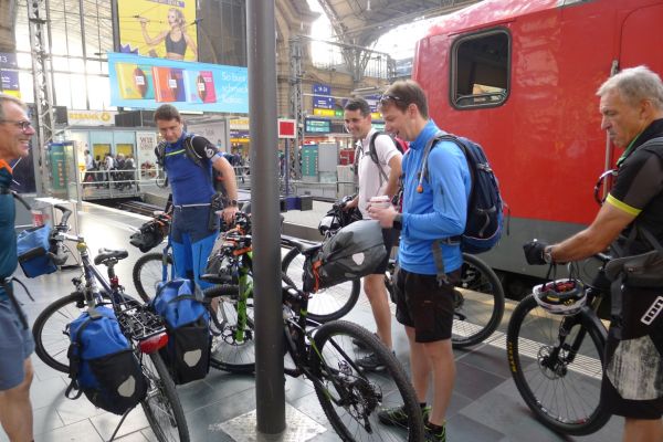 5:40 Uhr: Andi, Armin, Edwin, Klaus, Timo, Steff und ich machen uns auf den Weg zum Gießener Bahnhof. Kurze Zeit später kommt auch Lars mit einem breitem Grinsen hinzu. Die Vorfreude auf die Tour ist bei jedem zu spüren.