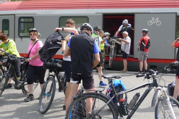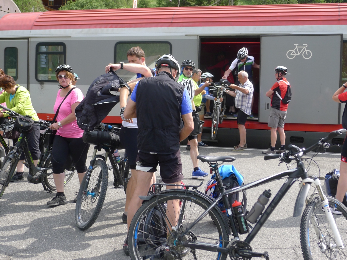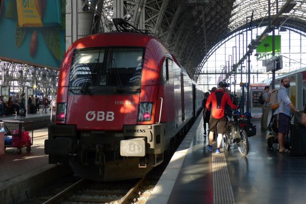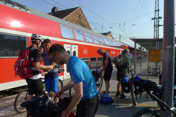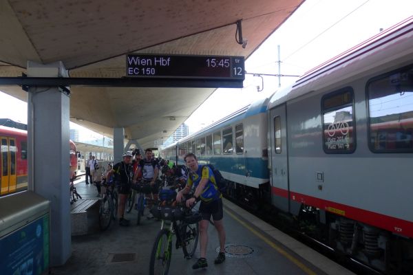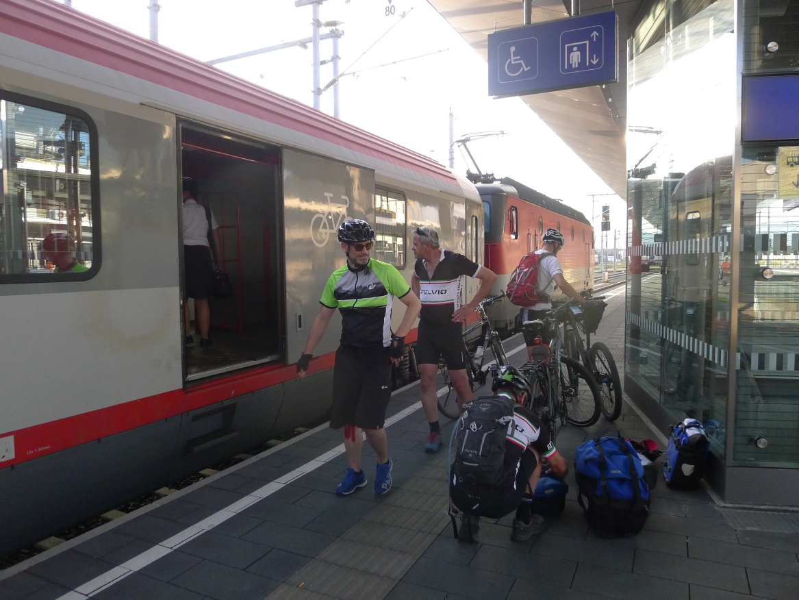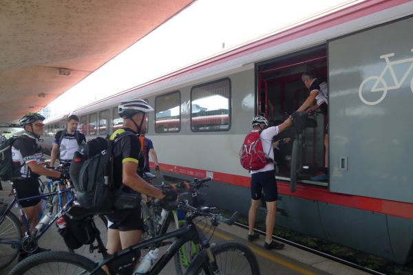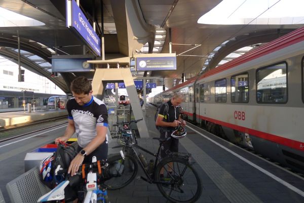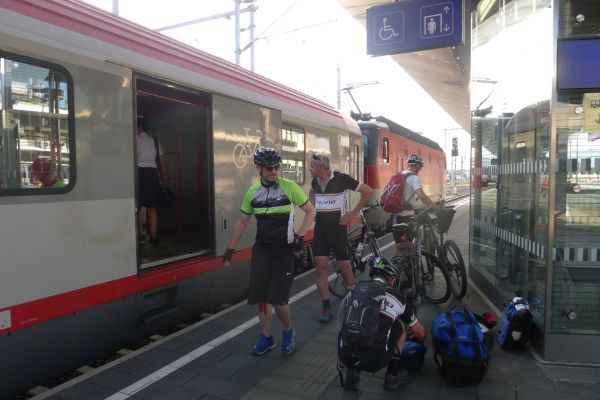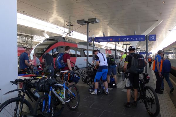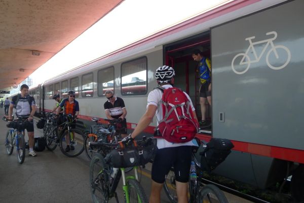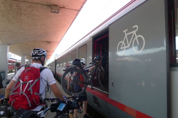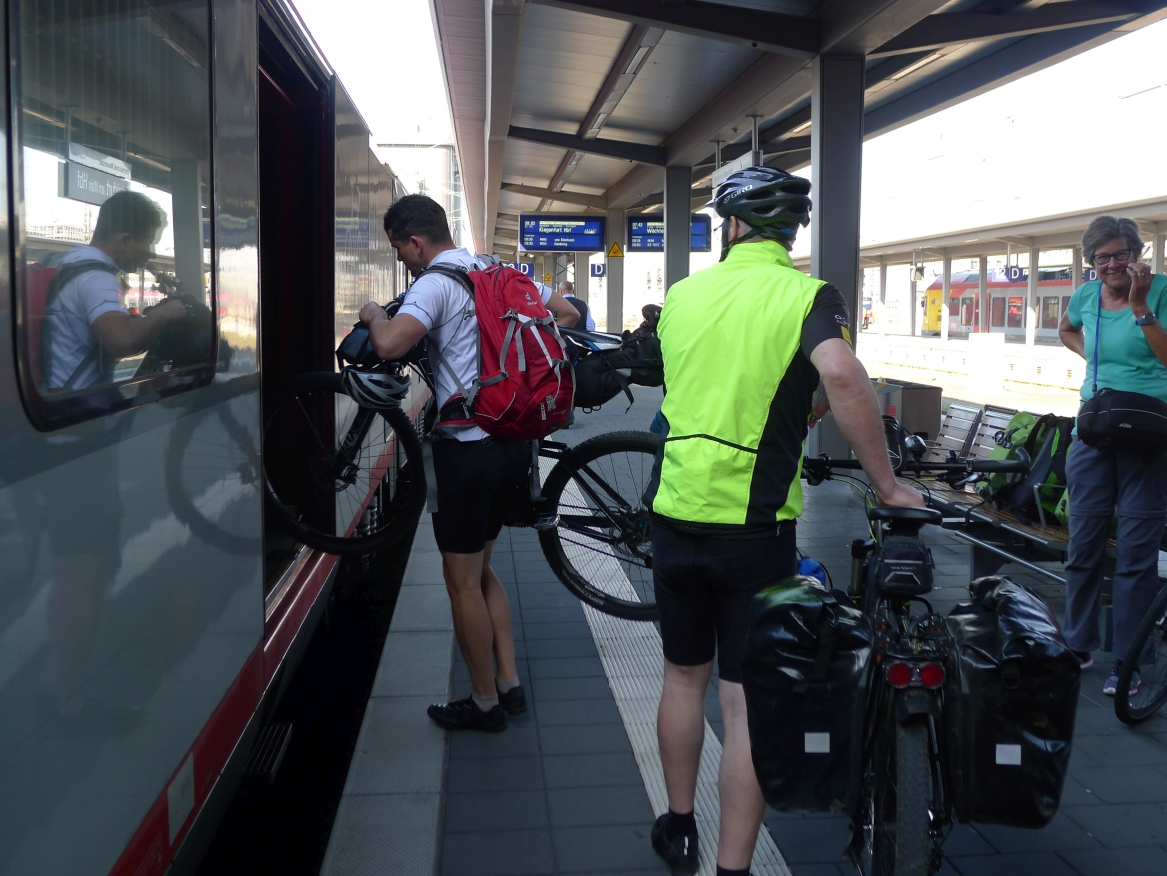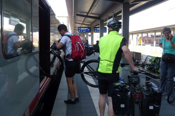 8:10 Uhr: wir gehen Richtung Bahnsteig, wo der Eurocity der ÖBB bereits wartet. Das Verladen der Räder wird zur ersten Herausforderung des Tages. Das Radabteil des österreichischen Zuges gleicht einem Viehwaggon mit einer Einstiegsluke in fast 1m Höhe. Dazu eine Schaffnerin, die Angst hat, dass wir uns verletzten könnten und uns mehrfach auffordert über die Türen einzusteigen. Sie springt ständig um uns rum, wir lassen uns aber nicht beirren und fahren mit dem Verladen fort.