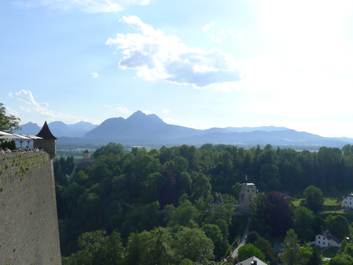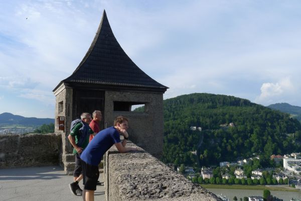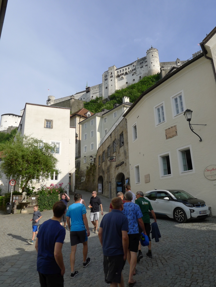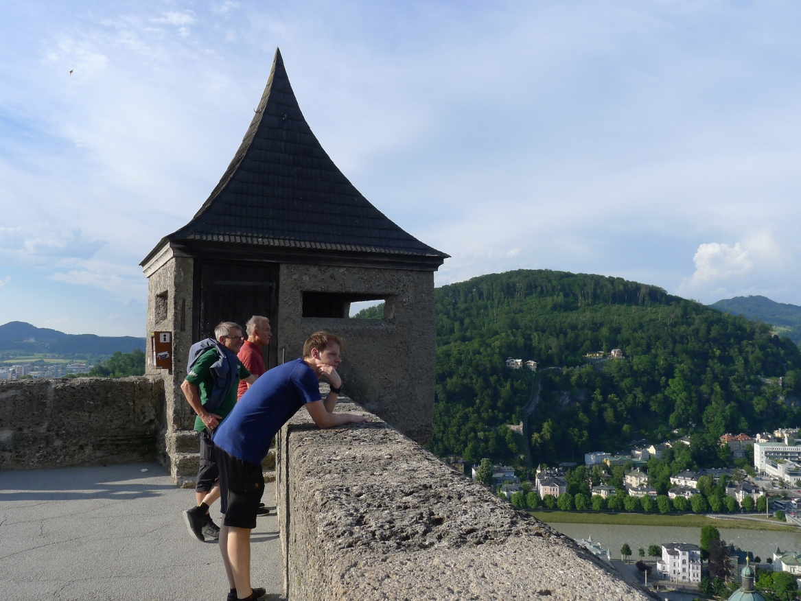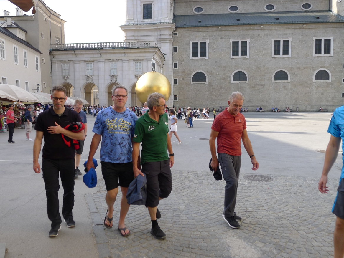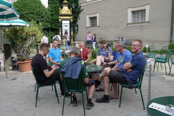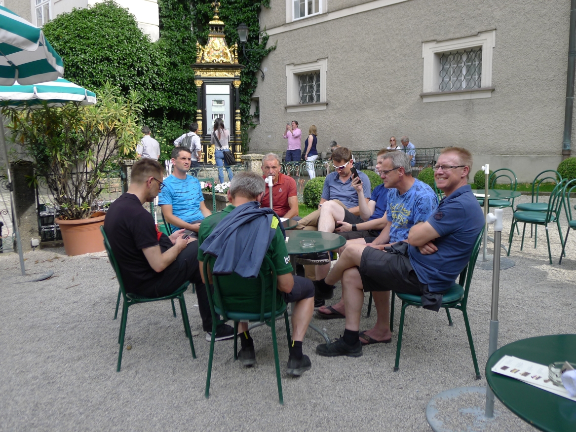 16:20 Uhr: nachdem der Rest der Truppe ne ¾ Stunde vor dem Hotel gewartet hat bis die 3-er WG der Jugendgruppe ihren Mittagsschlaf beendet hat, machen wir uns auf den Weg in die Stadt: Schloss und Park Mirabell, Altstadt mit Mozarthaus, Dom, Festung Hohensalzburg….. Der Stadtrundgang und vorallem der Blick von der Festung war schon sehr beeindruckend. Bei einem Espresso und einem Glas Grünen Veltiner („Gedeck oft he day“) kommt Urlaubsstimmung auf.