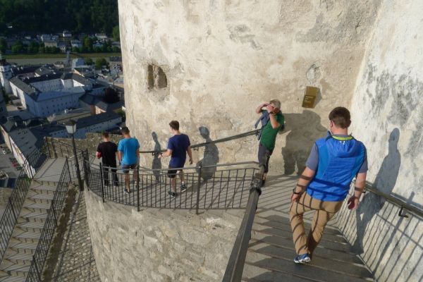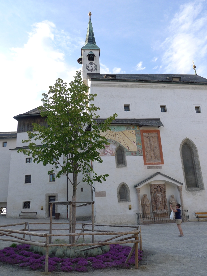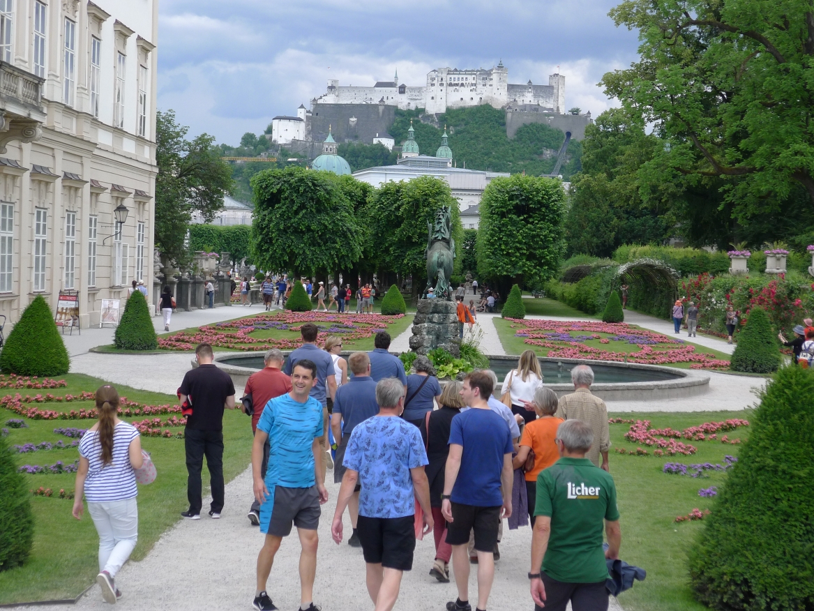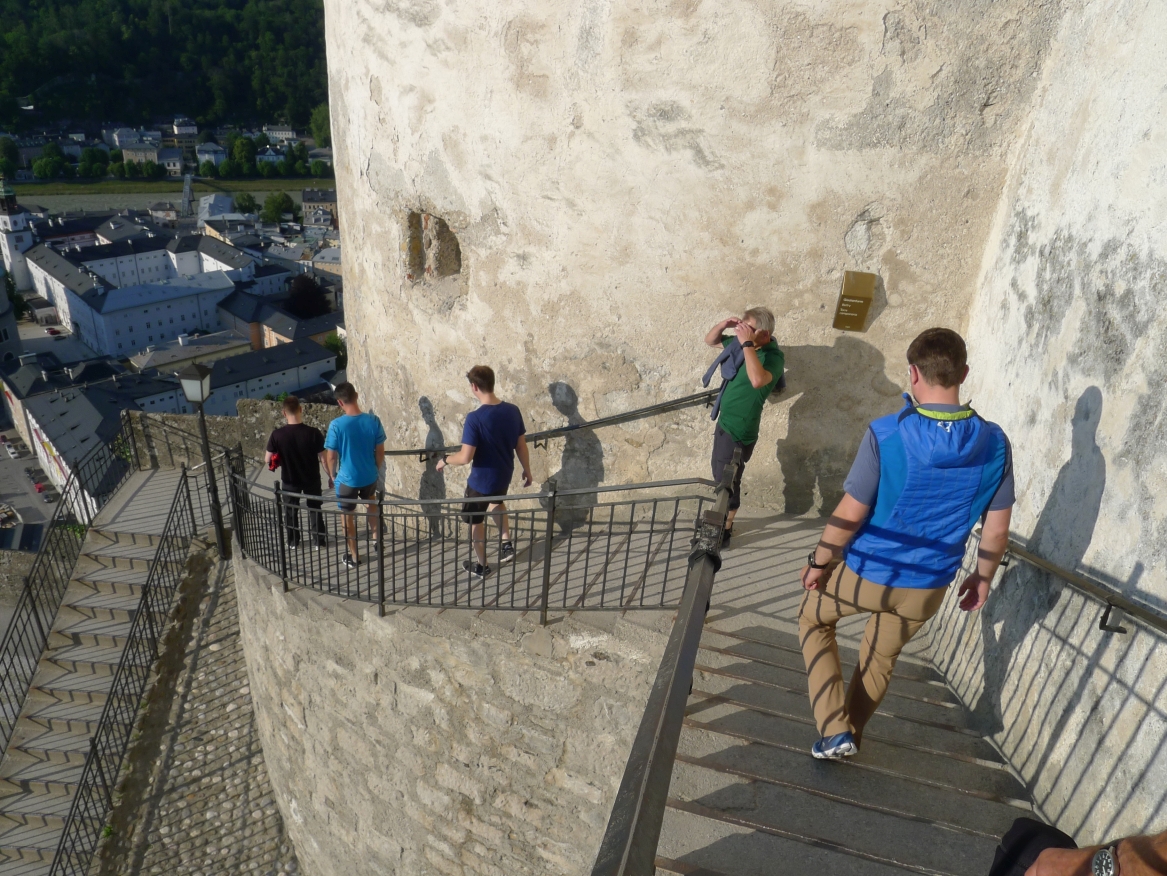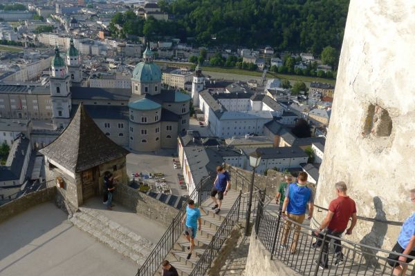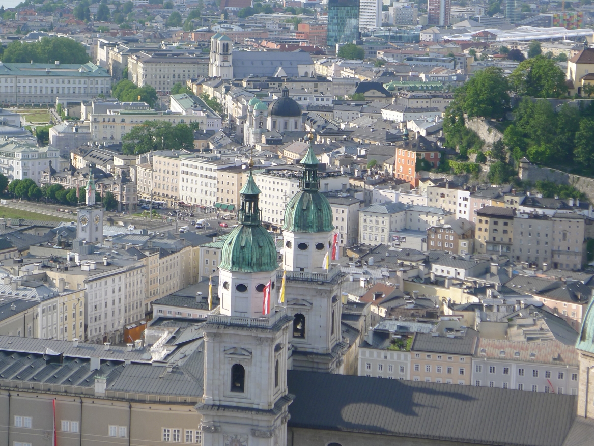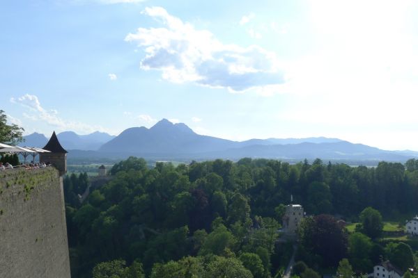 16:20 Uhr: nachdem der Rest der Truppe ne ¾ Stunde vor dem Hotel gewartet hat bis die 3-er WG der Jugendgruppe ihren Mittagsschlaf beendet hat, machen wir uns auf den Weg in die Stadt: Schloss und Park Mirabell, Altstadt mit Mozarthaus, Dom, Festung Hohensalzburg….. Der Stadtrundgang und vorallem der Blick von der Festung war schon sehr beeindruckend. Bei einem Espresso und einem Glas Grünen Veltiner („Gedeck oft he day“) kommt Urlaubsstimmung auf.