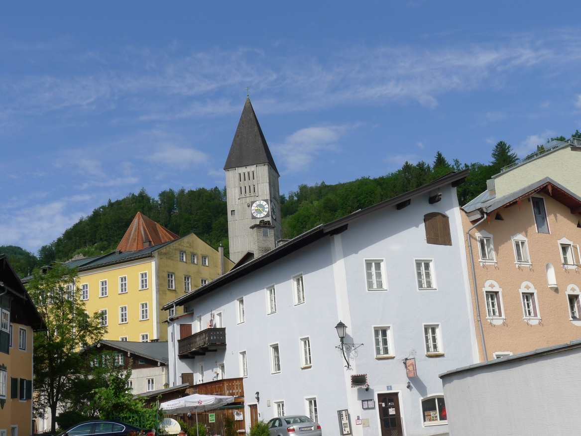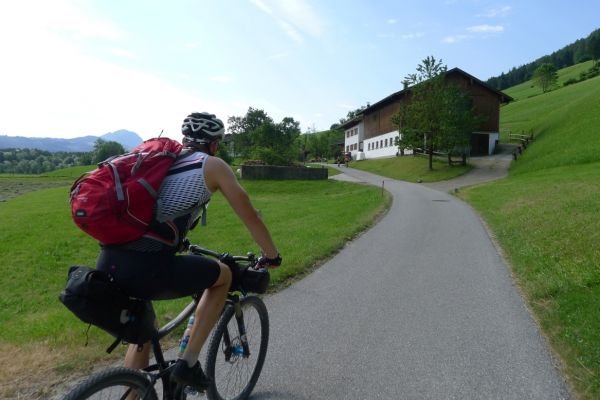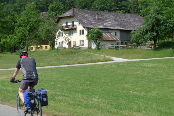 9:20 Uhr: wir erreichen Hallein und drehen eine Runde durch die Altstadt. Danach führt der Weg etwas von der Salzach weg. Es geht durch Wiesen, vorbei an Bauernhöfen und auch die ersten Steigungen kommen auf uns zu.