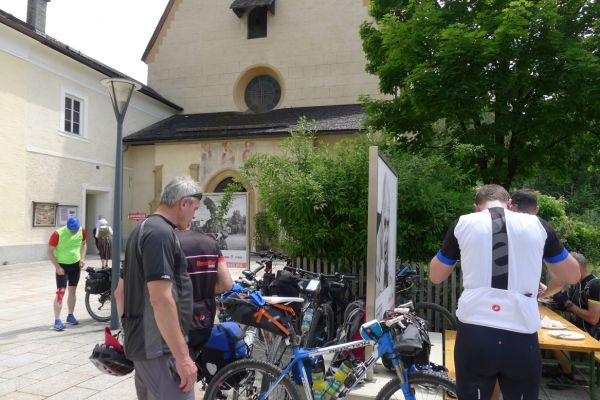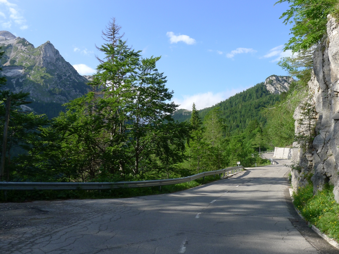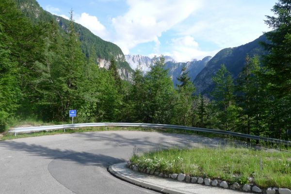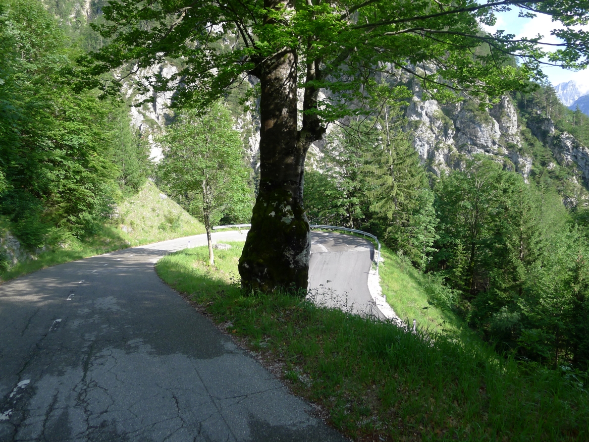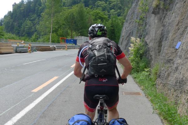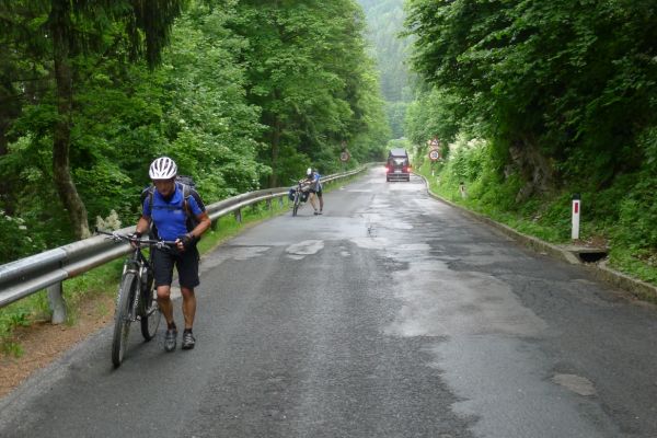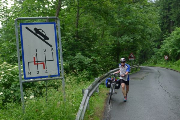 10:10 Uhr: bei km 33, kurz hinter Golling, steht der erste längere Anstieg zum Paß Lueg, ein Talpaß mit 552m Höhe, bevor. Das letzte Stück mit 12% ist ein erster Vorgeschmack auf die richtigen Berge. Am höchsten Punkt treffen wir einen Belgier, der die Paßhöhe sucht und enttäuscht ist, dass er keine Serpentinen fahren kann. Nach einem technischen Dienst an Jans Schaltung geht es weiter.