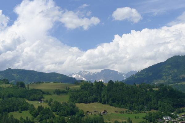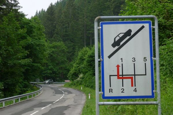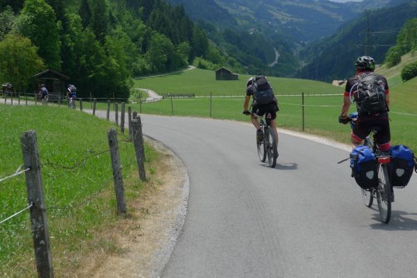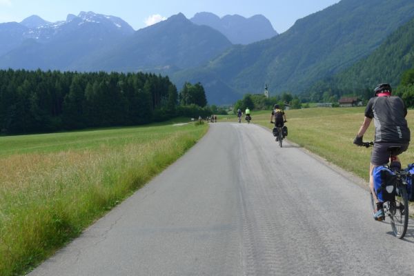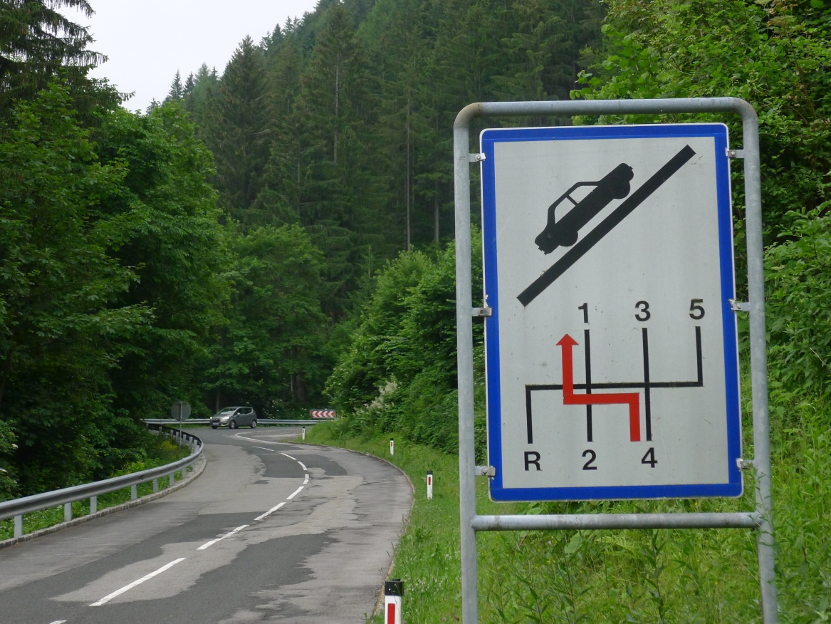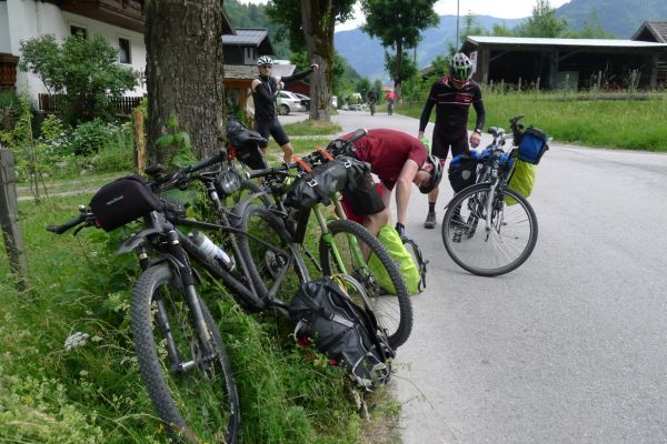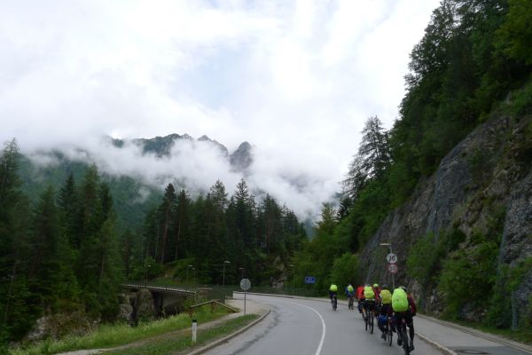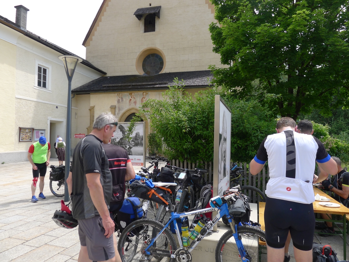 10:10 Uhr: bei km 33, kurz hinter Golling, steht der erste längere Anstieg zum Paß Lueg, ein Talpaß mit 552m Höhe, bevor. Das letzte Stück mit 12% ist ein erster Vorgeschmack auf die richtigen Berge. Am höchsten Punkt treffen wir einen Belgier, der die Paßhöhe sucht und enttäuscht ist, dass er keine Serpentinen fahren kann. Nach einem technischen Dienst an Jans Schaltung geht es weiter.