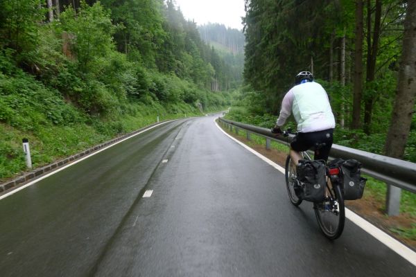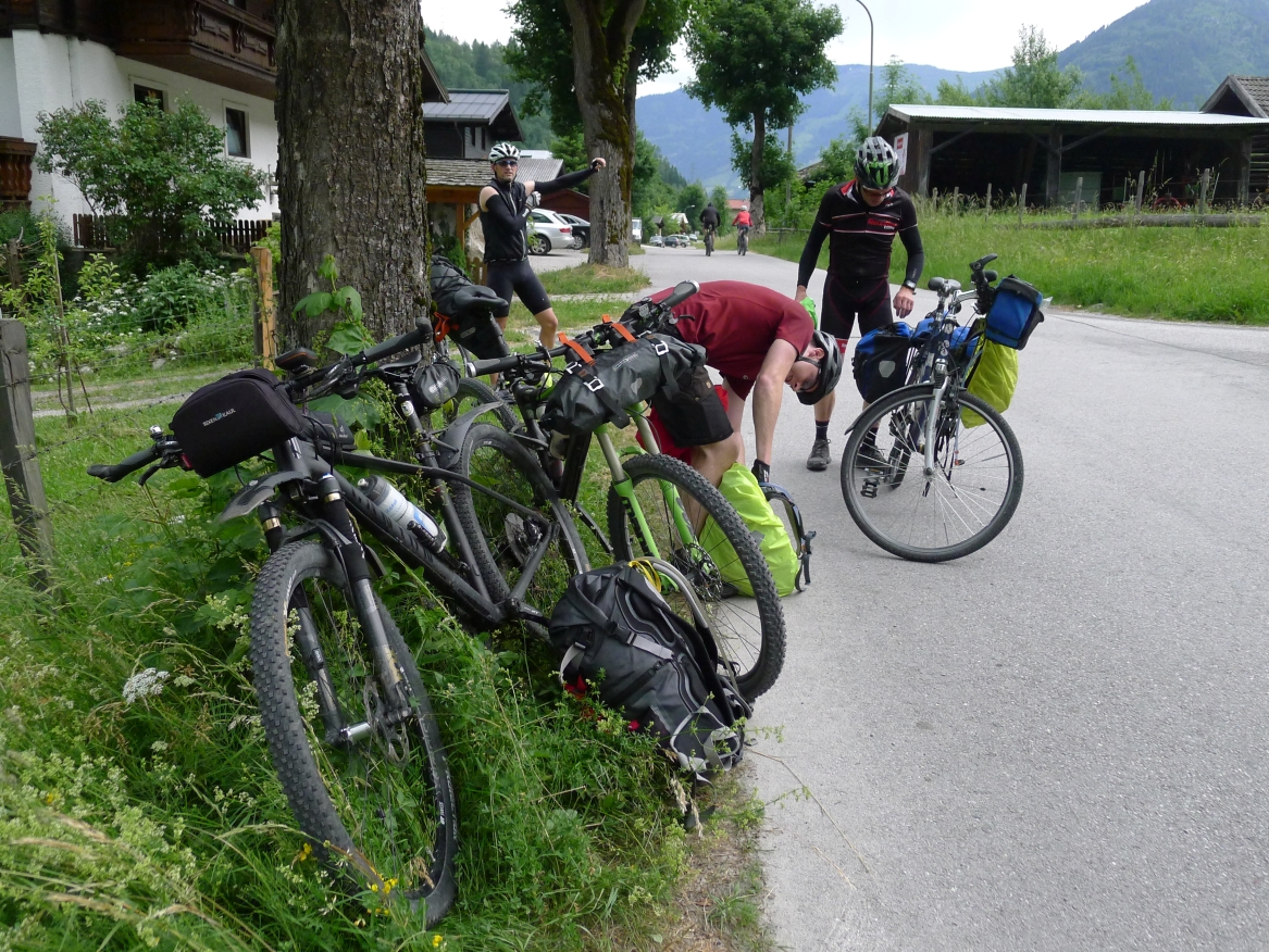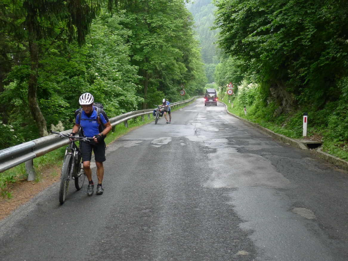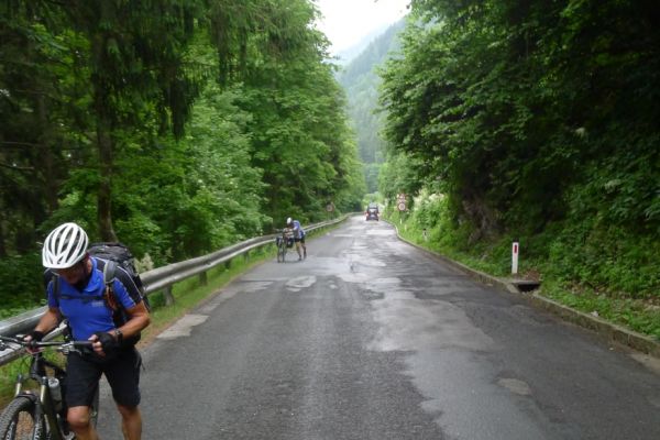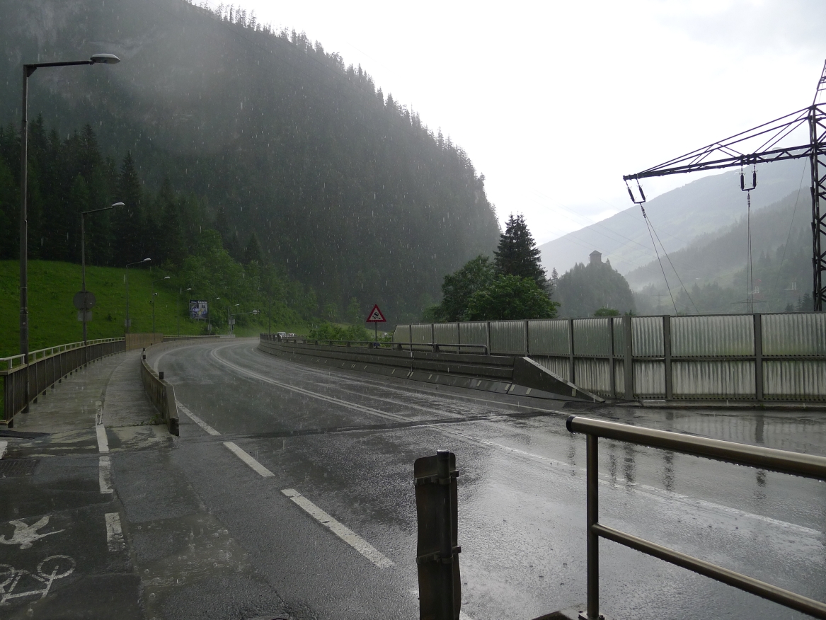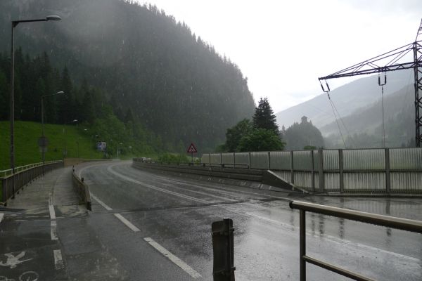 16:10 Uhr: kurz vor Bad Hofgastein zucken die ersten Blitze vom Himmel und Donnergrollen ist zu hören. Wir finden Unterstand vor einer Garagenanlage und warten auch diesen Regenschauer ab.