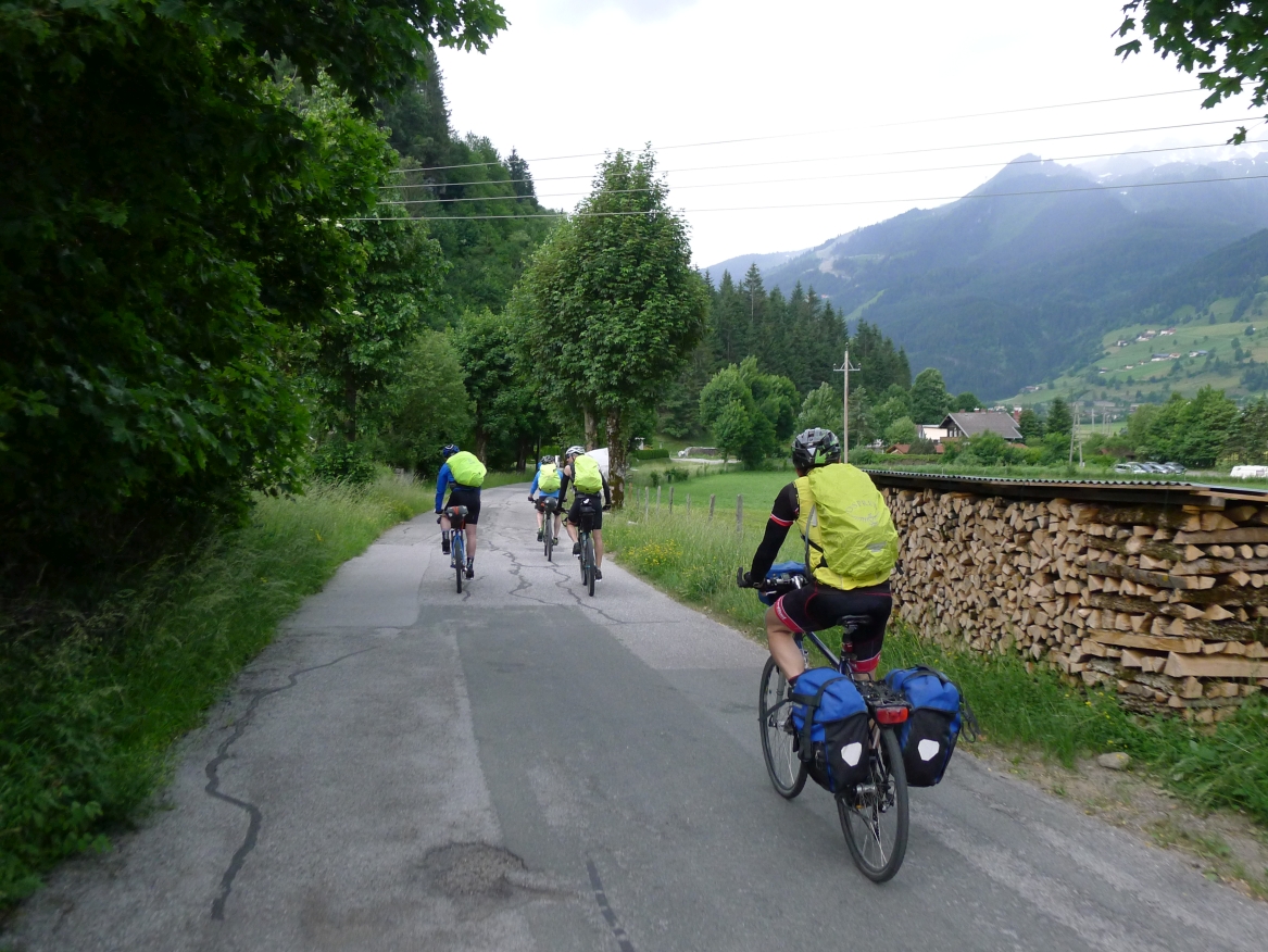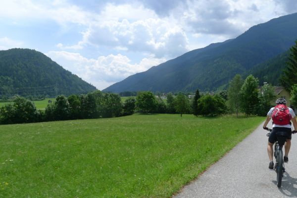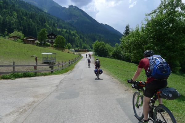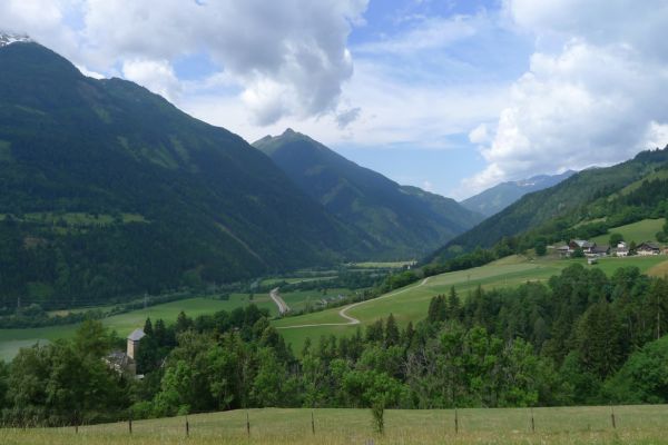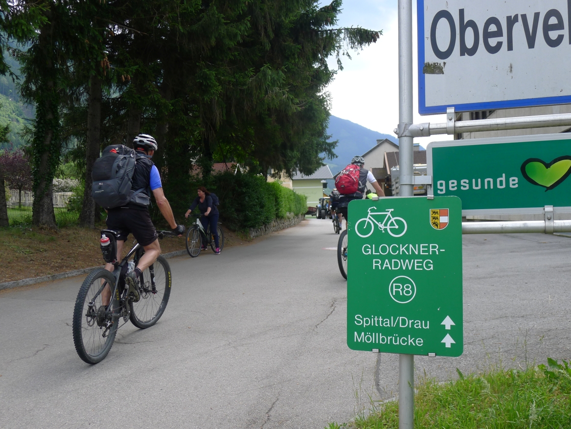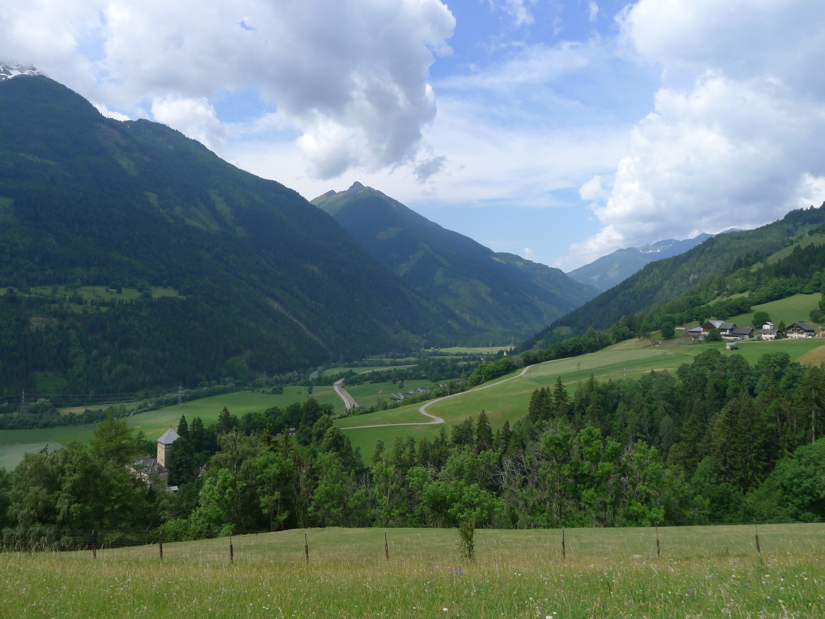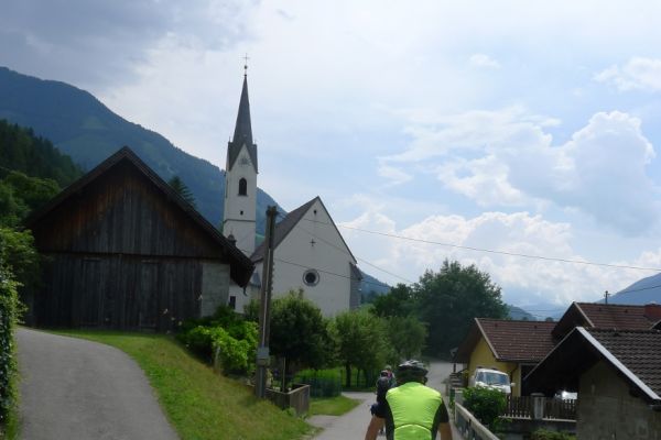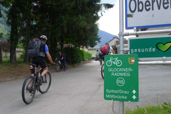 10:50 Uhr Ankunft in Mallnitz, die Räder werden wieder ausgeladen. Es folgt eine 8km lange kurvenreiche Abfahrt ins Tal nach Obervellach an der Möll. Wir folgen dem Fluss etwas abseits auf schönen Wegen durch Wiesen und vorbei an schmucken Bauernhöfen.