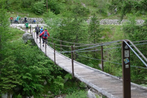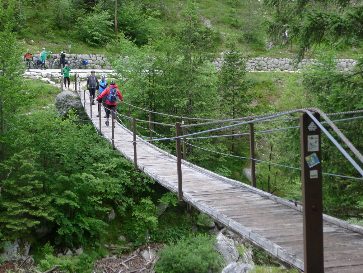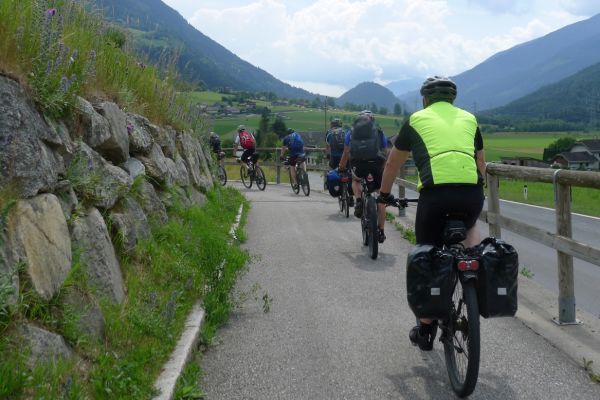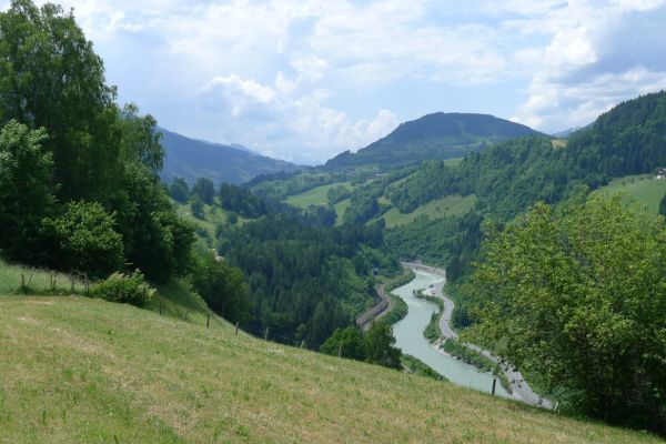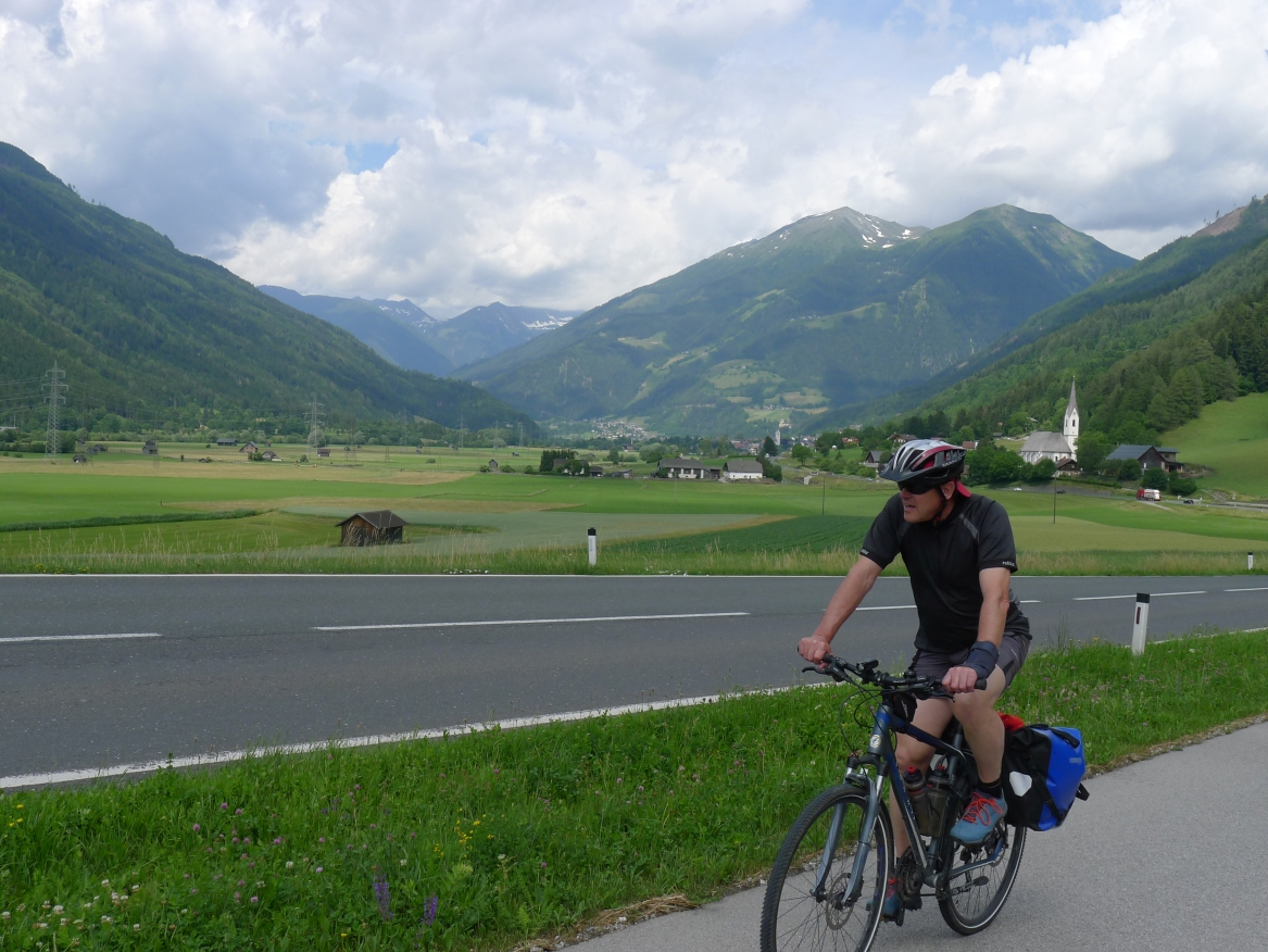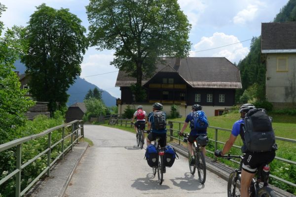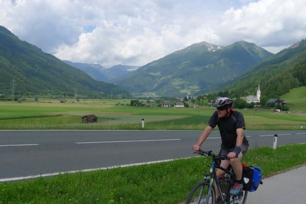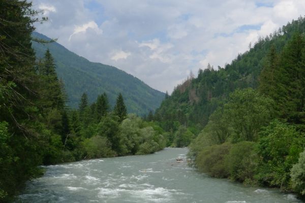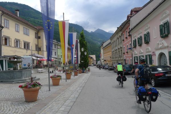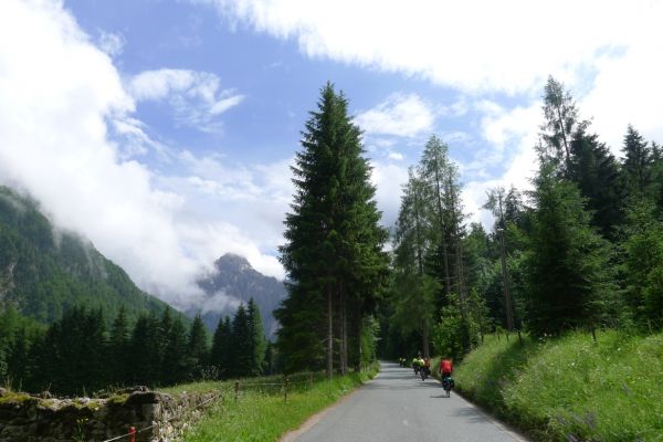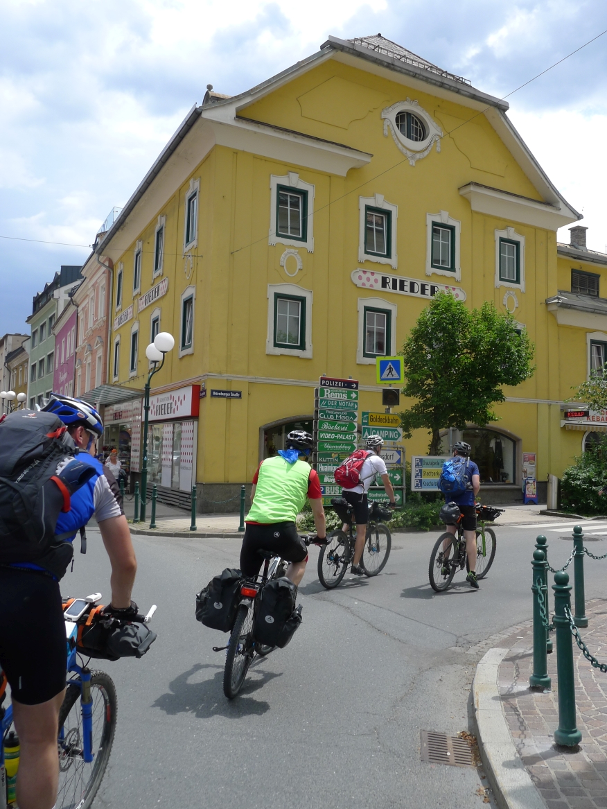 10:50 Uhr Ankunft in Mallnitz, die Räder werden wieder ausgeladen. Es folgt eine 8km lange kurvenreiche Abfahrt ins Tal nach Obervellach an der Möll. Wir folgen dem Fluss etwas abseits auf schönen Wegen durch Wiesen und vorbei an schmucken Bauernhöfen.