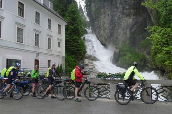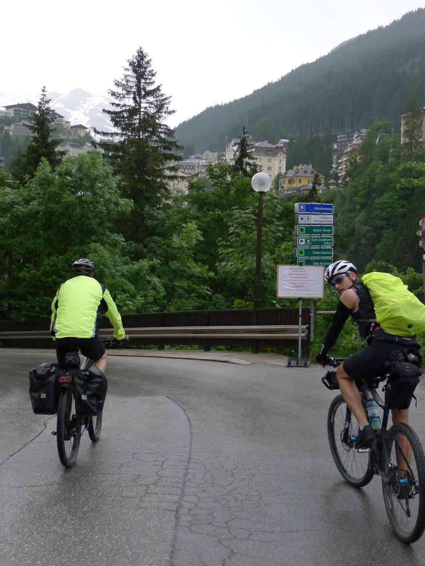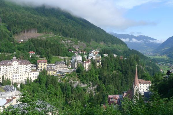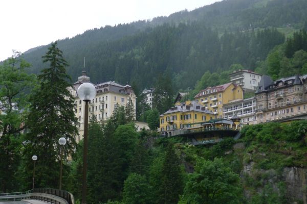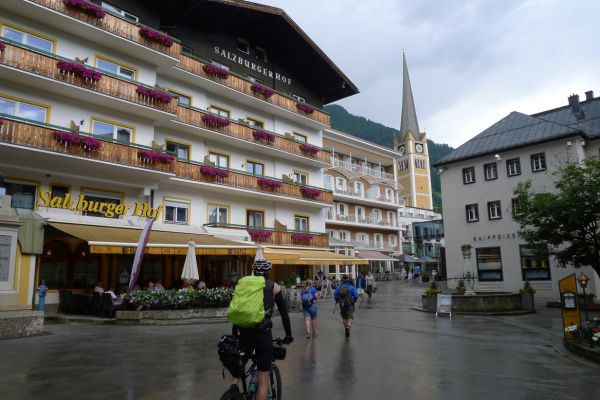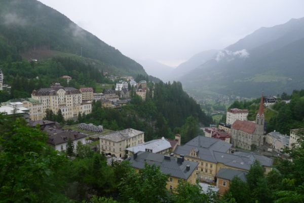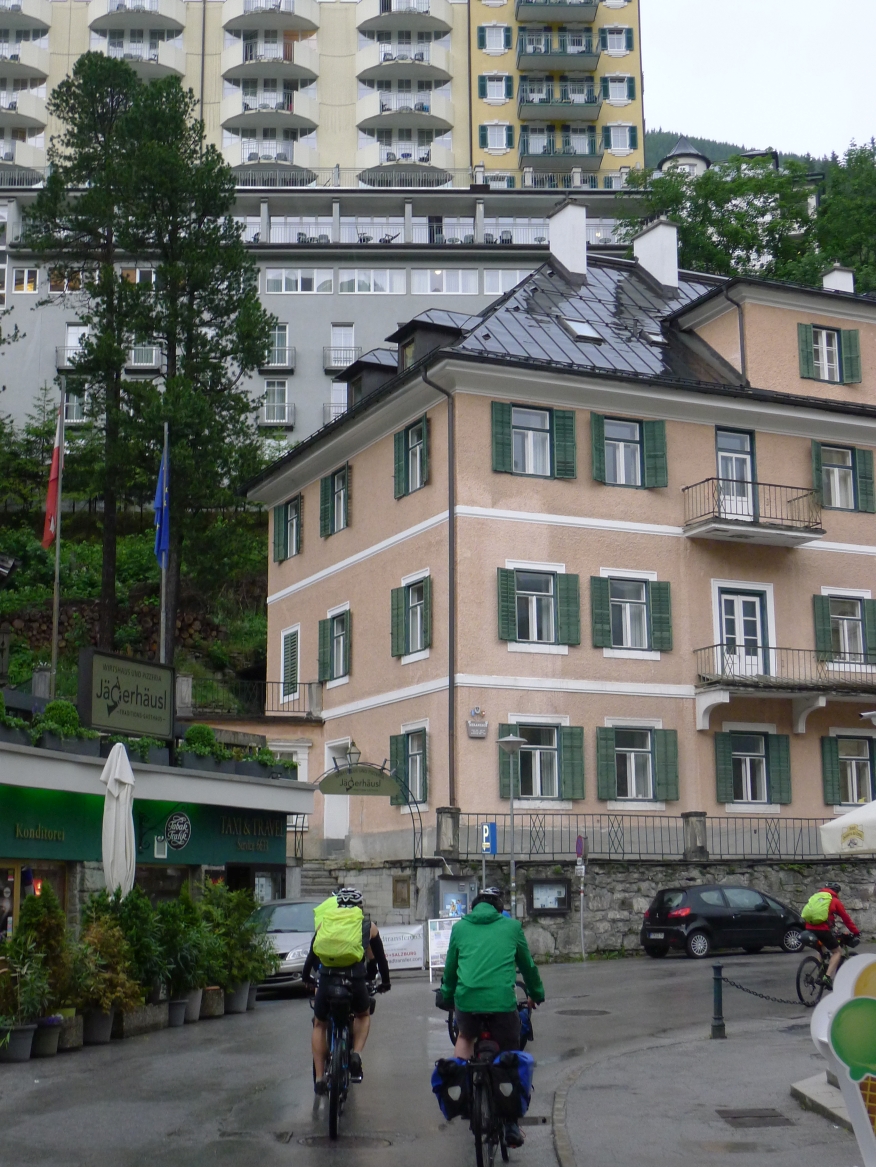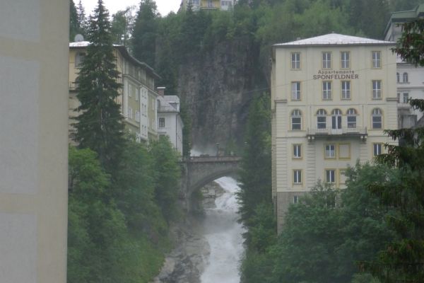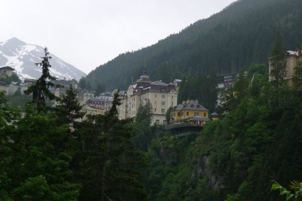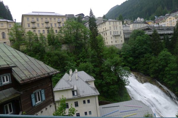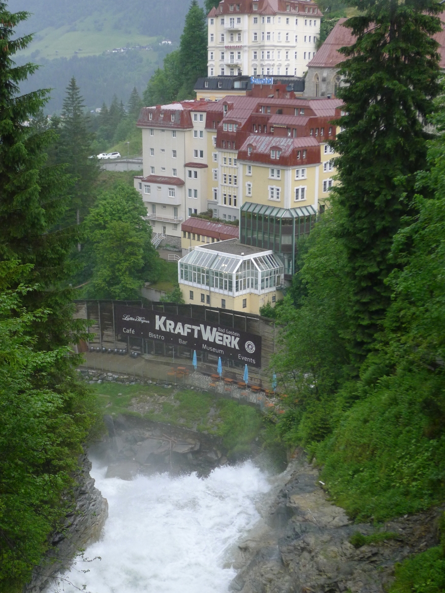 18:45 Uhr: nach einem 4km langen und teilweise sehr steilen Schlussanstieg erreichen wir das Hotel in Bad Gastein. Natürlich liegt es ganz oben auf dem Berg und zu regnen begonnen hat es auch wieder. So bleibt wenig Zeit und Muße für einen Blick auf die Hotels der Belle Époque, oder was von ihnen übriggeblieben ist. Lediglich am Wasserfall machen wir kurz halt und schauen den Wassermassen hinterher, wie sie mitten durch den Ort ins Tal stürzen.