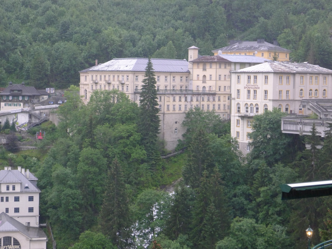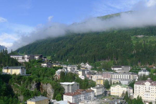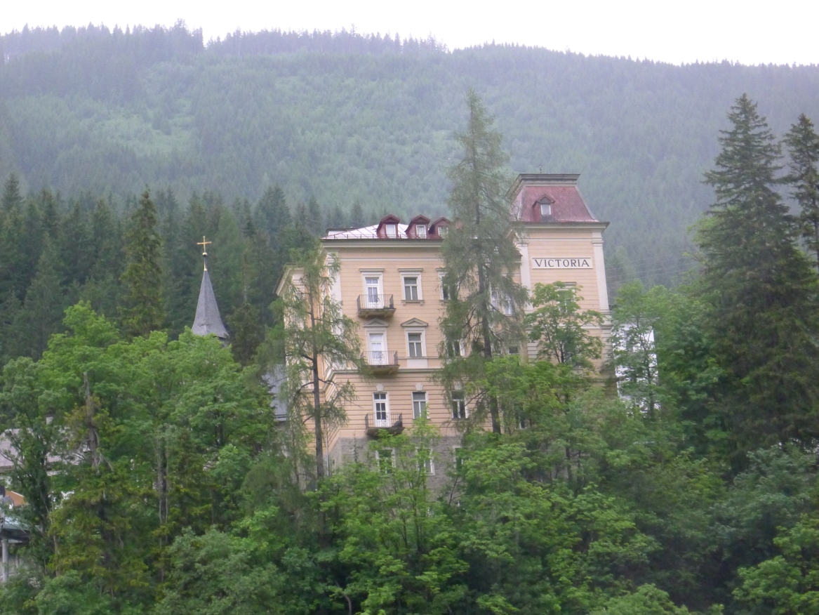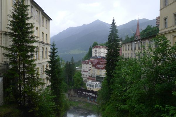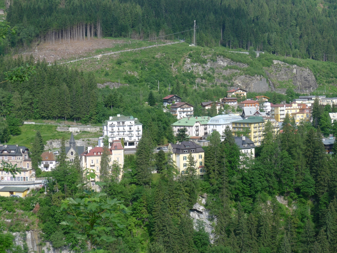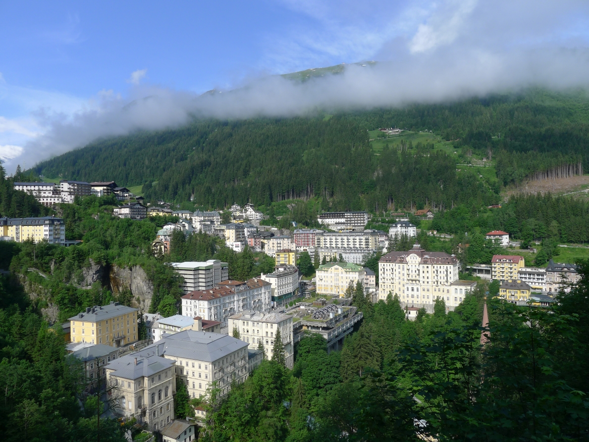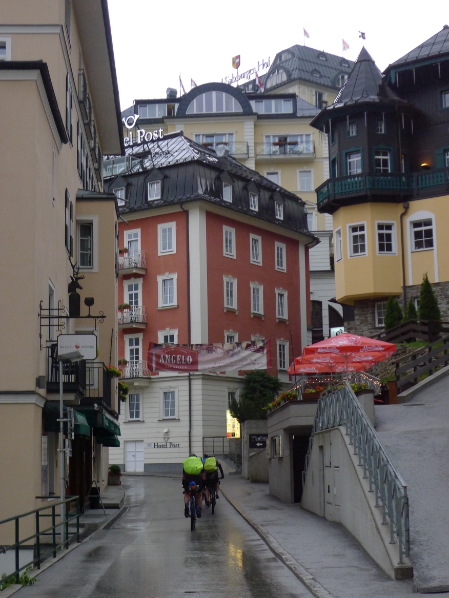 18:45 Uhr: nach einem 4km langen und teilweise sehr steilen Schlussanstieg erreichen wir das Hotel in Bad Gastein. Natürlich liegt es ganz oben auf dem Berg und zu regnen begonnen hat es auch wieder. So bleibt wenig Zeit und Muße für einen Blick auf die Hotels der Belle Époque, oder was von ihnen übriggeblieben ist. Lediglich am Wasserfall machen wir kurz halt und schauen den Wassermassen hinterher, wie sie mitten durch den Ort ins Tal stürzen.
