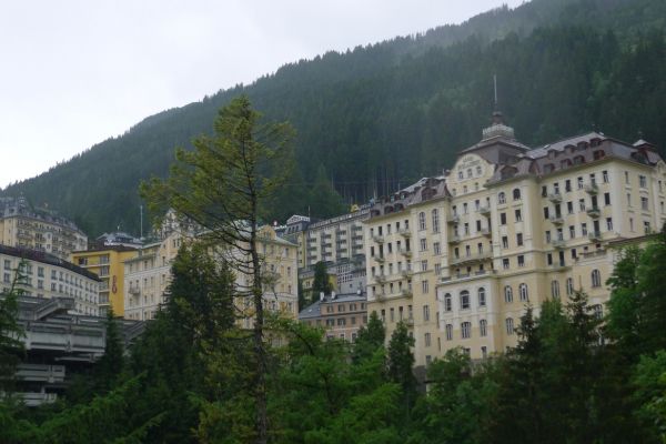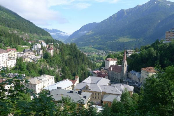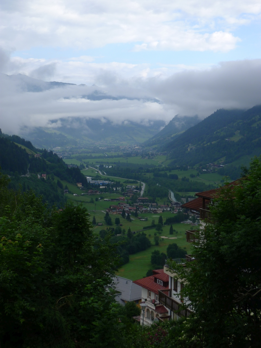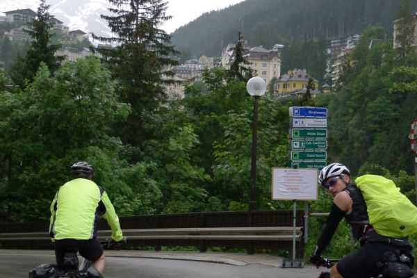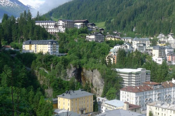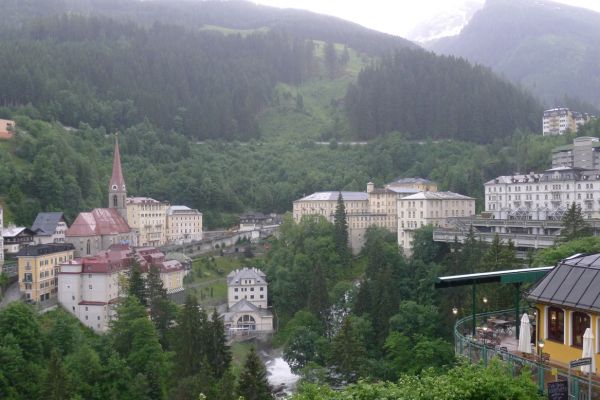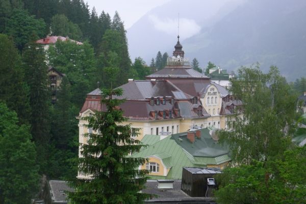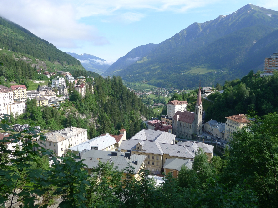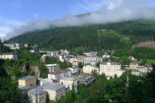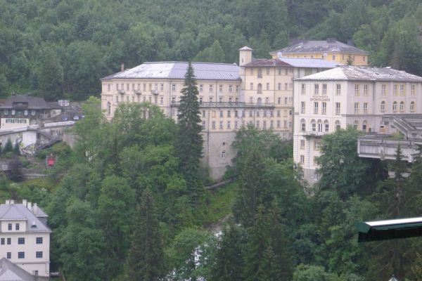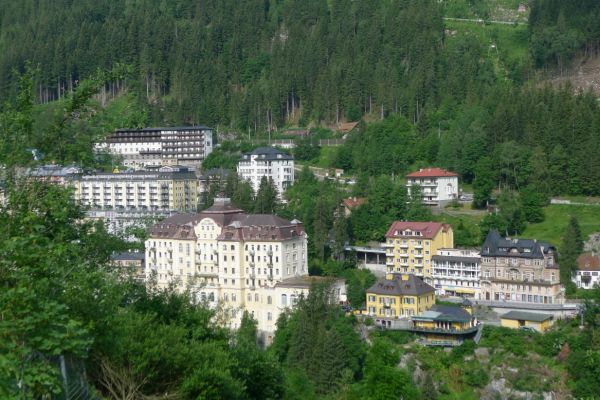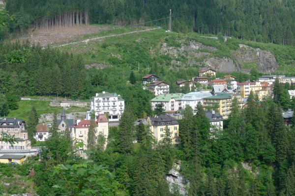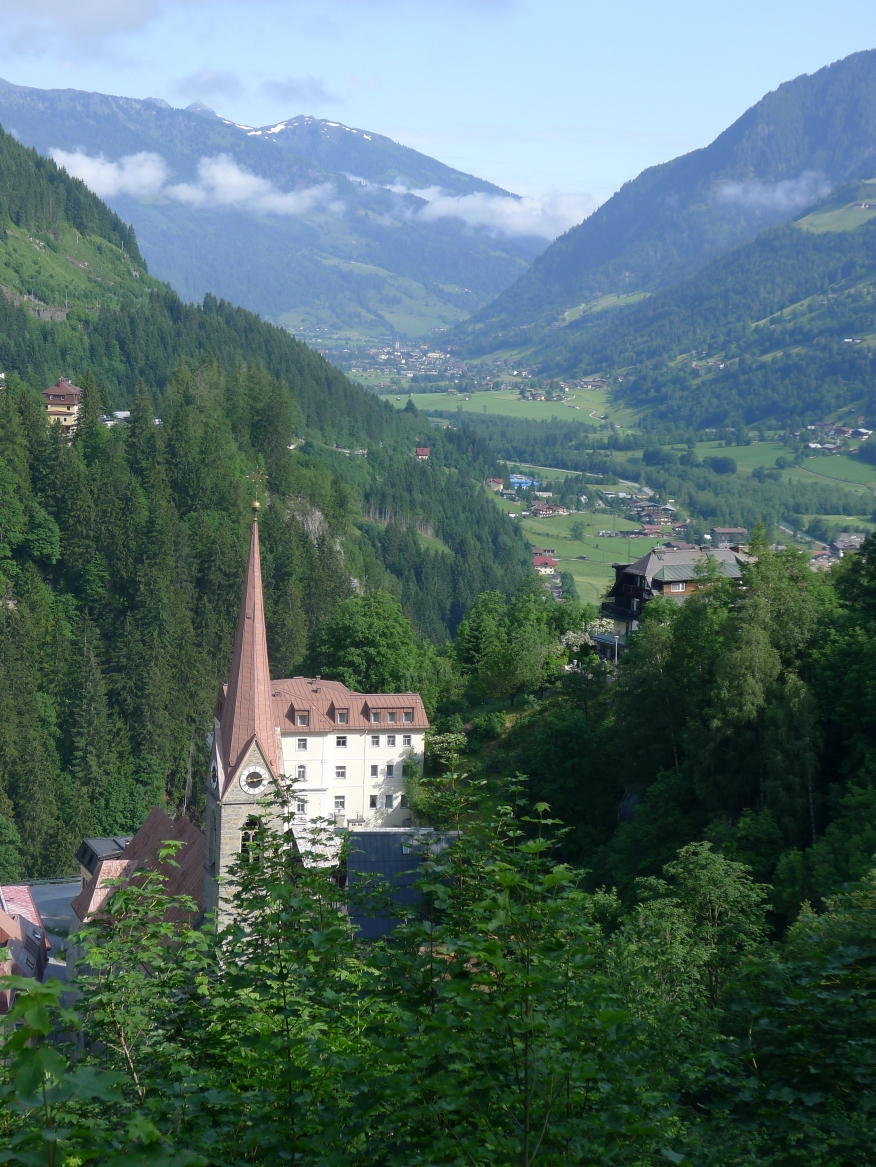 18:45 Uhr: nach einem 4km langen und teilweise sehr steilen Schlussanstieg erreichen wir das Hotel in Bad Gastein. Natürlich liegt es ganz oben auf dem Berg und zu regnen begonnen hat es auch wieder. So bleibt wenig Zeit und Muße für einen Blick auf die Hotels der Belle Époque, oder was von ihnen übriggeblieben ist. Lediglich am Wasserfall machen wir kurz halt und schauen den Wassermassen hinterher, wie sie mitten durch den Ort ins Tal stürzen.