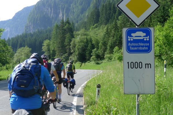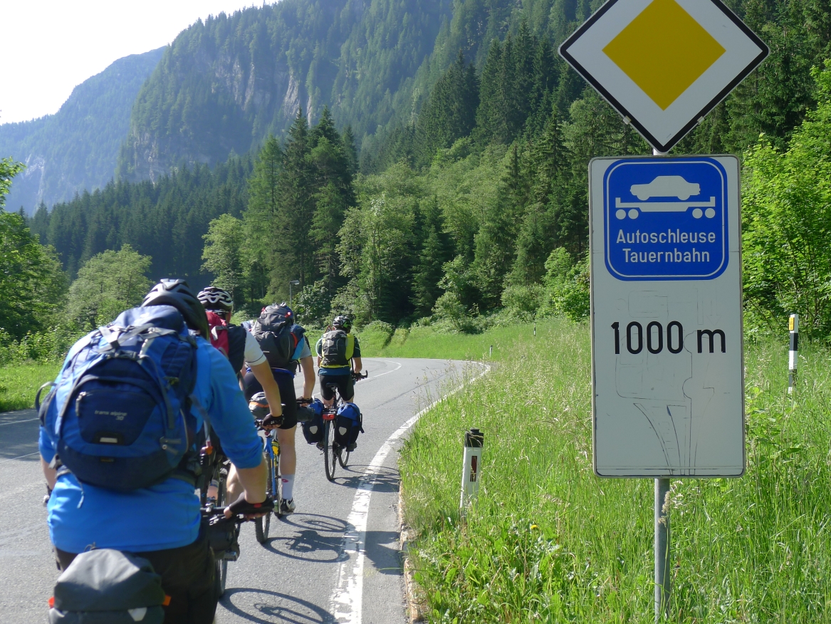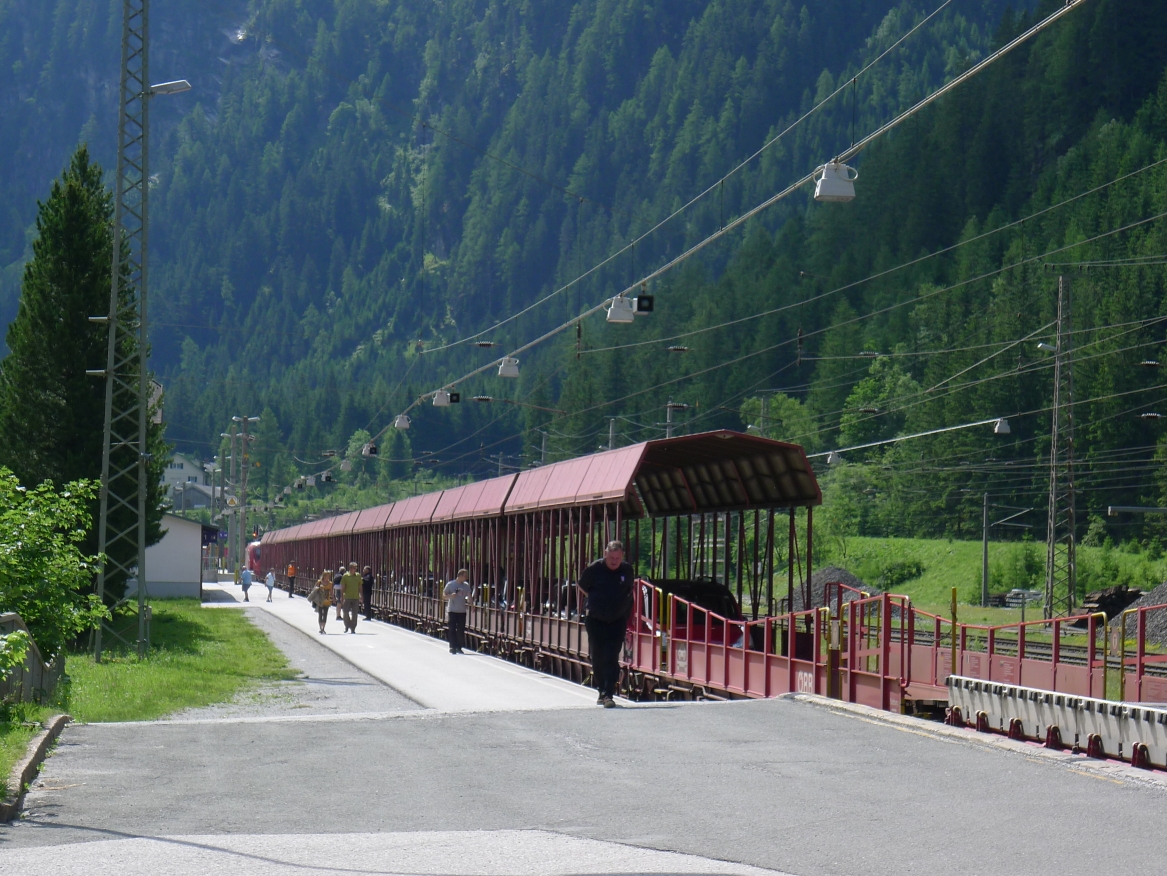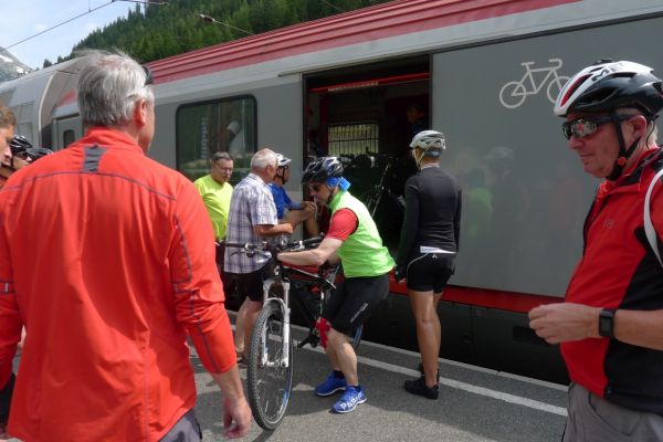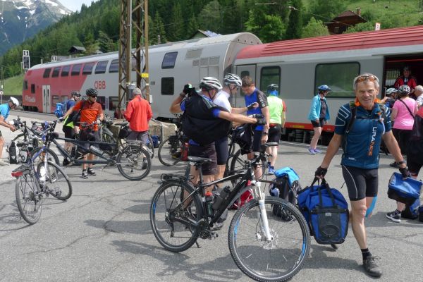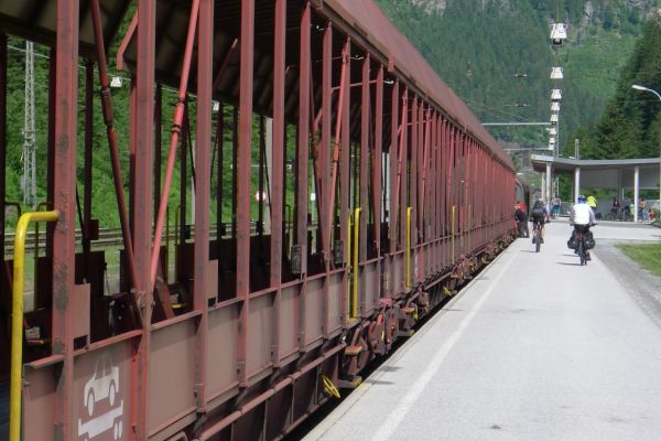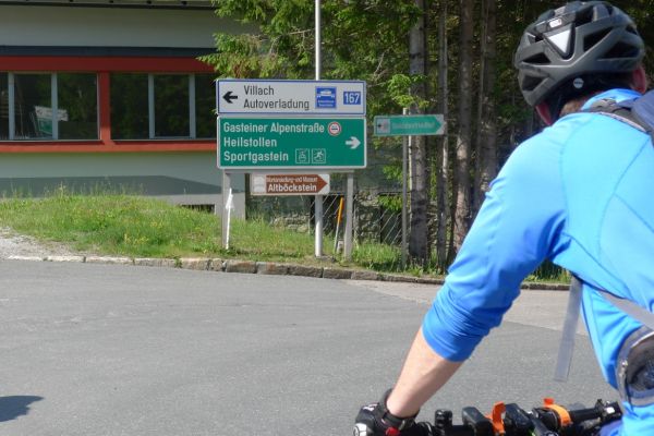 9:40 Uhr: Ankunft an der Verladestelle des Autozuges. Um uns die Zeit zu vertreiben, machen wir einen Abstecher zum Gasteiner Wasserfall. Wieder zurück an der Verladestelle treffen wir auf eine Radgruppe aus Steinau an der Straße, mit der wir bereits am Vortag beim Abendessen Bekanntschaft geschlossen haben. Überhaupt trifft man hier an diesem Nadelöhr jede Menge Radwanderer. Darunter auch ein Paar, das mit einem Trekking-Tandem unterwegs war und auf einer Abfahrt die unglaubliche Spitzengeschwindigkeit von 105km/h erreicht hat