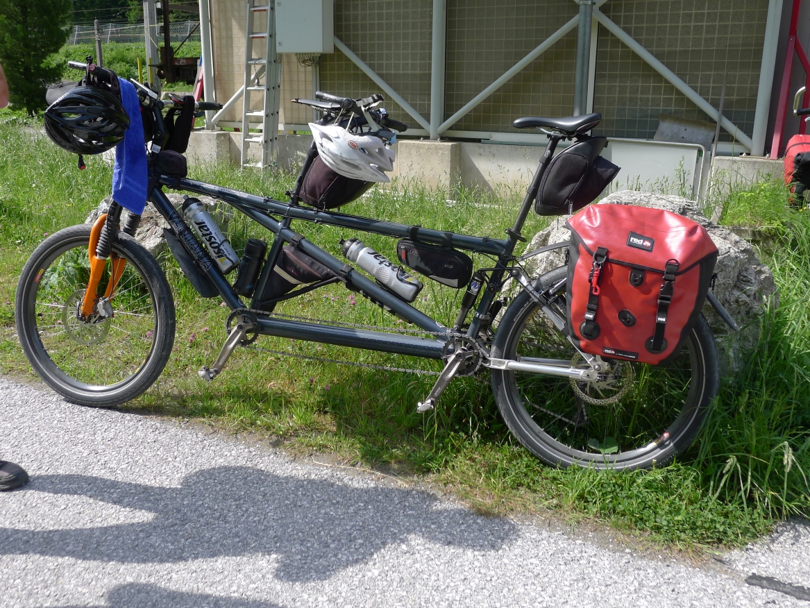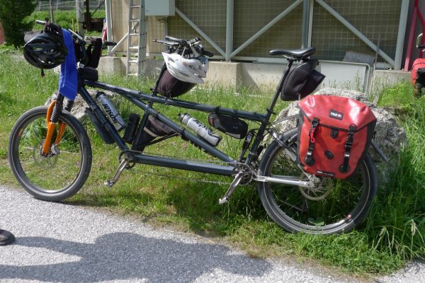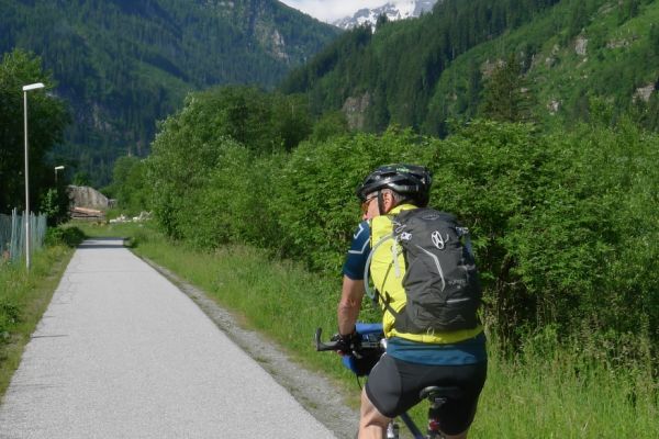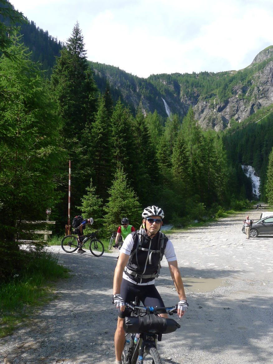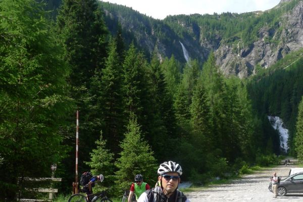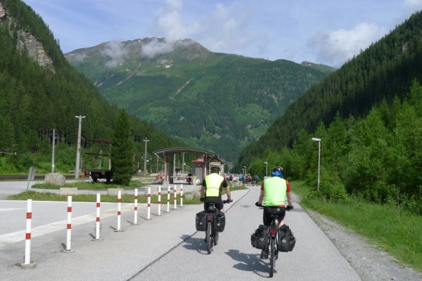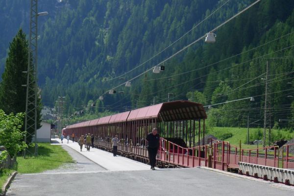 9:40 Uhr: Ankunft an der Verladestelle des Autozuges. Um uns die Zeit zu vertreiben, machen wir einen Abstecher zum Gasteiner Wasserfall. Wieder zurück an der Verladestelle treffen wir auf eine Radgruppe aus Steinau an der Straße, mit der wir bereits am Vortag beim Abendessen Bekanntschaft geschlossen haben. Überhaupt trifft man hier an diesem Nadelöhr jede Menge Radwanderer. Darunter auch ein Paar, das mit einem Trekking-Tandem unterwegs war und auf einer Abfahrt die unglaubliche Spitzengeschwindigkeit von 105km/h erreicht hat