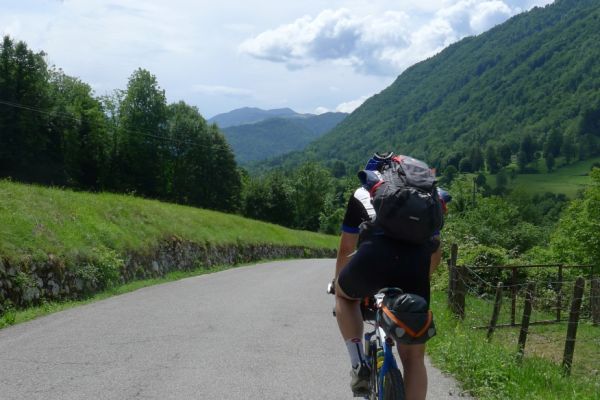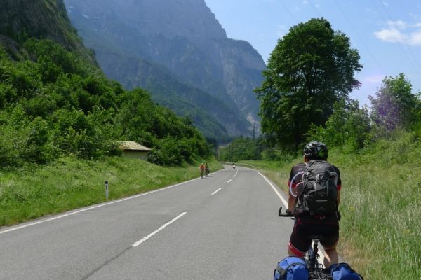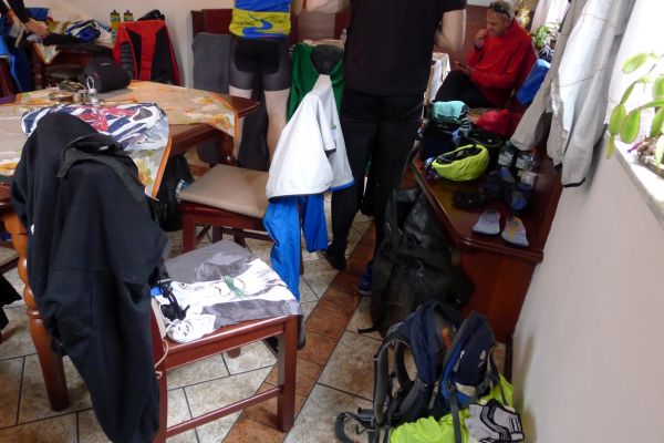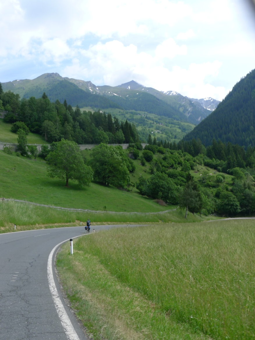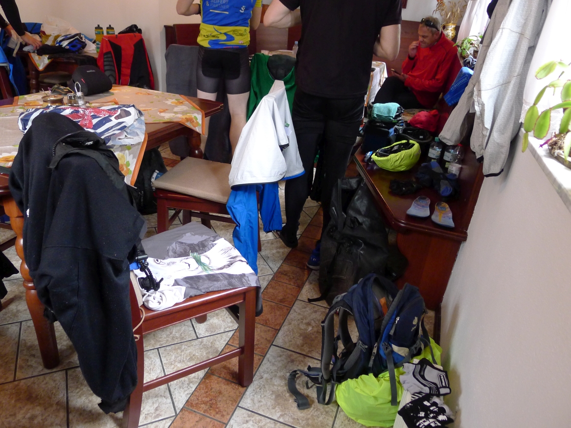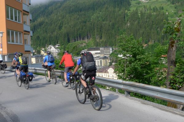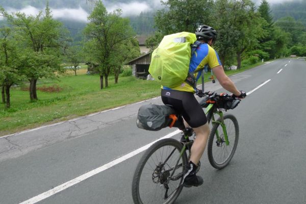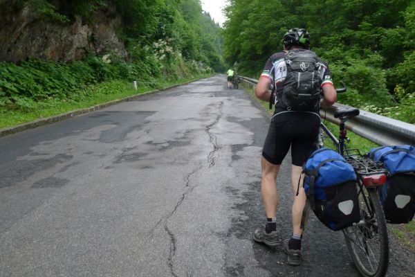8:47 Uhr: Start der 3.Etappe. wir schieben die Räder aus der Garage und stellen die Abfahrbereitschaft her, müssen aber noch 5 Minuten auf Lars warten, der in aller Seelenruhe sein Rad putzt…. Das Wetter ist trüb, die Wolken hängen tief und verdecken den Blick auf die umliegenden Berge, dazu ist die Luftfeuchtigkeit hoch. Schade, gerade diese Etappe sollte der landschaftliche Höhepunkt der Tour werden.