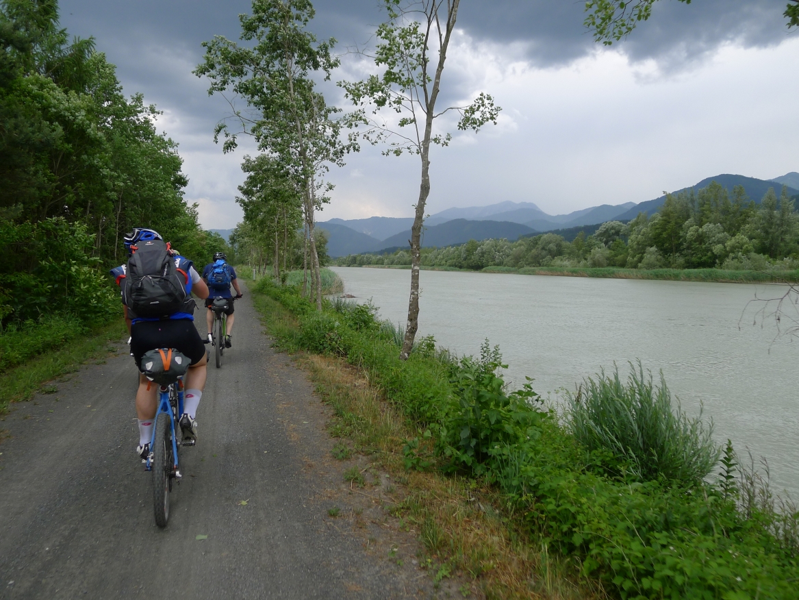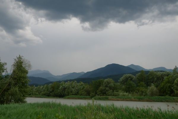 15:00 Uhr: wir brechen wieder auf, der Regenradar sagt uns einen 1-stüngigen regenfreien Korridor voraus, in dem wir Kilometer machen können. Der Weg führt immer an der Drau entlang und dank Rückenwind können wir ohne große Anstrengung das Tempo hoch halten und kommen gut voran. Allerdings wird es zunehmend dunkler um uns herum und wir steuern geradewegs in das nächste Gewitter hinein.