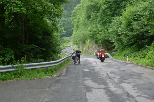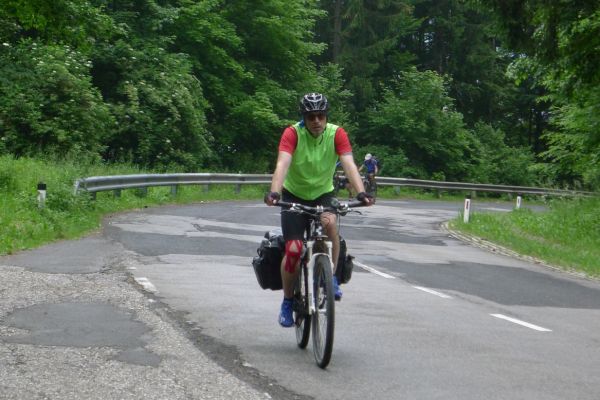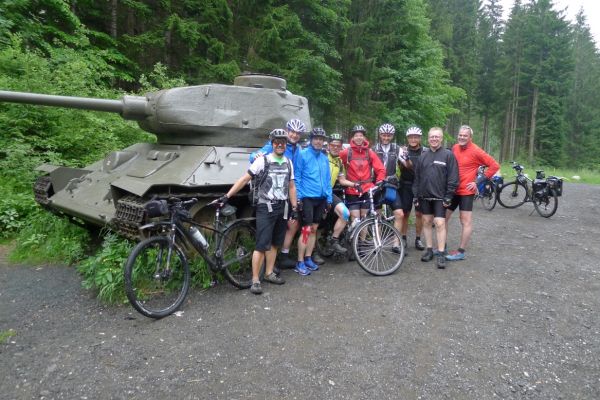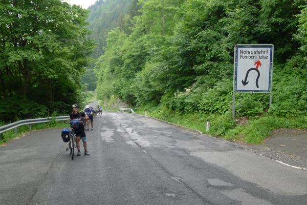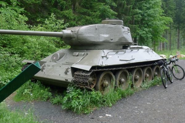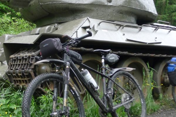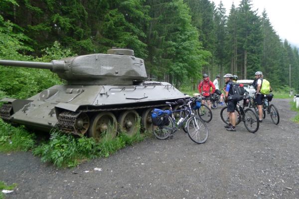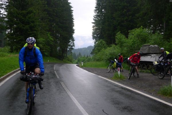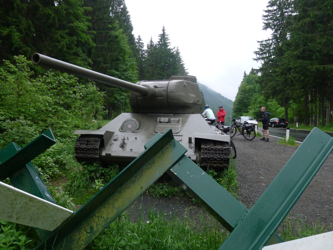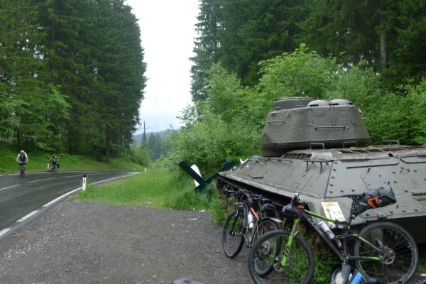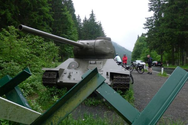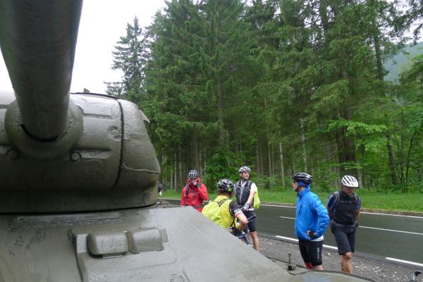 10:20 Uhr: Warnschilder mit „18% Steigung“ und „in den ersten Gang zurückschalten“ kommen in Sicht. Es ist steil, aber durchaus fahrbar. Geht doch denke ich mir, da höre ich von den vor mir fahrenden plötzlich Ausrufe wie „Ach Du Scheisse“ oder „Oh mein Gott“. Nach der nächsten Kurve weiß auch ich was gemeint ist….. Etwa 200m trete ich das kerzengerade steile Stück hoch, dann reihe auch ich mich in die Gruppe der Schiebenden mit ein. Unmöglich diese Steigung mit 10kg Gepäck auf dem Buckel hochzutreten….. Erst als es wieder flacher wird – flach heisßt in dem Fall etwa 12% - traue ich mich wieder aufs Rad. Nach einem Flachstück kommt nochmal eine steile (14%) Passage, die aber nur kurz ist. Als der T34 Panzer am Straßenrand in Sicht kommt ist der höchste Punkt erreicht. Während des Kalten Krieges wurden entlang der Straße starke Verteidigungsstellungen errichtet und mit Milizsoldaten bemannt. Dort wo heute zur Erinnerung der Panzer steht, hätte im Ernstfall der Abwehrkampf begonnen werden sollen. Auch die Sprengschächte, um den Übergang unpassierbar zu machen, sind noch zu sehen.