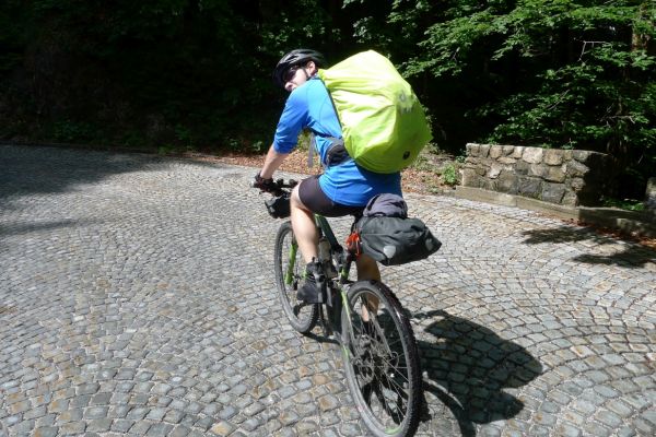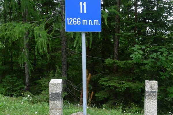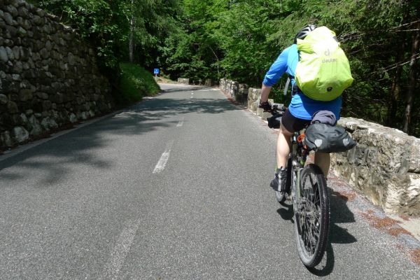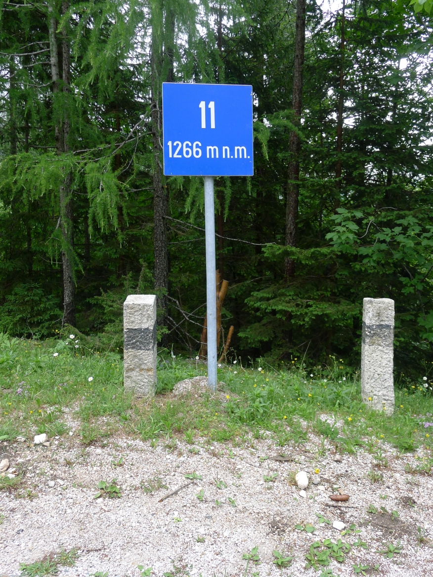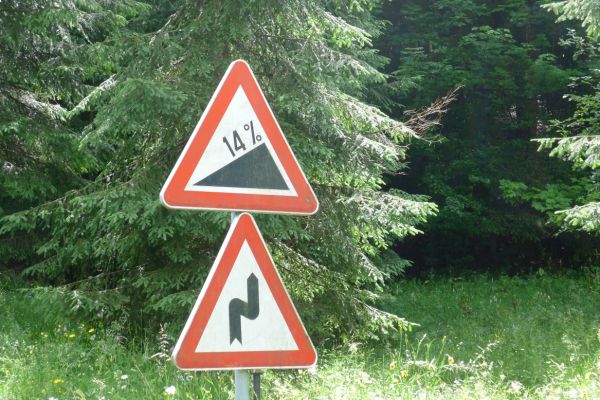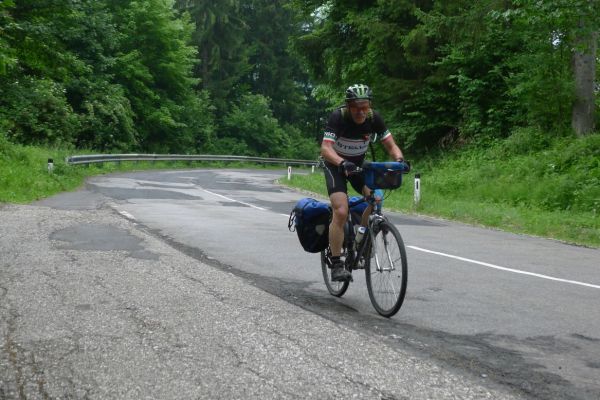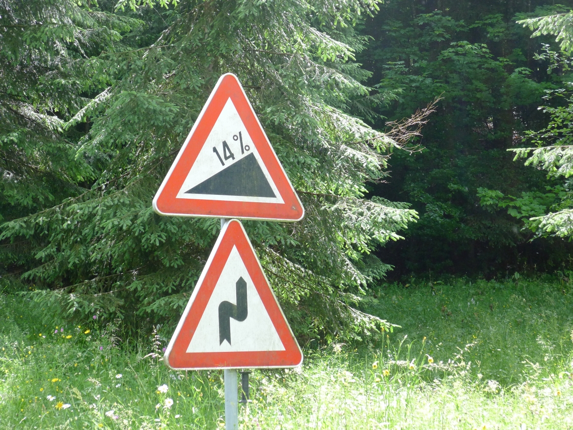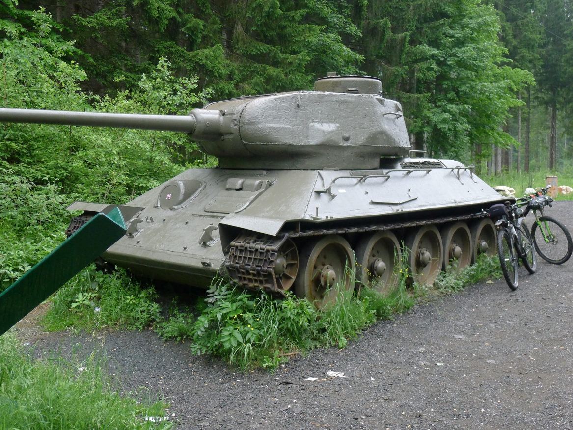 10:20 Uhr: Warnschilder mit „18% Steigung“ und „in den ersten Gang zurückschalten“ kommen in Sicht. Es ist steil, aber durchaus fahrbar. Geht doch denke ich mir, da höre ich von den vor mir fahrenden plötzlich Ausrufe wie „Ach Du Scheisse“ oder „Oh mein Gott“. Nach der nächsten Kurve weiß auch ich was gemeint ist….. Etwa 200m trete ich das kerzengerade steile Stück hoch, dann reihe auch ich mich in die Gruppe der Schiebenden mit ein. Unmöglich diese Steigung mit 10kg Gepäck auf dem Buckel hochzutreten….. Erst als es wieder flacher wird – flach heisßt in dem Fall etwa 12% - traue ich mich wieder aufs Rad. Nach einem Flachstück kommt nochmal eine steile (14%) Passage, die aber nur kurz ist. Als der T34 Panzer am Straßenrand in Sicht kommt ist der höchste Punkt erreicht. Während des Kalten Krieges wurden entlang der Straße starke Verteidigungsstellungen errichtet und mit Milizsoldaten bemannt. Dort wo heute zur Erinnerung der Panzer steht, hätte im Ernstfall der Abwehrkampf begonnen werden sollen. Auch die Sprengschächte, um den Übergang unpassierbar zu machen, sind noch zu sehen.
