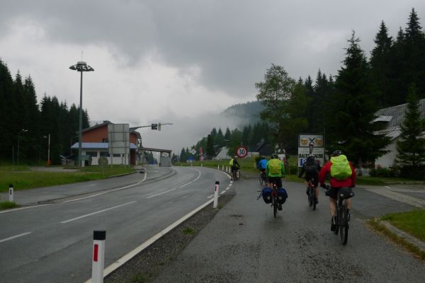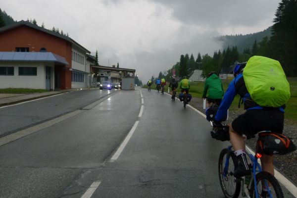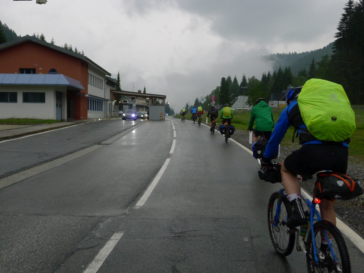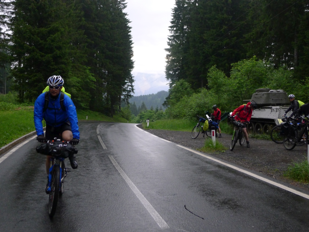 11:15 Uhr: Nach dem „Selfie of the day“ und weiteren Gruppenfotos mit Panzer und Schild an der Passhöhe, geht es im Nieselregen auf die Abfahrt. Etwa 500m später passieren wir die Grenze nach Slowenien. Auf der Südseite im Dorf Podkoren (auf deutsch „Wurzen“), das dem Übergang seinen Namen gab, fängt es stärker an zu regnen. Wir beeilen uns nach Kranjska Gora zu kommen, um dort die Mittagspause einzulegen. Kurze Zeit später holt uns aber ein Gewitter ein.