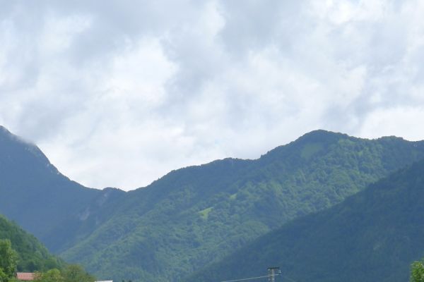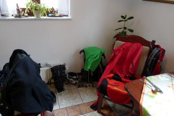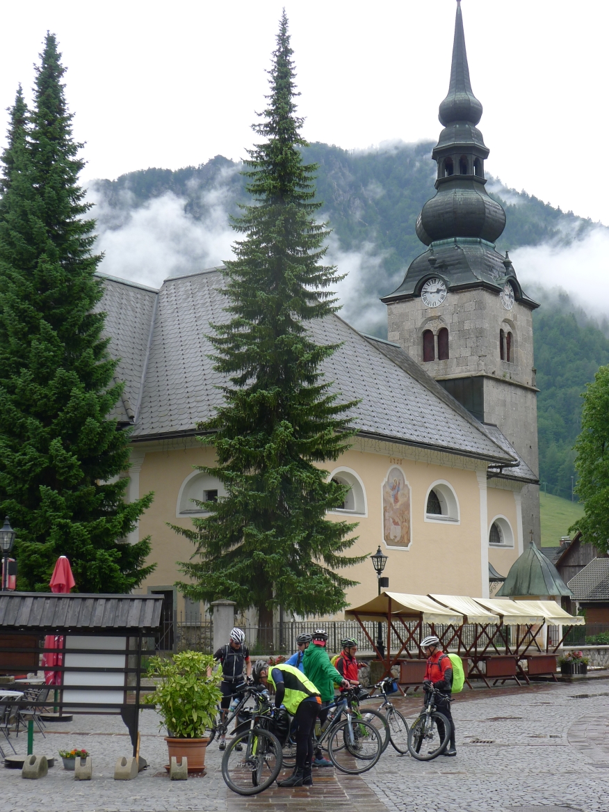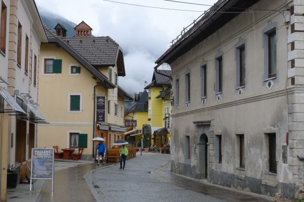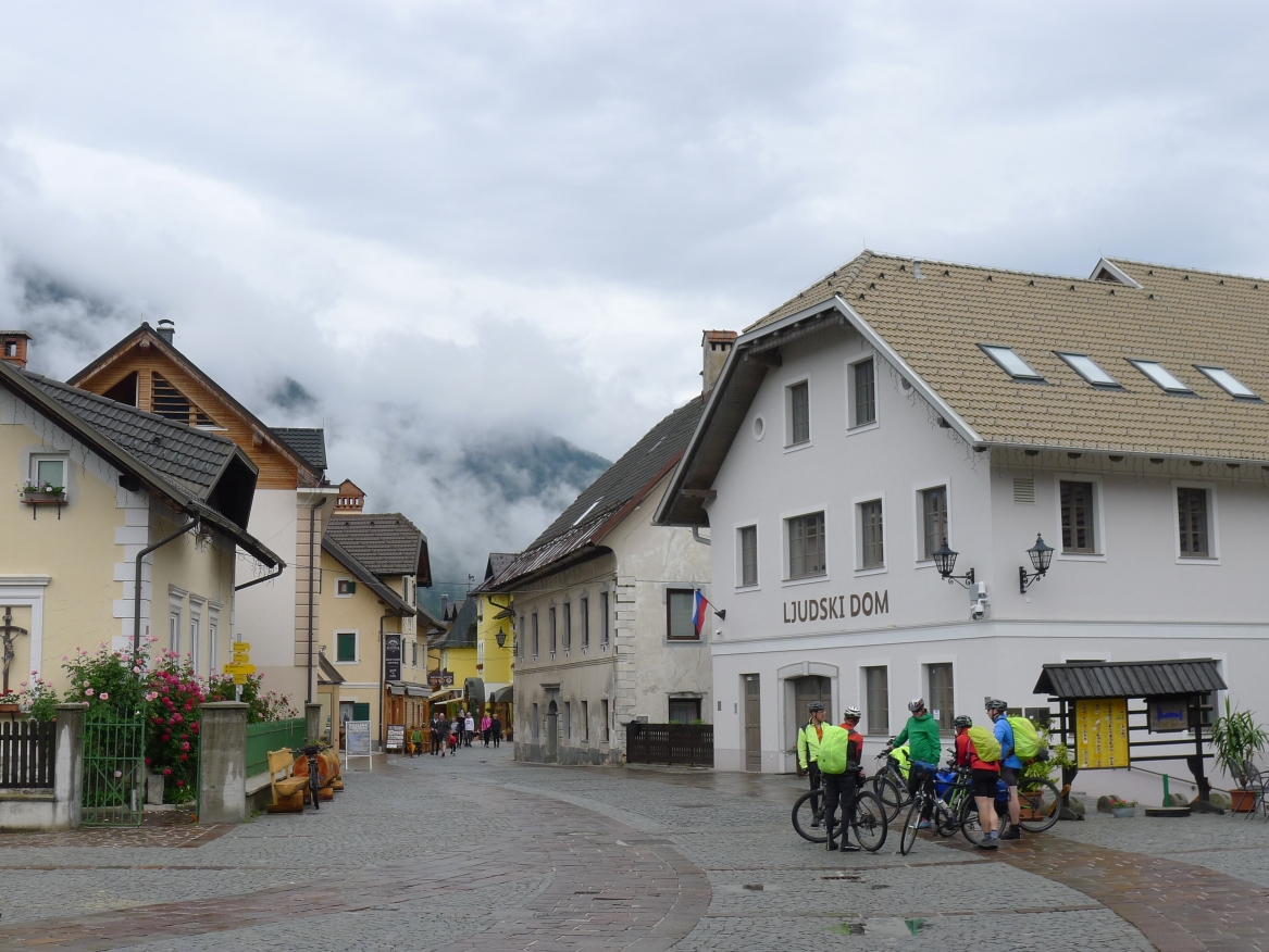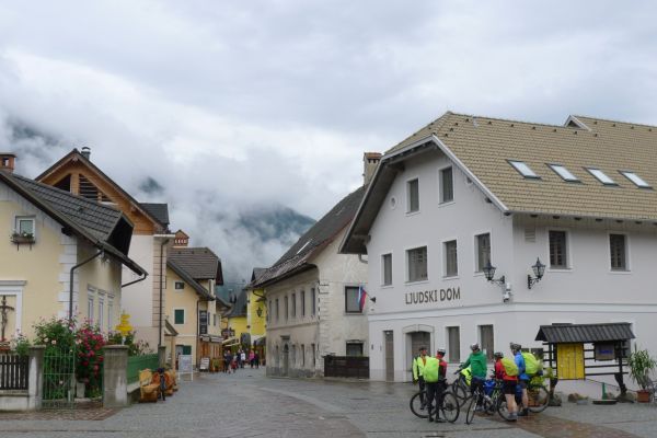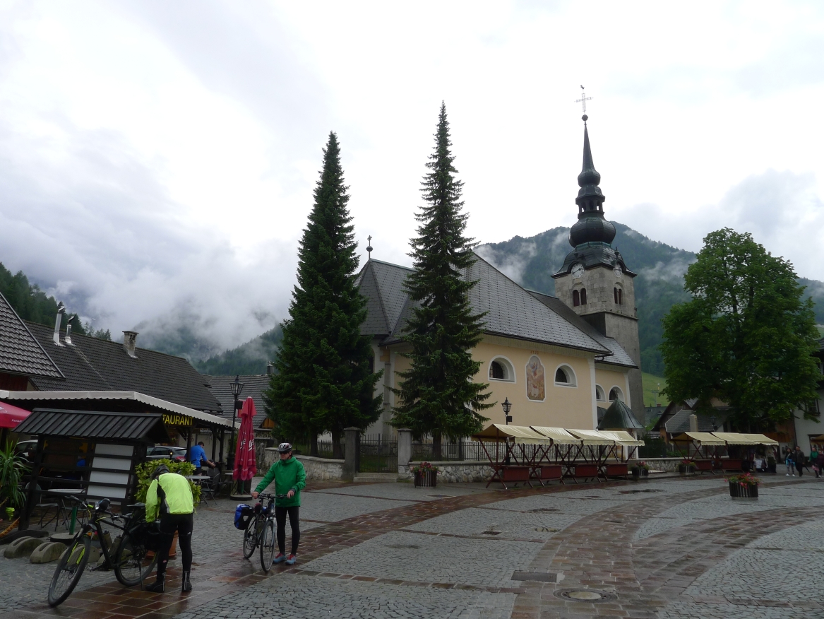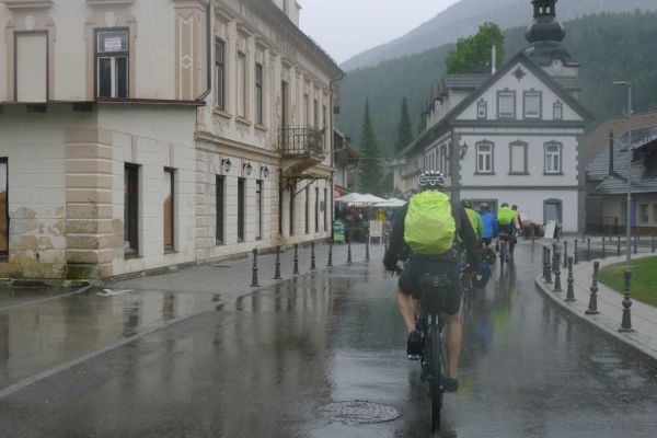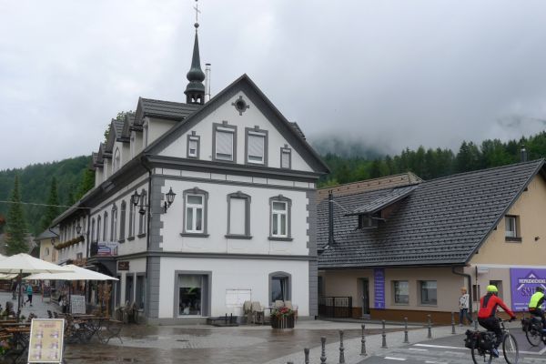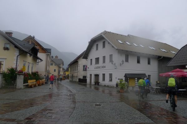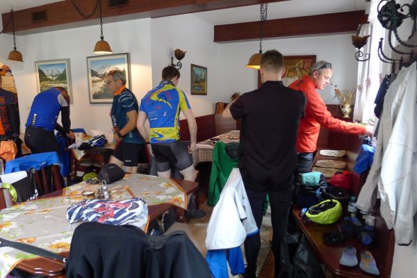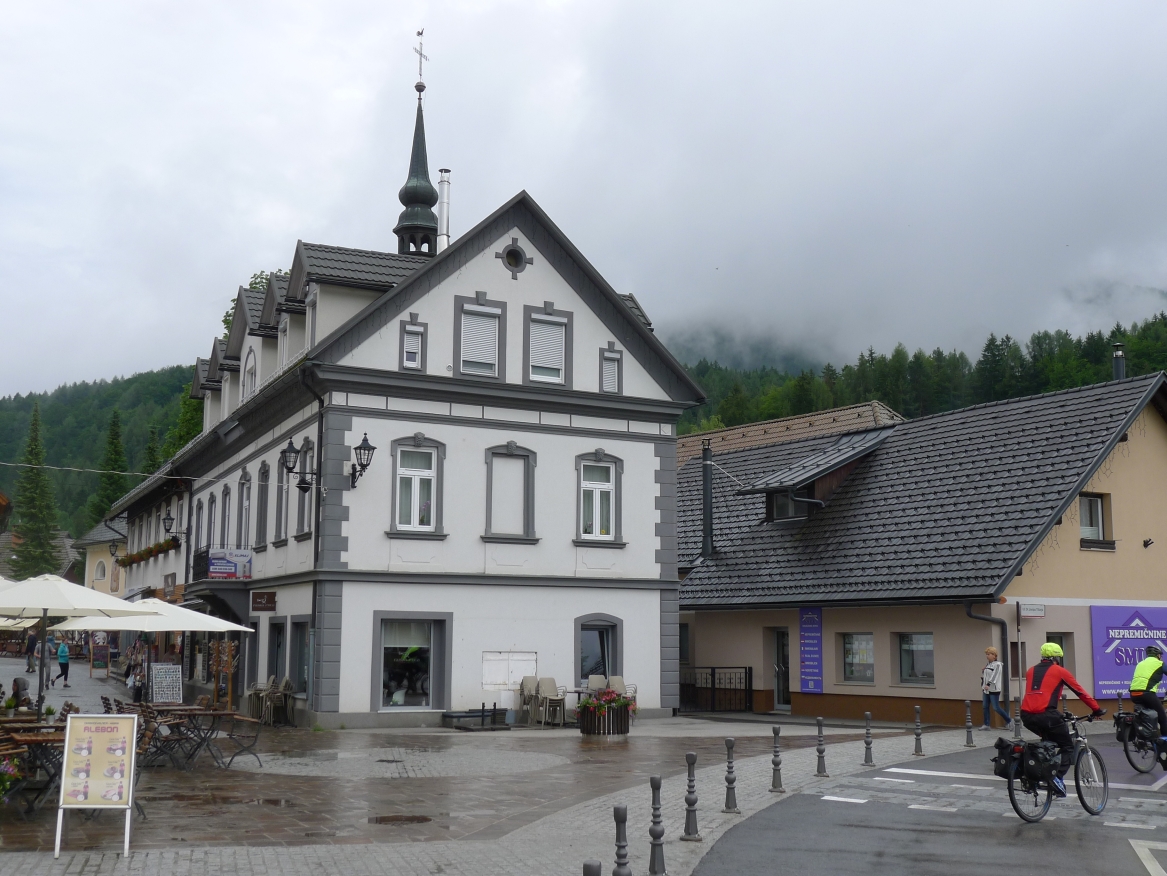 11:40 Uhr: im Gewitterregen erreichen wir den Wintersportort Kranjska Gora und steuern ein Lokal an. Wir sind kalt gefroren und komplett durchnässt, sowohl von innen durch die schweißtreibende Auffahrt, wie auch von außen durch den Regen und beginnen unsere nassen Sachen in der Gaststube zum Trocknen aufzuhängen. Der Wirt unternimmt noch einen verzweifelten Versuch, dass nicht sein ganzes Lokal zur Trockenstube umfunktioniert wird, muss sich letztlich aber seinem Schicksal ergeben. Zu viele Stillleben sind bereits entstanden: Radhosen, die sich von einem Tischende zum anderen spannen, Socken, Trikots und Unterziehshirts die kunstvoll auf Stühlen drapiert wurden…. Mit einem entsprechend hohen Trinkgeld entschuldigen wir uns später für das angerichtete Chaos. Und durch die Karte futtern wir uns auch, Tee, Kaffee, Suppe zum Aufwärmen, Pasta um zu Kräften zu kommen und Apfelstrudel damit sich wieder Glücksgefühle einstellen….