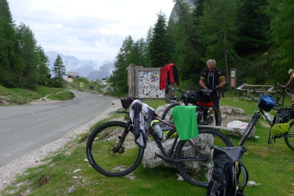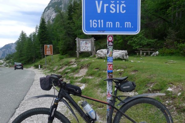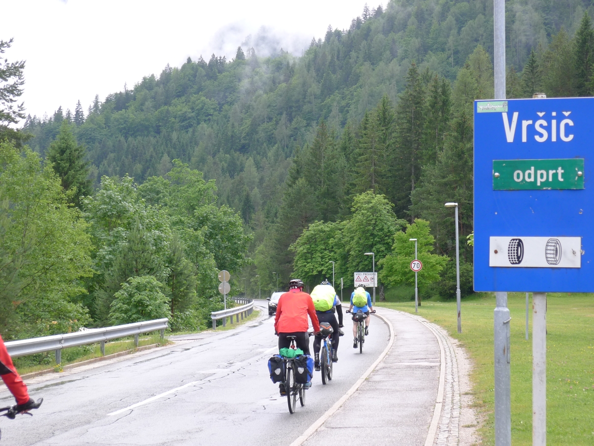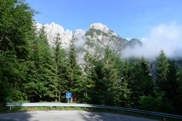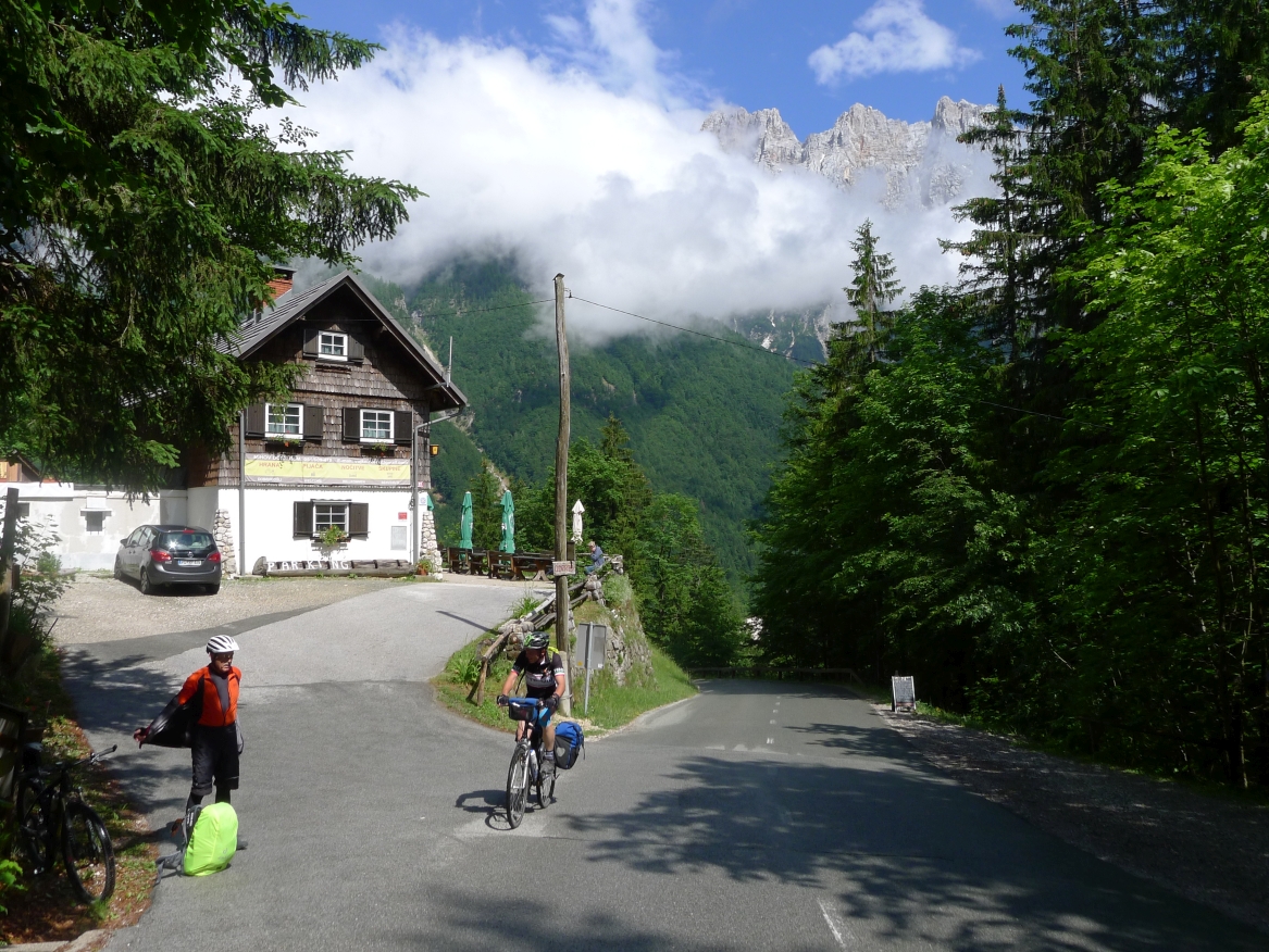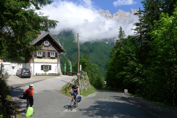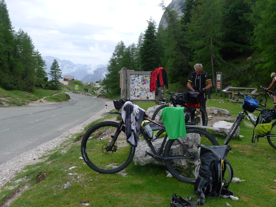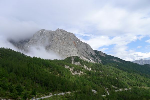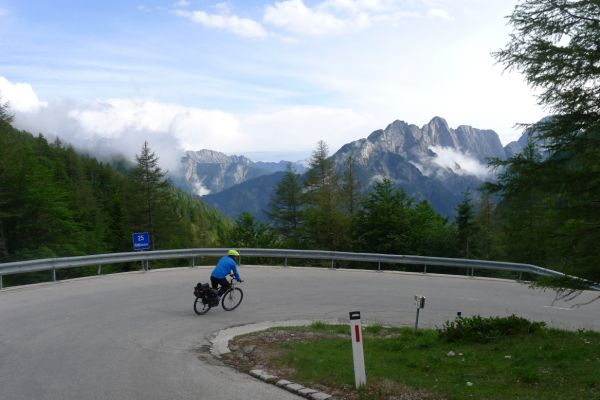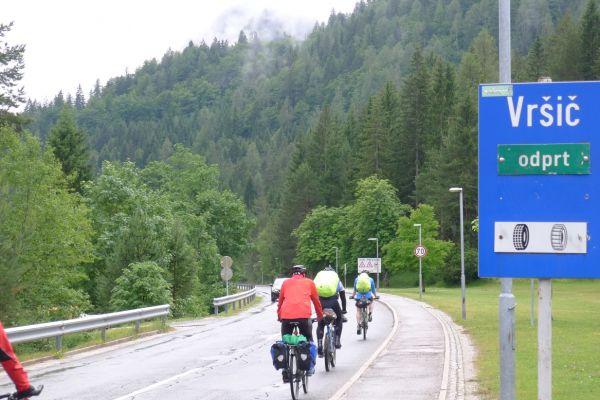 14:50 Uhr: der Regen hat tatsächlich aufgehöhrt und wir bepacken wieder die Räder. 45 km und mit dem Vršič -Paß (1611m) das Dach der diesjährigen Tour haben wir noch vor uns. Petrus meint es gut, auf den ersten Kilometern nach Kranjska Gora reißt der Himmel auf, der Jazna See glitzert grün in der Sonne und der Blick auf die Gipfel des Triglav Nationalparks wird frei. Wir sind am Einstieg zum Vršič Pass, dem höchsten asphaltierten Gebirgspaß Sloweniens. Auf 10km schraubt sich die Straße, die in den Jahren 1914 bis 1916 als Militärstraße von russischen Gefangenen ins Isonzo-Tal gebaut wurde, über 24 Serpentinen 750 Höhenmeter nach oben.