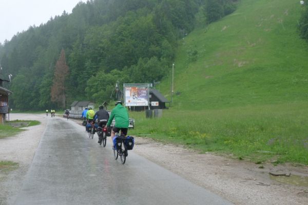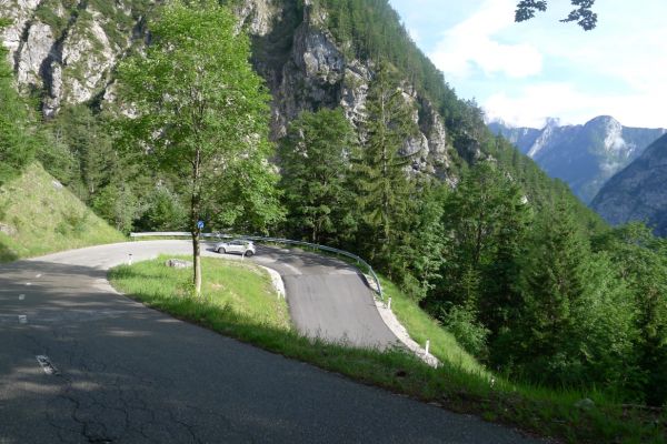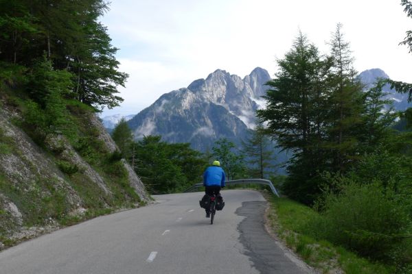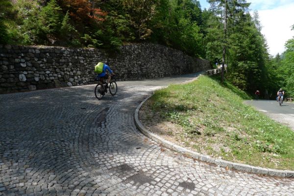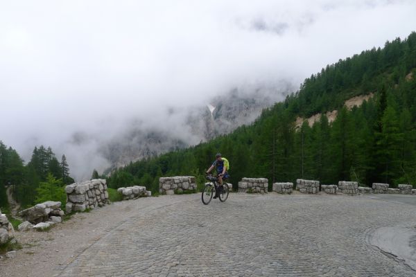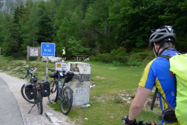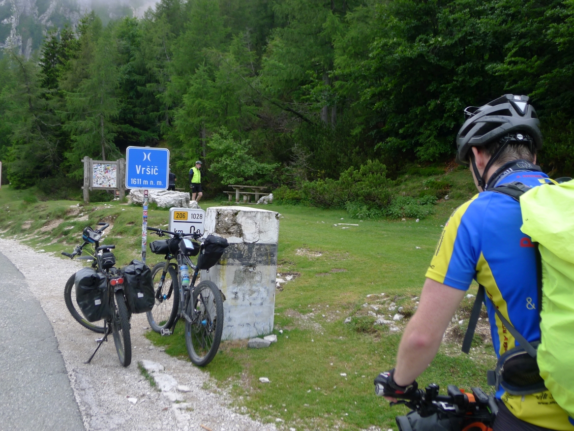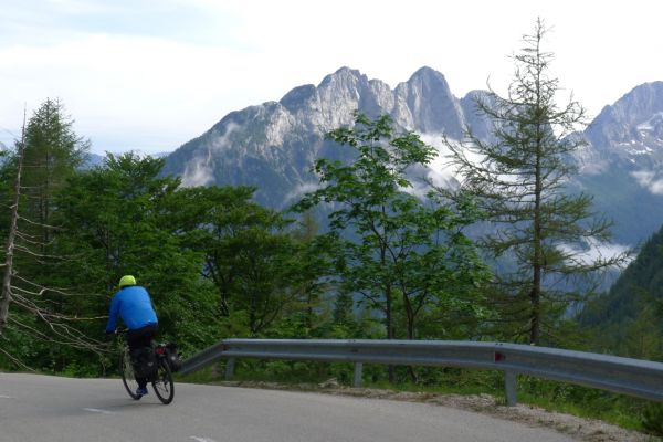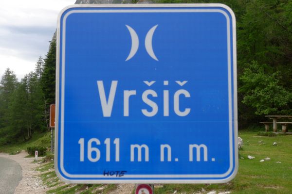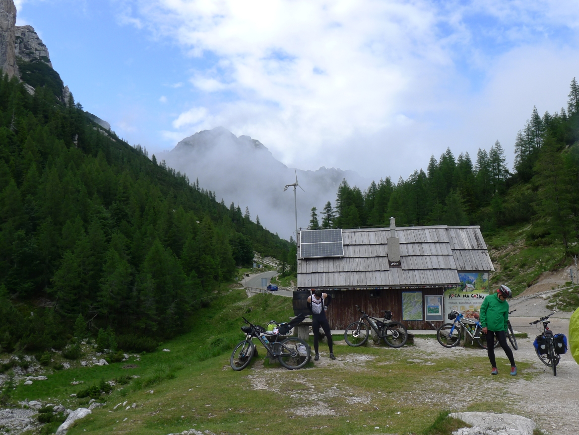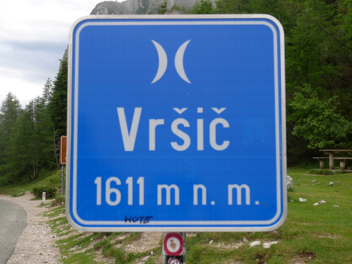 14:50 Uhr: der Regen hat tatsächlich aufgehöhrt und wir bepacken wieder die Räder. 45 km und mit dem Vršič -Paß (1611m) das Dach der diesjährigen Tour haben wir noch vor uns. Petrus meint es gut, auf den ersten Kilometern nach Kranjska Gora reißt der Himmel auf, der Jazna See glitzert grün in der Sonne und der Blick auf die Gipfel des Triglav Nationalparks wird frei. Wir sind am Einstieg zum Vršič Pass, dem höchsten asphaltierten Gebirgspaß Sloweniens. Auf 10km schraubt sich die Straße, die in den Jahren 1914 bis 1916 als Militärstraße von russischen Gefangenen ins Isonzo-Tal gebaut wurde, über 24 Serpentinen 750 Höhenmeter nach oben.