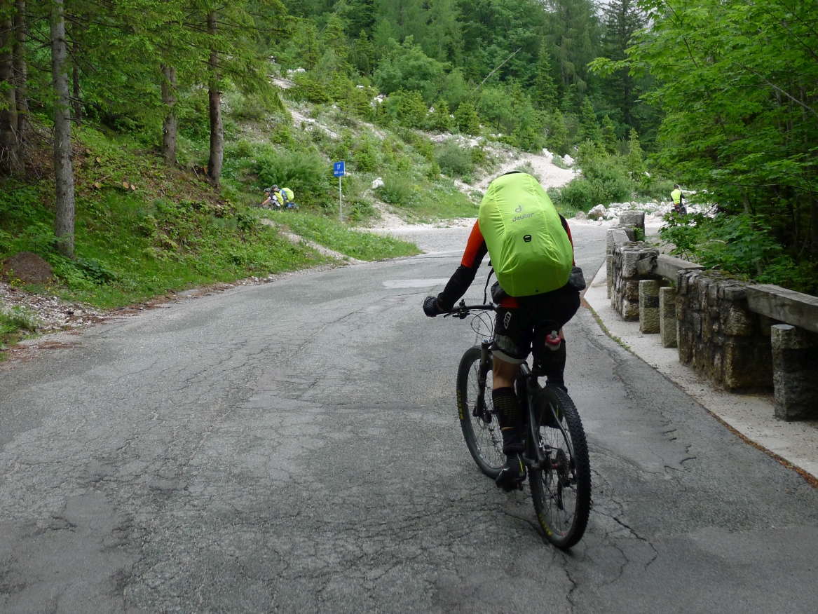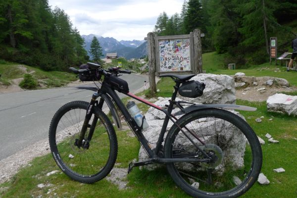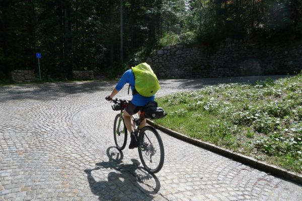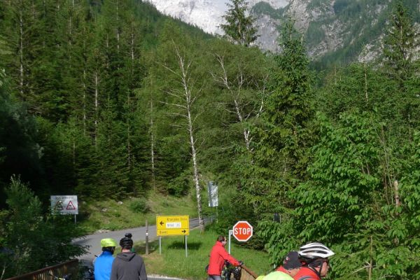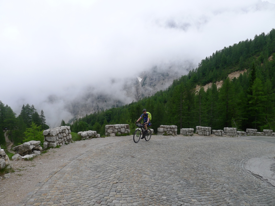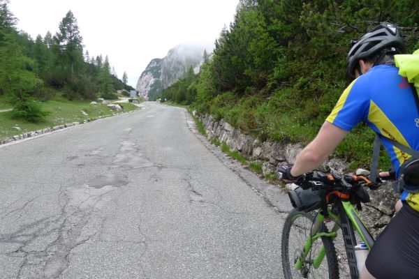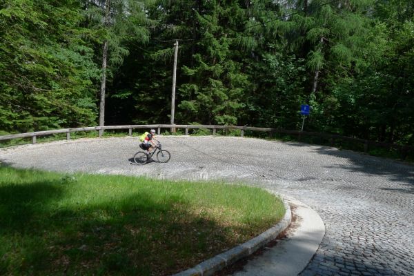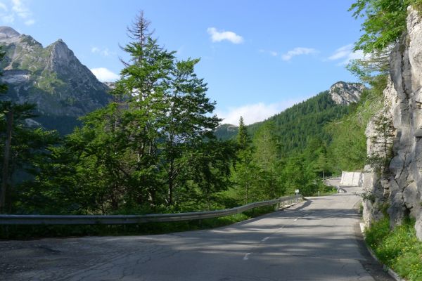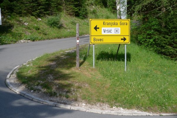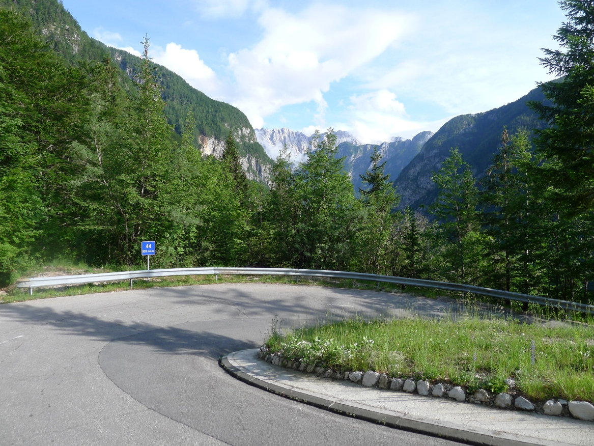 14:50 Uhr: der Regen hat tatsächlich aufgehöhrt und wir bepacken wieder die Räder. 45 km und mit dem Vršič -Paß (1611m) das Dach der diesjährigen Tour haben wir noch vor uns. Petrus meint es gut, auf den ersten Kilometern nach Kranjska Gora reißt der Himmel auf, der Jazna See glitzert grün in der Sonne und der Blick auf die Gipfel des Triglav Nationalparks wird frei. Wir sind am Einstieg zum Vršič Pass, dem höchsten asphaltierten Gebirgspaß Sloweniens. Auf 10km schraubt sich die Straße, die in den Jahren 1914 bis 1916 als Militärstraße von russischen Gefangenen ins Isonzo-Tal gebaut wurde, über 24 Serpentinen 750 Höhenmeter nach oben.