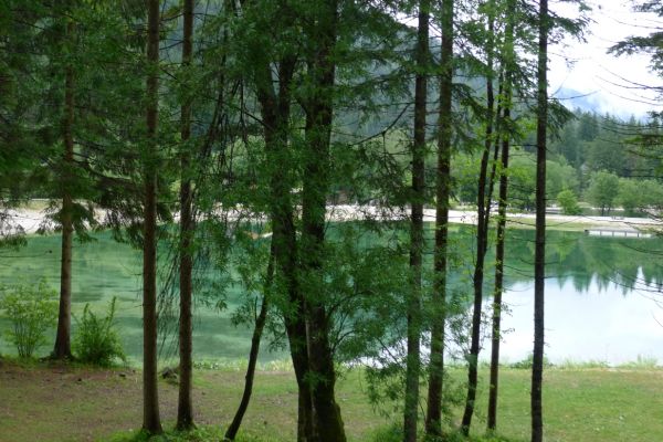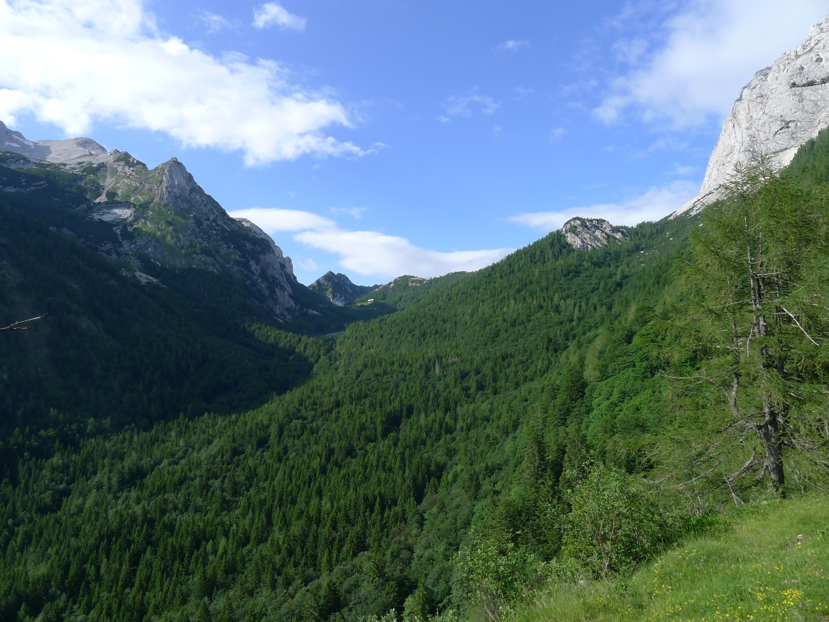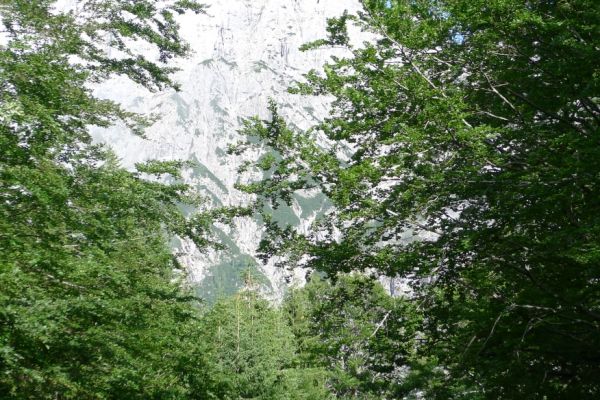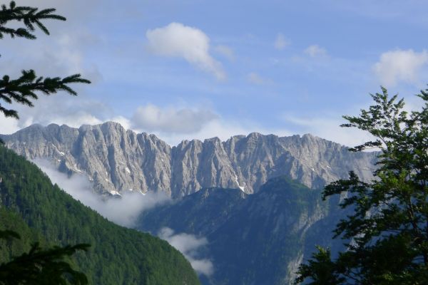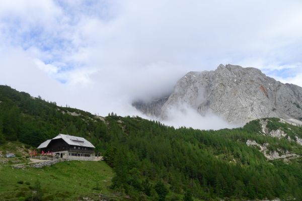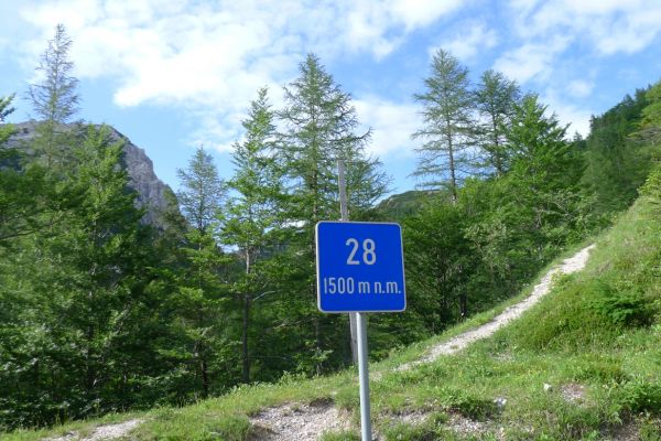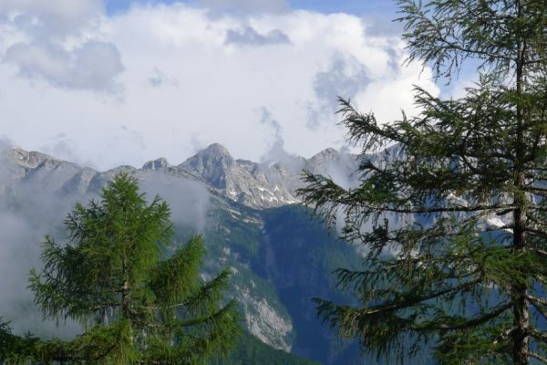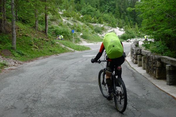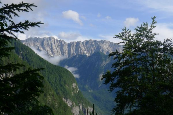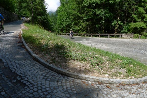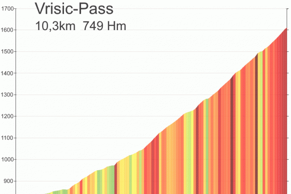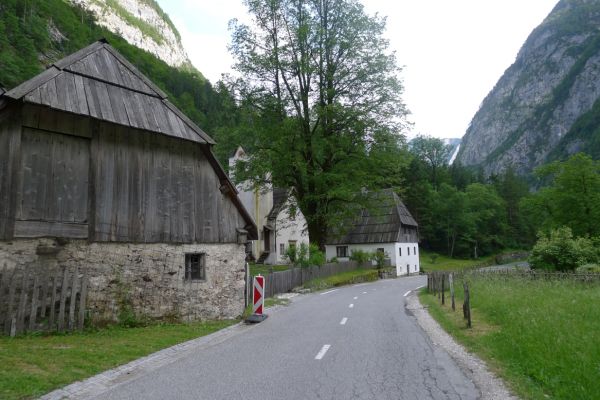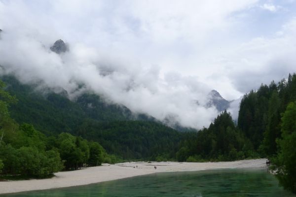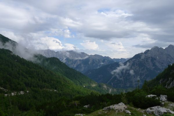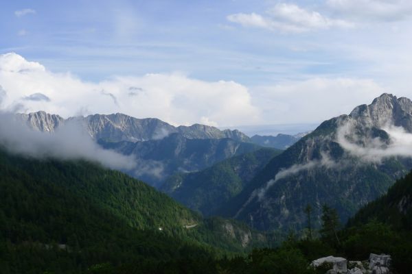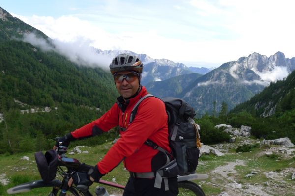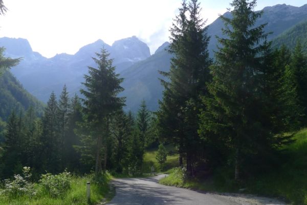 14:50 Uhr: der Regen hat tatsächlich aufgehöhrt und wir bepacken wieder die Räder. 45 km und mit dem Vršič -Paß (1611m) das Dach der diesjährigen Tour haben wir noch vor uns. Petrus meint es gut, auf den ersten Kilometern nach Kranjska Gora reißt der Himmel auf, der Jazna See glitzert grün in der Sonne und der Blick auf die Gipfel des Triglav Nationalparks wird frei. Wir sind am Einstieg zum Vršič Pass, dem höchsten asphaltierten Gebirgspaß Sloweniens. Auf 10km schraubt sich die Straße, die in den Jahren 1914 bis 1916 als Militärstraße von russischen Gefangenen ins Isonzo-Tal gebaut wurde, über 24 Serpentinen 750 Höhenmeter nach oben.