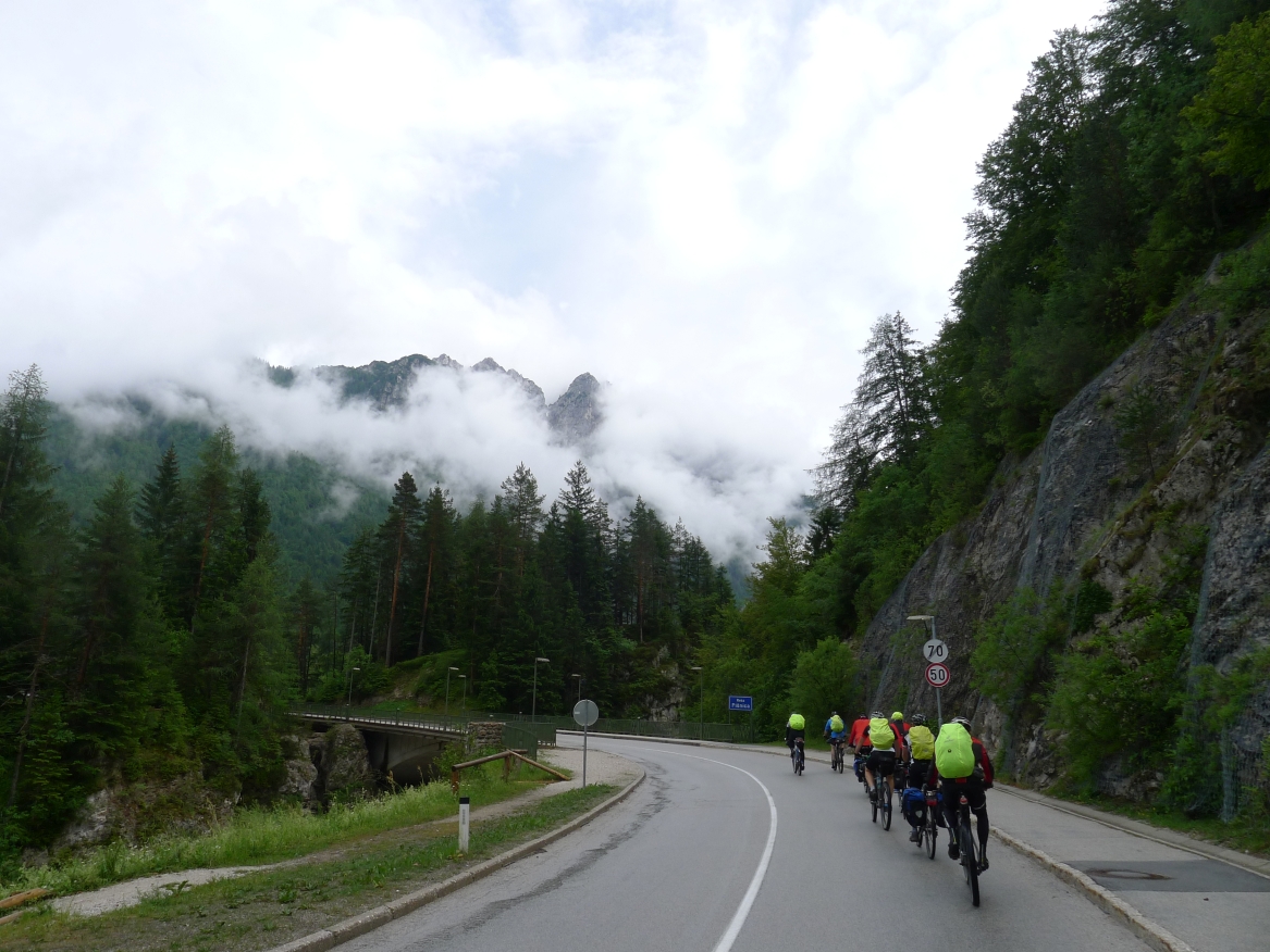 15:50 Uhr. das Gewitter trifft uns auf offener Strecke, einige bleiben unter großen Bäumen stehen, andere flüchten in ein kleines Wäldchen und ein paar schaffen es unter einen Unterstand auf einer Kuhweide. Nachdem das gröbste vorbei ist fahren wir weiter, etwa 10km haben wir noch vor uns und wir wollen vor dem nächsten Schauer am Ziel in Villach sein. Entsprechend geben wir nochmal richtig Gas. Bei konstant 28-32 km/h ist der TUS Express nicht mehr zu halten. Das bekommt auch eine Jugendgruppe zu spüren, deren männliche Vertreter die Herausforderung annehmen und sich an uns dranhängen.