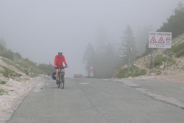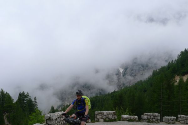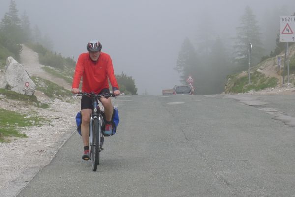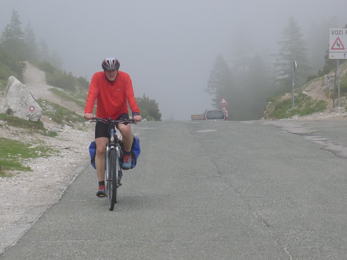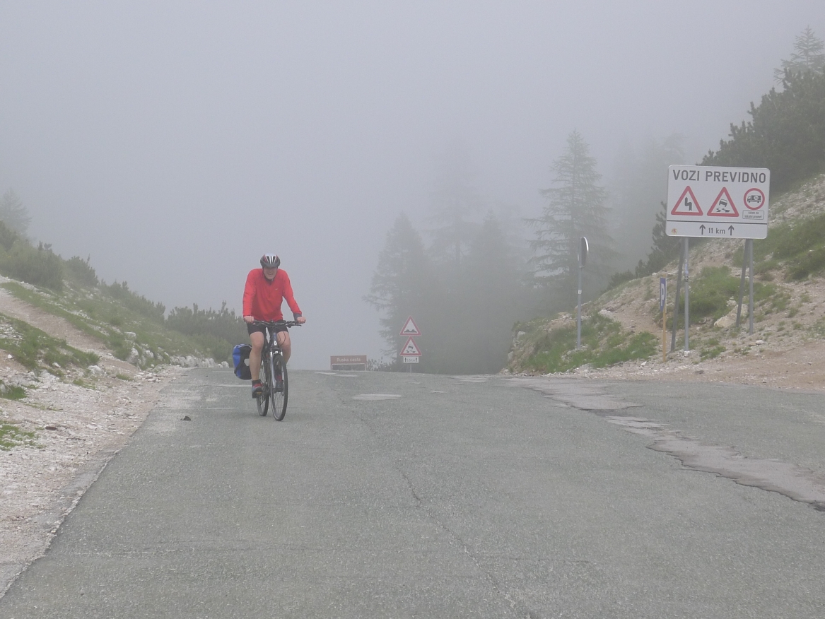 17:13 Uhr Nebel und Wolken ziehen von Norden die Paßhöhe hinauf. Mit Ihnen erreicht auch Armin den höchsten Punkt. Nach Süden bietet sich aber ein grandioser Blick auf die slowenische Bergwelt.