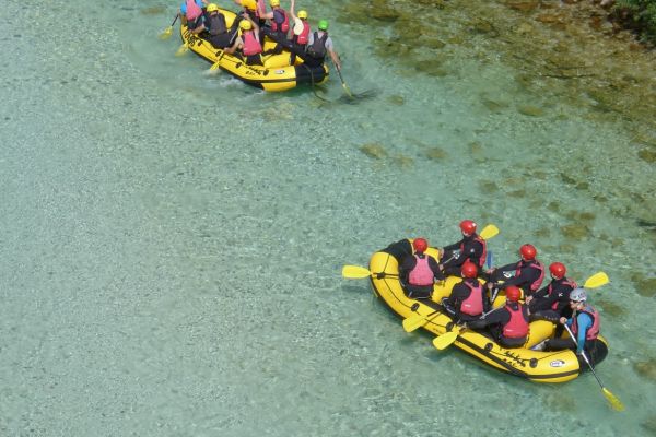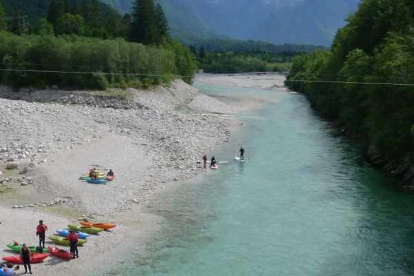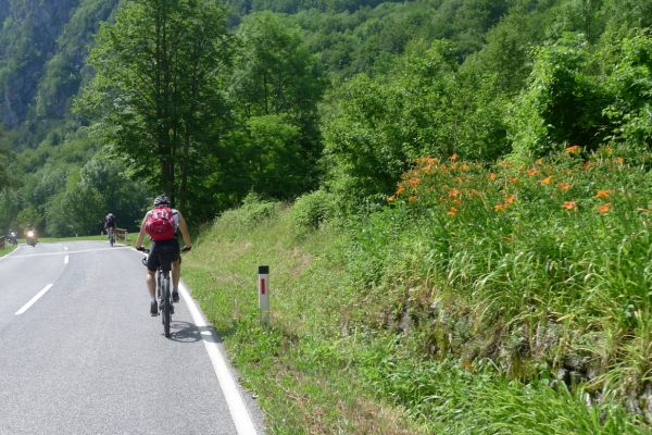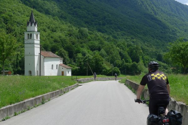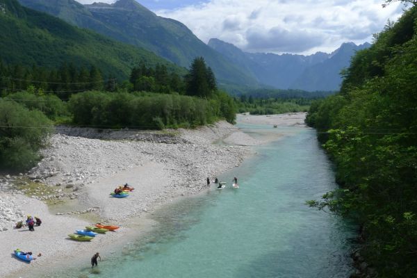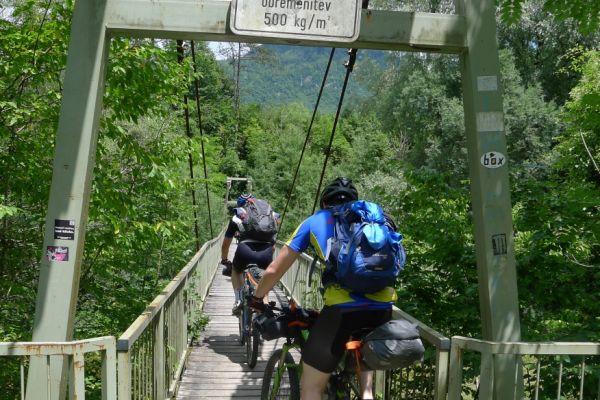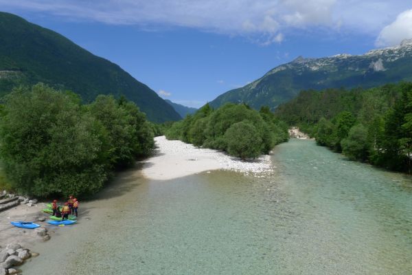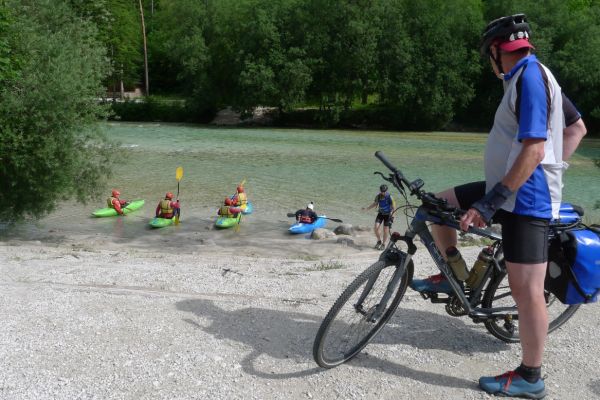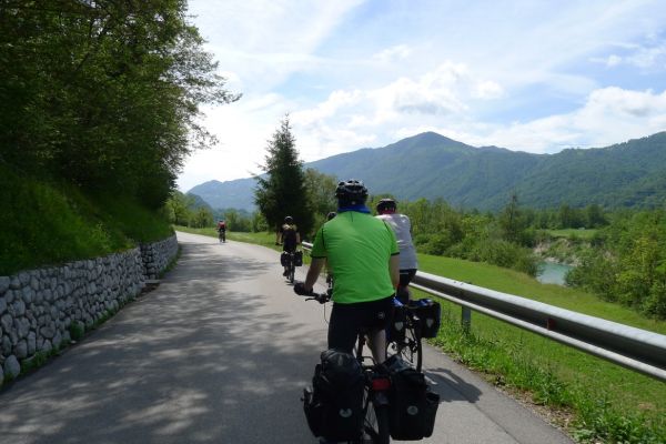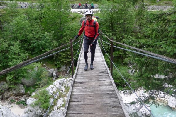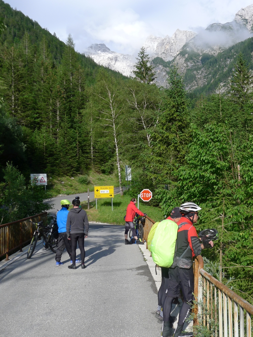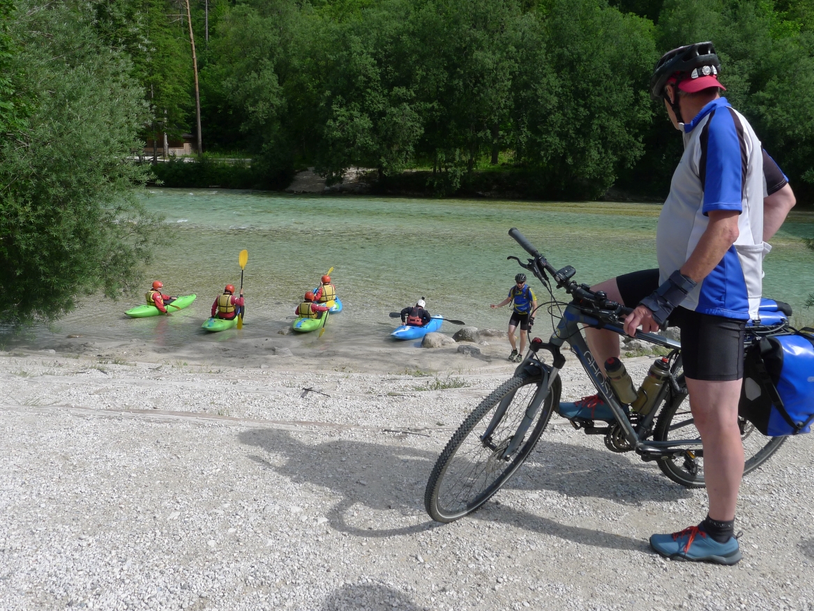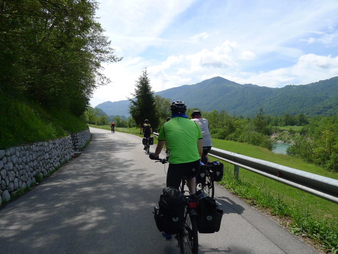 9:25 Uhr: eigentlicher Start der Etappe bei bestem Radfahrwetter, warm aber nicht zu heiß und Sonnenschein. Den Wetterprognosen zu Folge können die Regensachen heute in den Taschen und Rucksäcken bleiben. Die großen Berge haben wir hinter uns, trotzdem müssen heute noch über 1200 Höhenmeter bewältigt werden. Wir fahren zunächst auf einer ruhigen Nebenstraße das Soča-Tal nach Süden, haben immer wieder einen schönen Blick auf das smaragdgrüne kristallklare Wasser und auf die Kajakfahrer oder Rafting Boote auf dem Fluss. Auf einer Brücke macht der Selfiebeauftragte Lars das „first selfie of the day“.