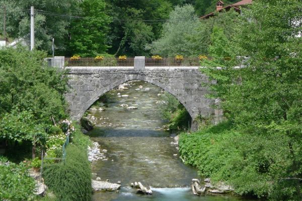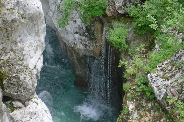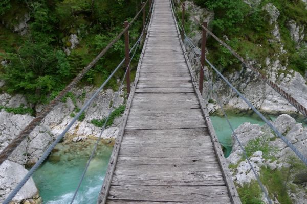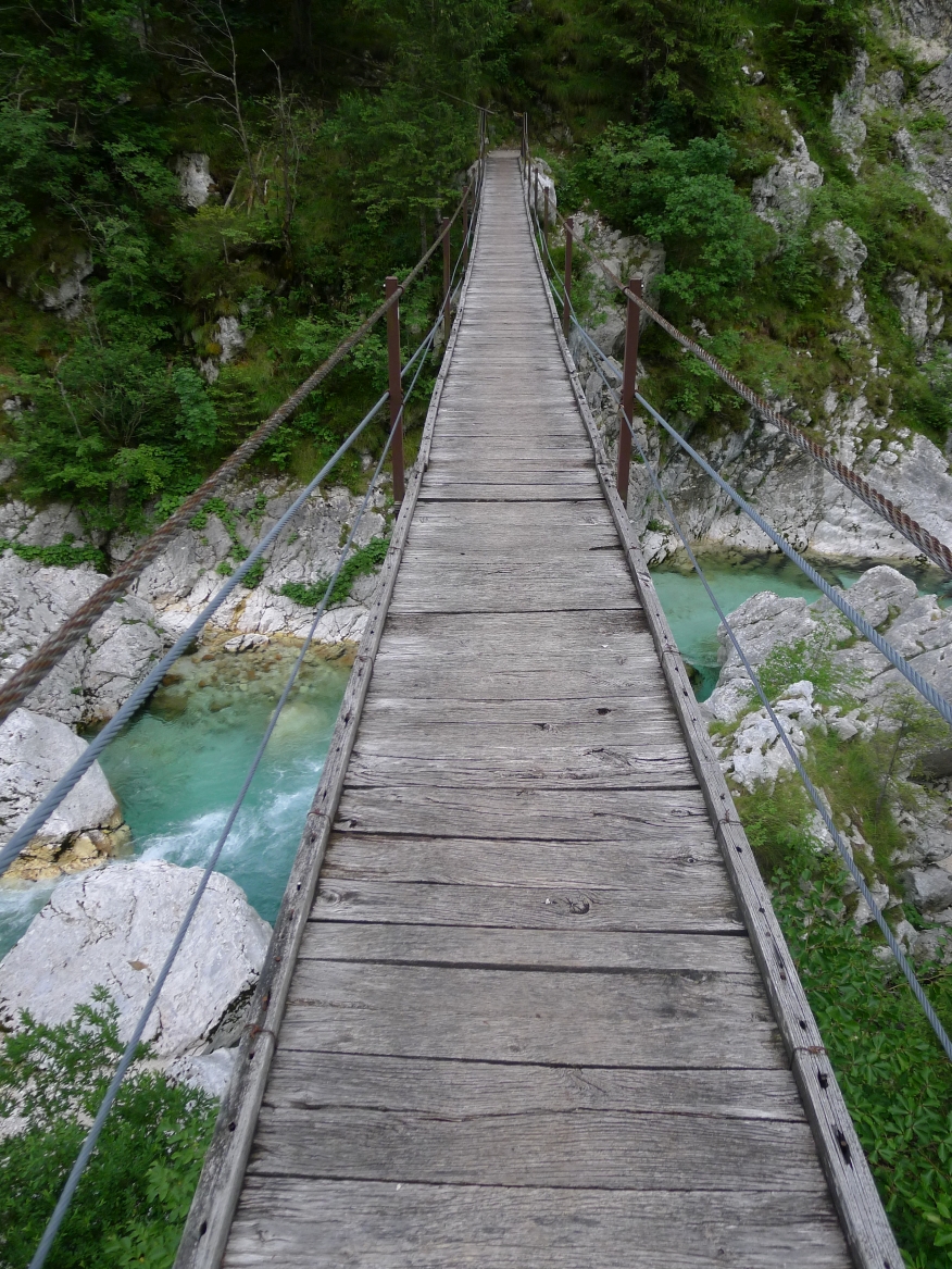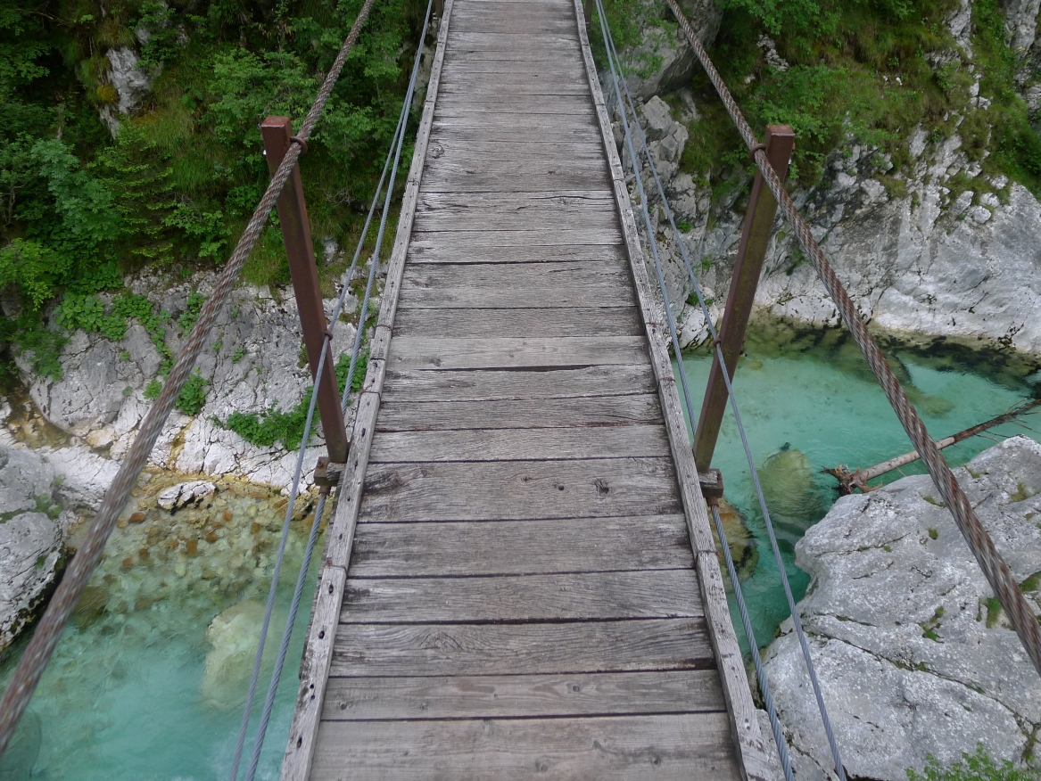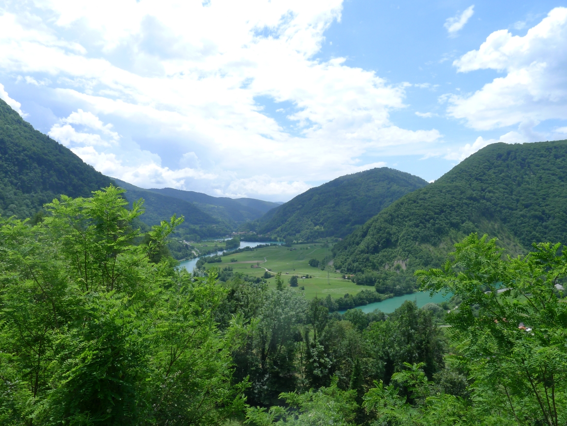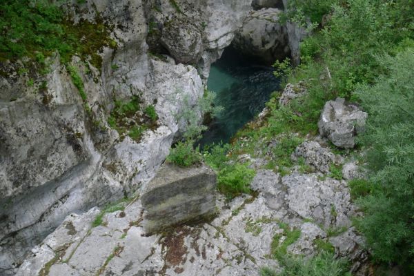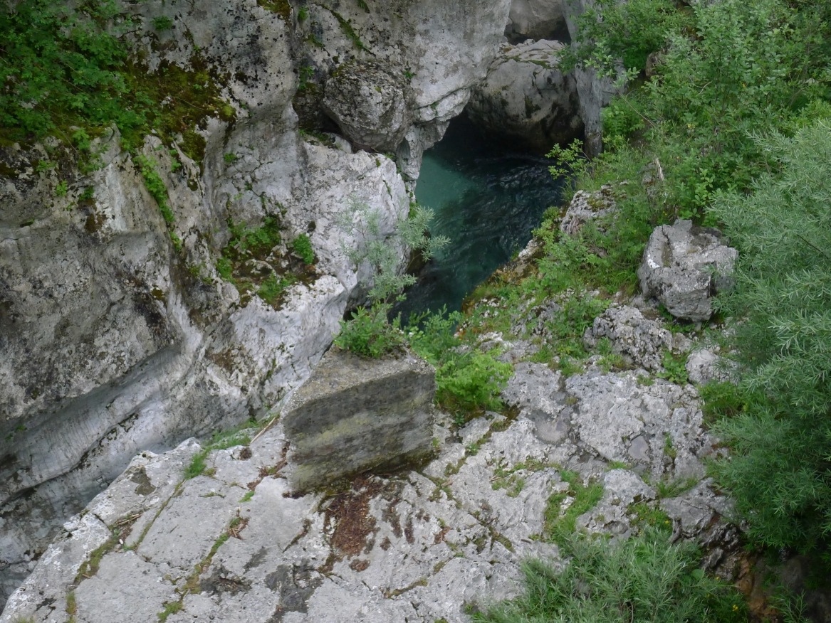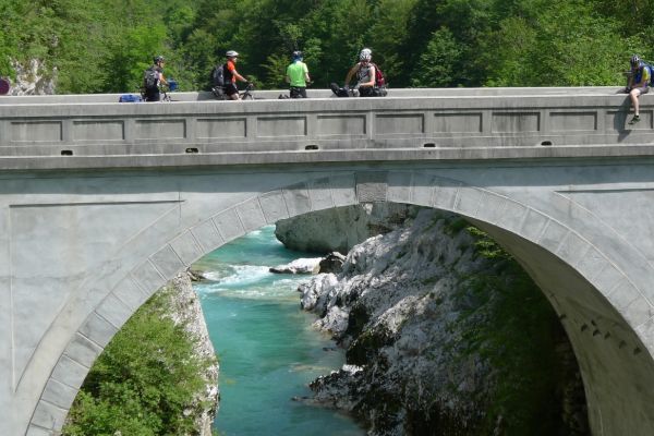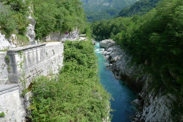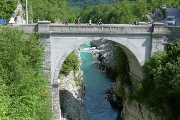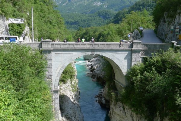 10:40 Uhr: Nach einem längeren Stück auf der Hauptstraße biegen wir wieder auf eine Nebenstraße ab und erreichen die Napoleonbrücke bei Kobarid. Über die steinerne Brücke über eine kleine Schlucht marschierten schon Napoleons Truppen während der Koalitionskriege. Auch wir passieren die Brücke und folgen der Soča weiter flussabwärts, kommen durch kleine Weiler die mitten in einer grünen Oase aus Wiesen, Feldern und bewaldeten Hügeln liegen.