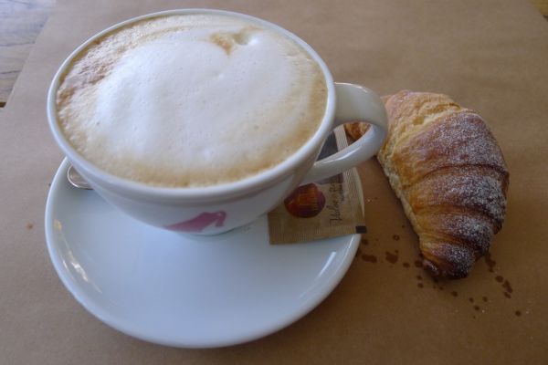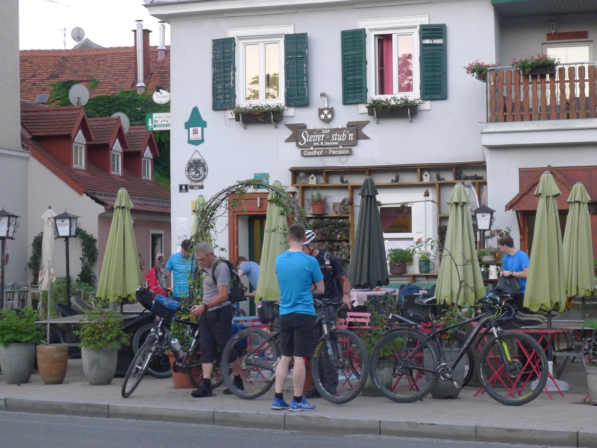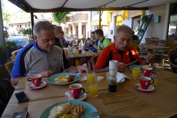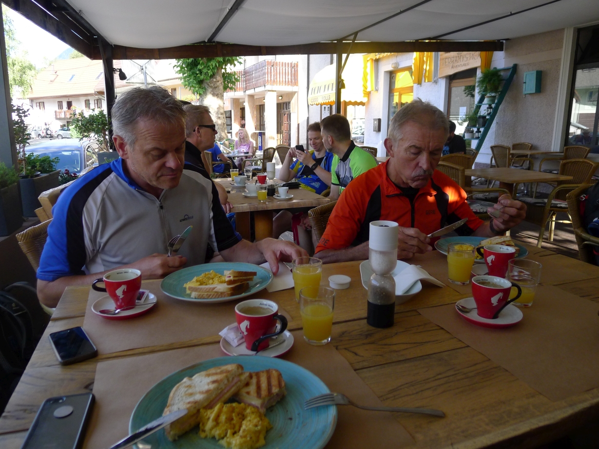 8:10 Uhr: wir holen die Räder aus dem Keller der Unterkunft, laden das Gepäck auf und fahren ein Stück weiter zu einer Bar um zu frühstücken.