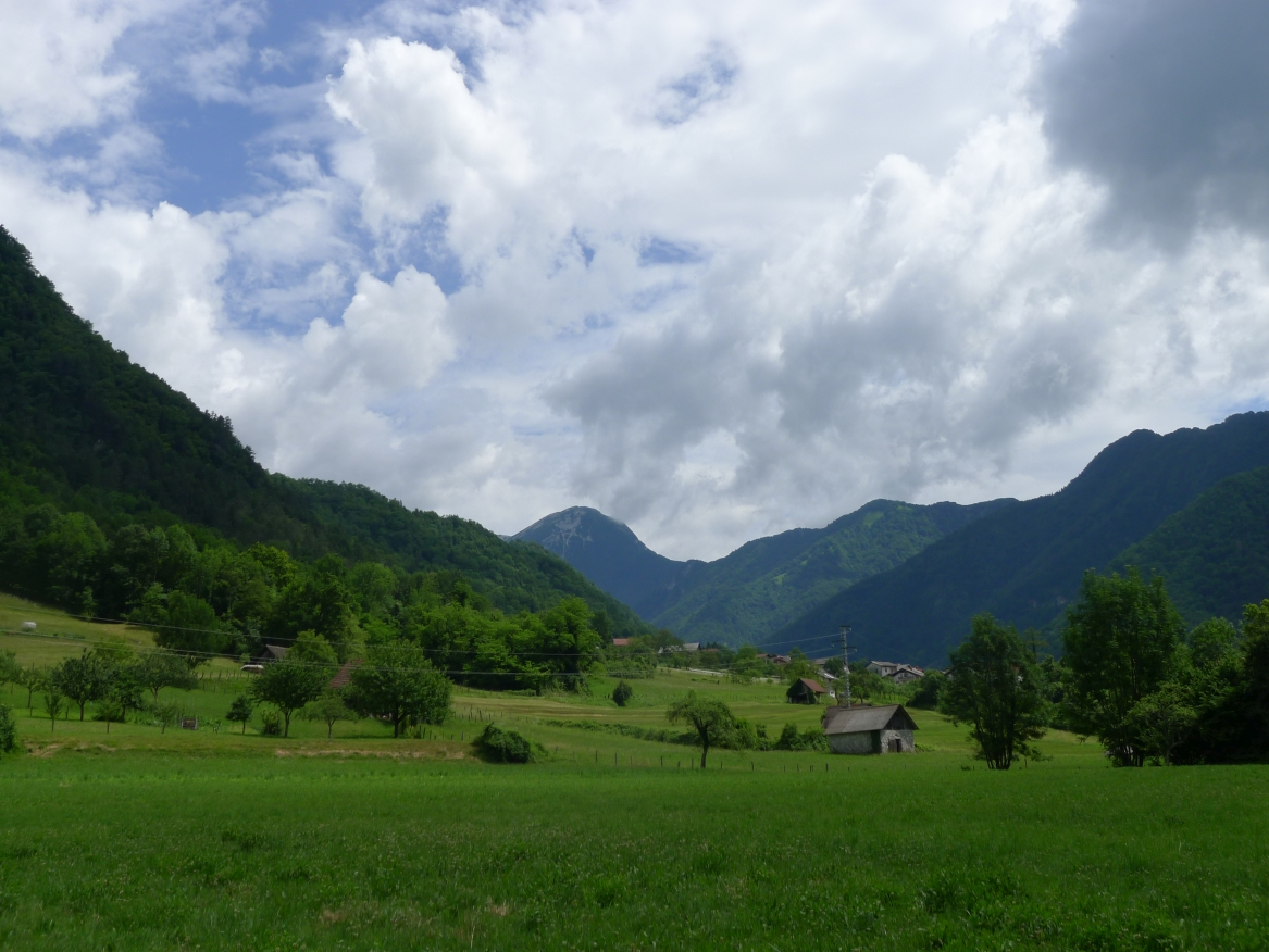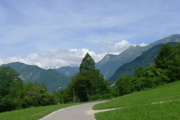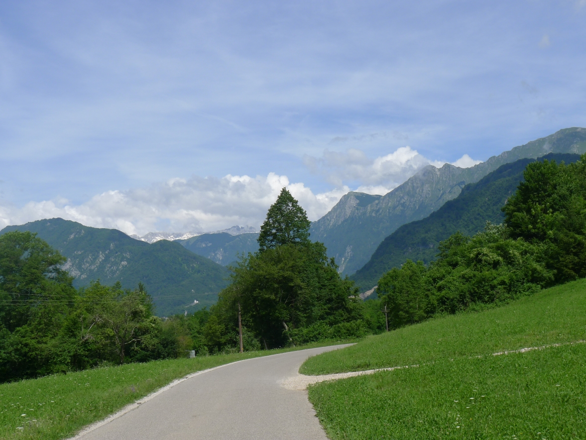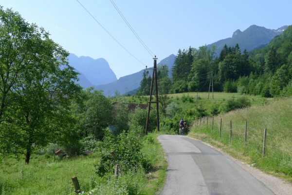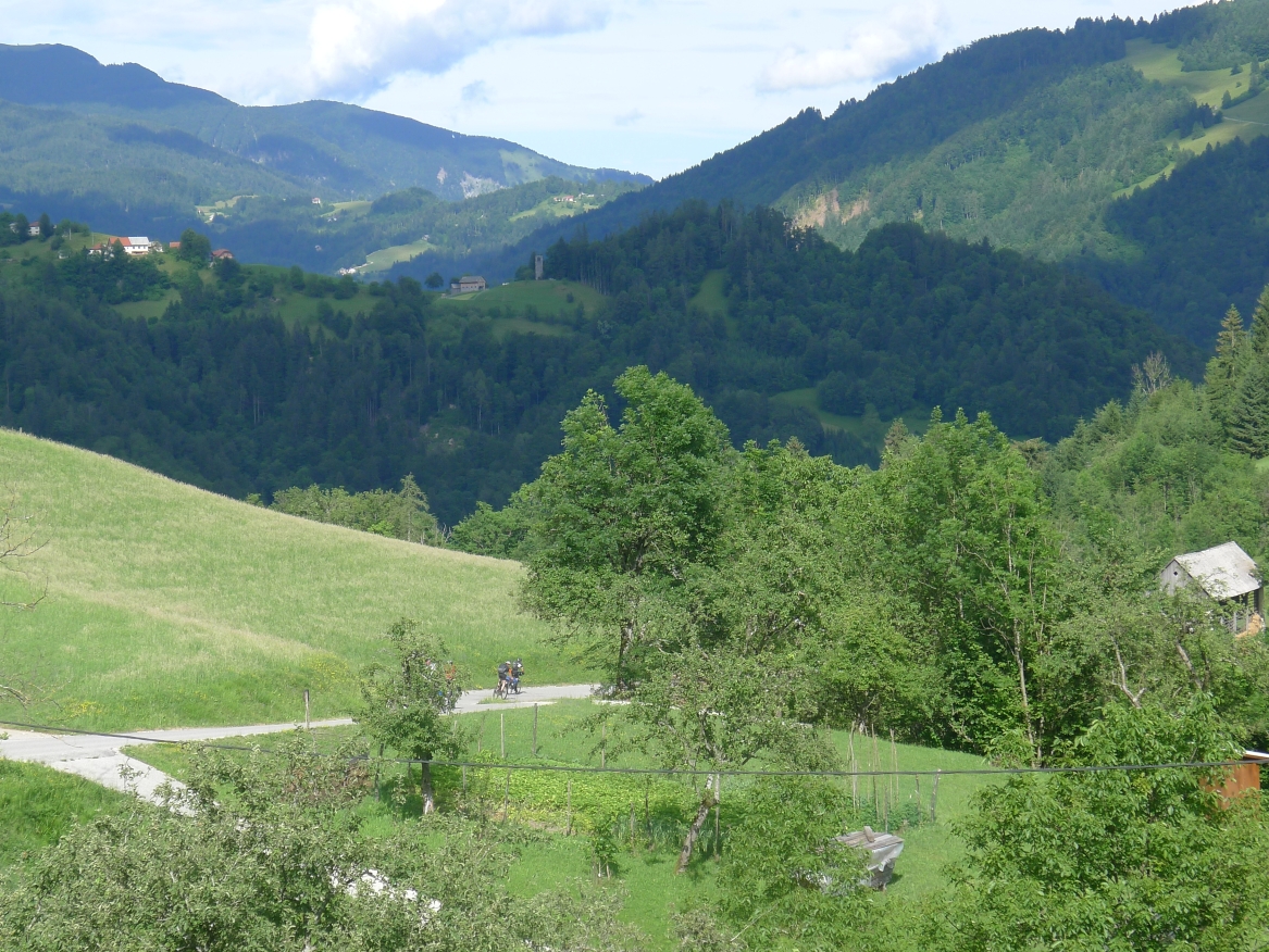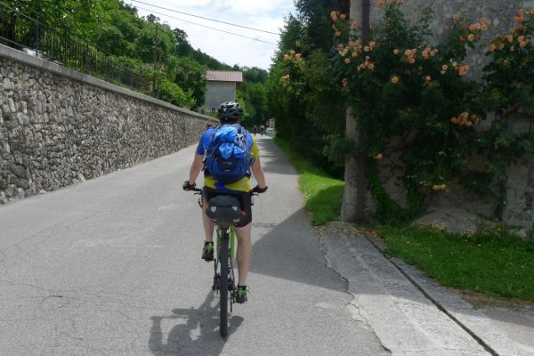 13:17 Uhr: weiter geht’s. Nach 2km kommt der erste richtige Anstieg des Tages, bislang ging es ja überwiegend nur bergab. Wir biegen von der Soča ab, haben einen letzten Blick auf den intensiv-grün gefärbten Fluss und fahren 3km lang bergauf nach Ljubinj. Immer wieder bieten sich tolle Blicke zurück ins Tal, auf Tolmin und den markanten Burgberg.