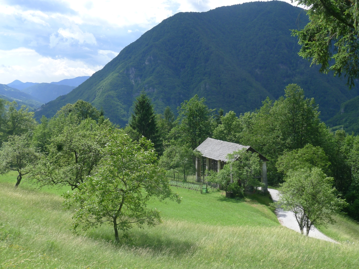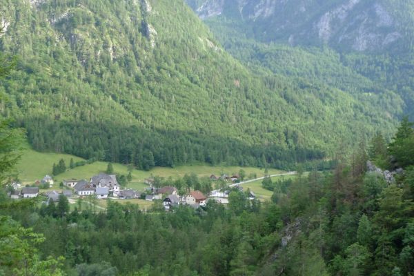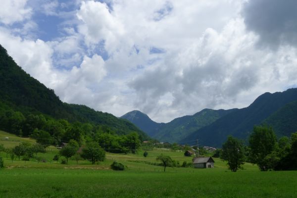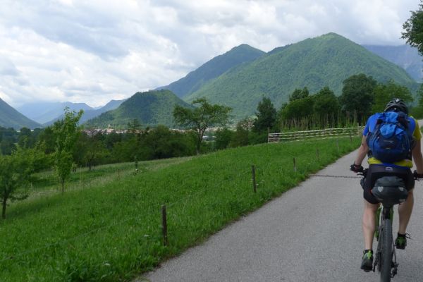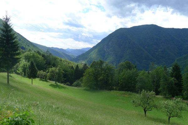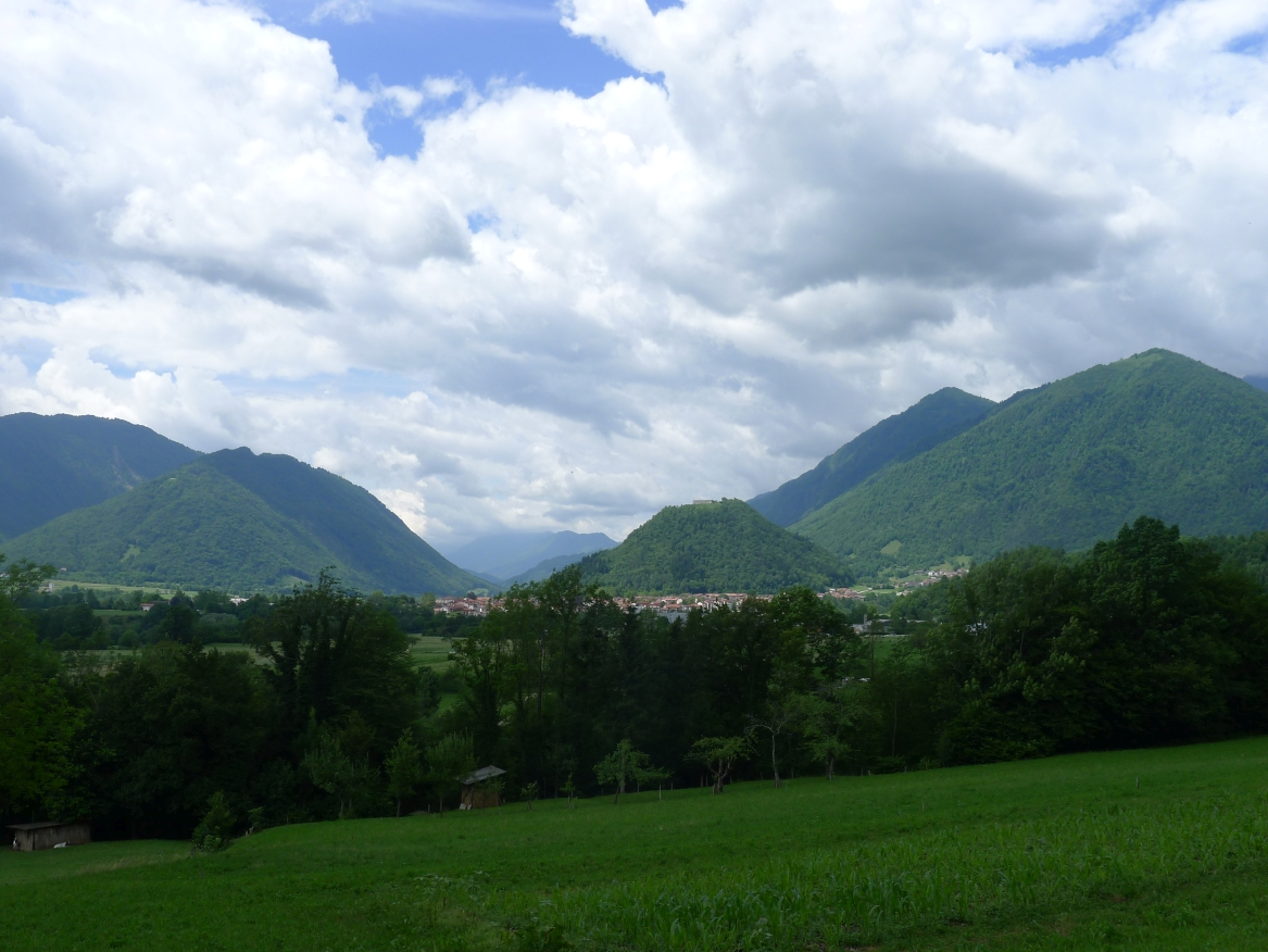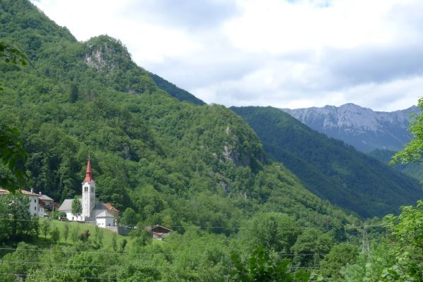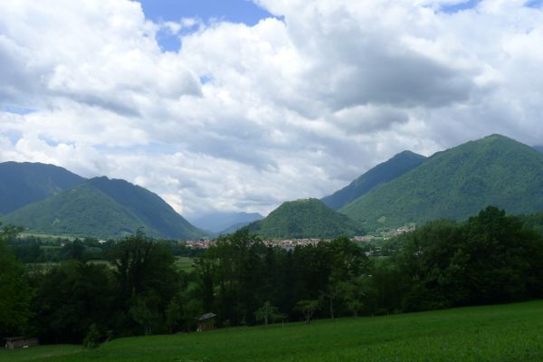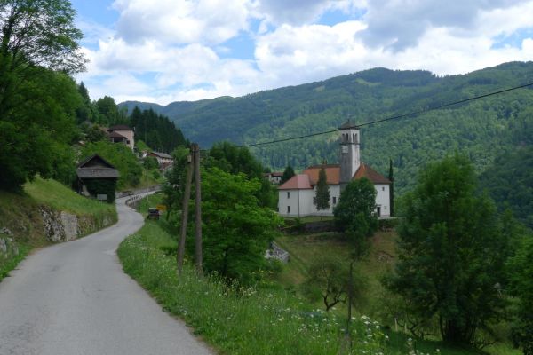 13:17 Uhr: weiter geht’s. Nach 2km kommt der erste richtige Anstieg des Tages, bislang ging es ja überwiegend nur bergab. Wir biegen von der Soča ab, haben einen letzten Blick auf den intensiv-grün gefärbten Fluss und fahren 3km lang bergauf nach Ljubinj. Immer wieder bieten sich tolle Blicke zurück ins Tal, auf Tolmin und den markanten Burgberg.