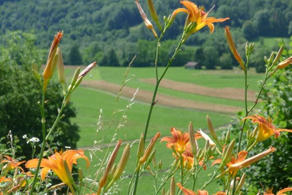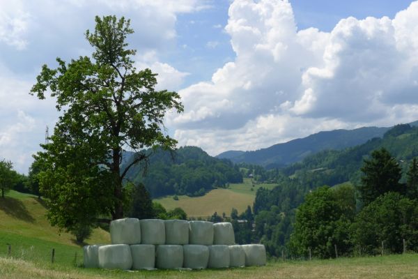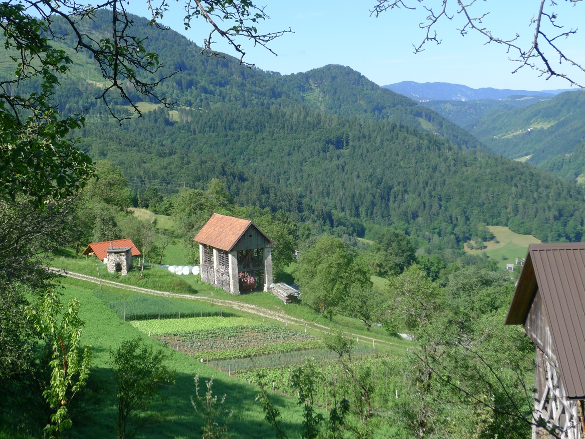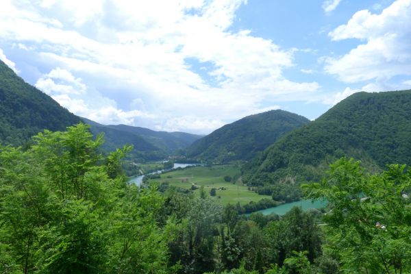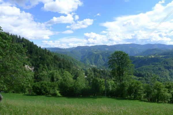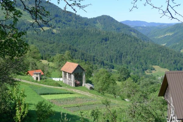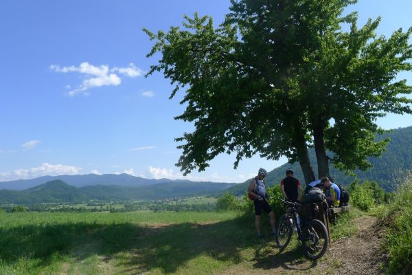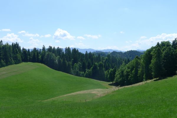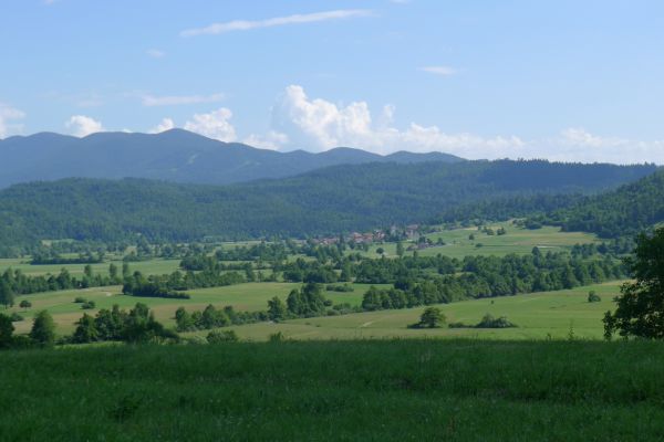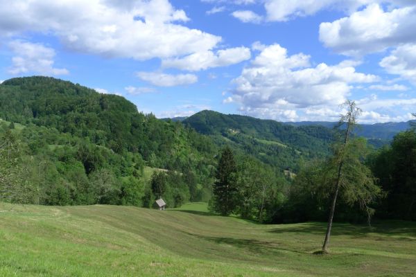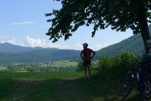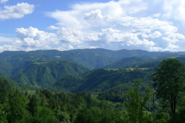 15:00 Uhr: nach 11km mit viel auf und ab erreichen wir bei Grahovo wieder die Talsohle und gehen in den letzten langen Anstieg des Tages. 7km mit bis zu 10% Steigung nach Bukovo. Oben angekommen geht es auf welligem Terrain weiter. Der Ausblick ins Tal entschädigt aber für die vielen Höhenmeter, die wir hier noch einsammeln.