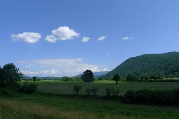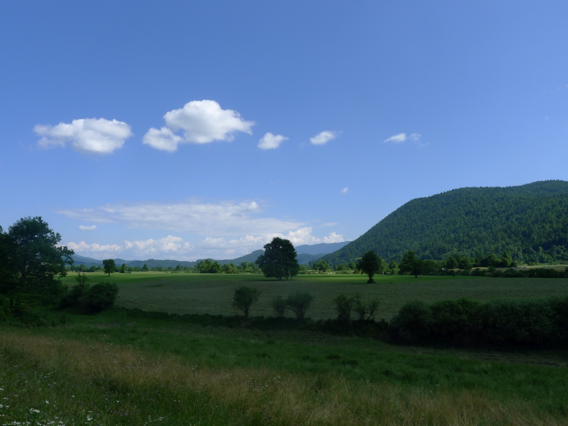 Wenig später müssen wir nochmal halten und den Reifen nachflicken. Dieser Stopp ist aber landschaftlich sehr lohnend. Von einer leichten Anhöhe haben wir einen 180° Panoramablick auf ein Feuchtgebiet mit dem Flüsschen Unica, das wir gerade umfahren haben, das Dorf Planina und die umliegenden Hügel, alles angestrahlt von einer tiefstehenden Nachmittagssonne.