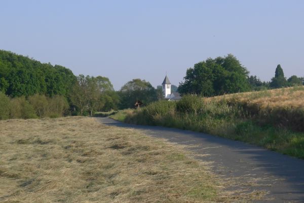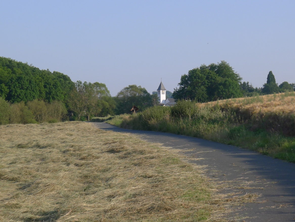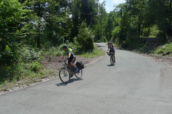 13:54 Uhr: hinter Schwarzach müssen wir eine 2km lange steile Rampe hinauf. 8-11% bei 36°C treibt den Schweiß aus allen Poren. Andi steigt frühzeitig vom Rad und schiebt, legt aber ein beachtliches Tempo vor, dass ich Mühe habe auf dem Rad mitzuhalten. Wir folgen einem Höhenweg, auf dem es ständig auf und ab geht und von dem aus wir immer wieder tolle Ausblicke haben.