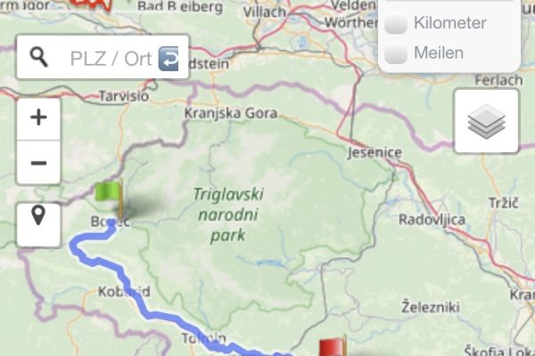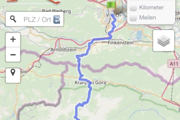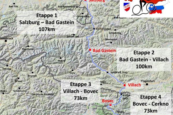 Etappenorte: Salzburg, Bad Gastein, Villach, Wurzenpaß, Vršič Paß, Bovec, Cerkno, Postojna, Ljubiljana