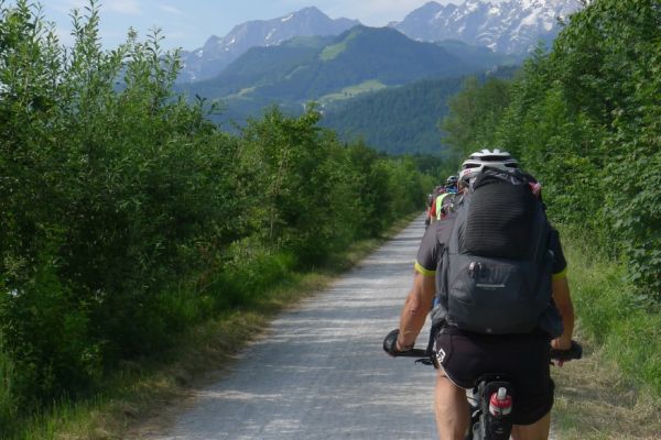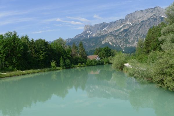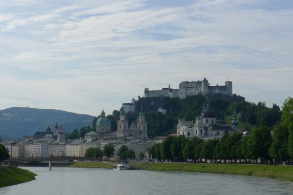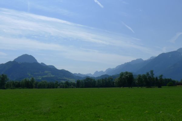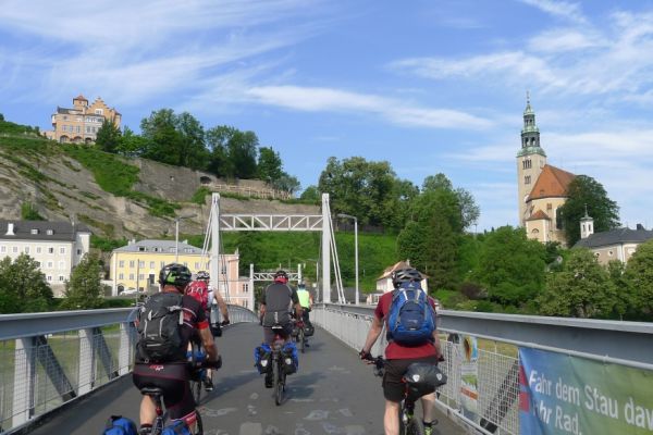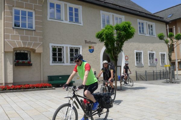 8:30 Uhr: Sonne, 23°C, bestes Radfahrwetter wartet auf uns. Wir starten eine halbe Stunde früher als üblich, da der Routenplaner 107km berechnet hat und für den Nachmittag Wärmegewitter angekündigt sind. Vom Hotel geht’s direkt an die Salzach, von wo aus wir nochmal einen Panoramablick auf Salzburg haben. Nachdem die Altstadt passiert ist, fahren wir durch eine Auenlandschaft immer am Fluss entlang.