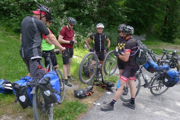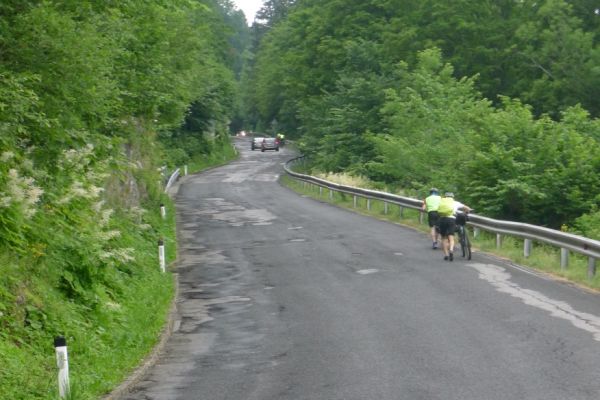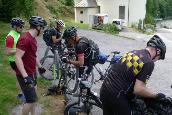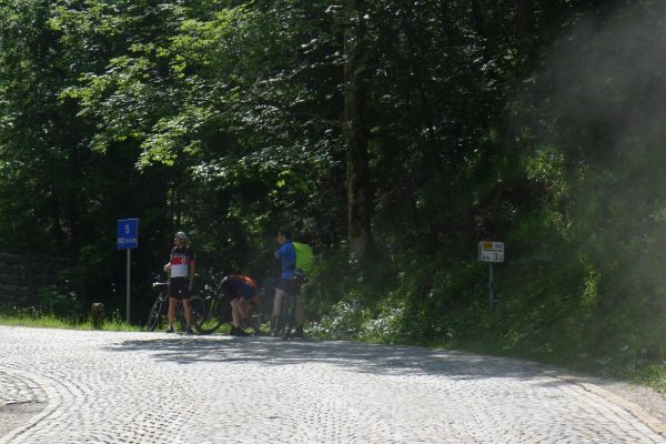 11:20 Uhr: es rollt eigentlich ganz gut, die erste von 3 Bergwertungen haben wir schon gemeistert, da vermeldet Armin eine technische Panne. Sein Freilauf klemmt. Schnell stellen wir fest, dass wir hier nicht viel ausrichten können. Angesichts des ohnehin engen Zeitrahmens beschließen wir für Armin im nächsten Ort nach einer Radwerkstatt und Transportmöglichkeit nach Ljubljana zu suchen.