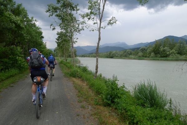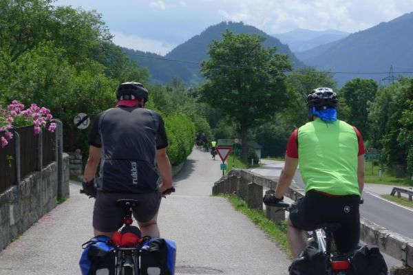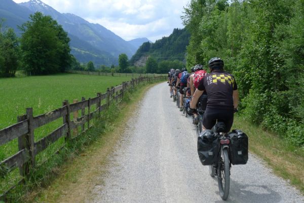 12:20 Uhr: Möllbrücke ist erreicht, hier mündet die Möll in die Drau. Vor uns liegt ein breiter Talkessel. Das ist Lars Terrain, er setzt sich an die Spitze des 9-er Express Zuges und hält das Tempo trotz schwüler Temperaturen von >30°C auf konstant 28km/h. Nach und nach schnappen wir uns andere Radgruppen.