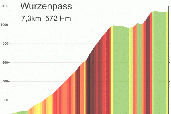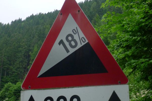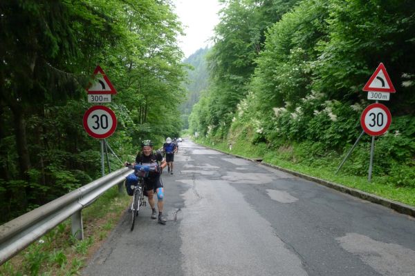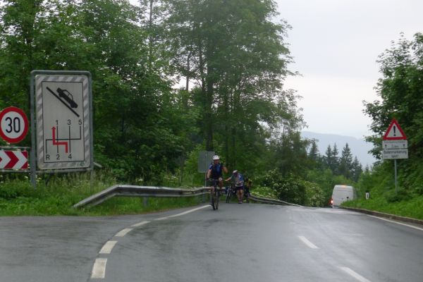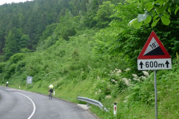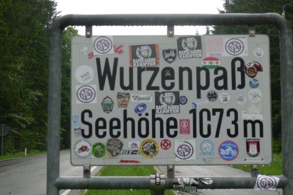 9:40 Uhr die ersten 13 km sind geschafft, wir zweigen vom Fluss Gail aus gleichnamigen Tal nach Süden ab. In Riegersdorf beginnt der Anstieg zum Wurzenpaß. Mit 1073m einer der niedrigeren Alpenpässe. 570 Höhenmeter auf 7,3km klingen auf den ersten Blick auch nicht sonderlich schwer. Herzstück ist allerdings eine 600m lange 18%ige Rampe…. Auf den ersten Kilometern geht es schon ordentlich zur Sache, knackige 12% zeigt der Tacho.