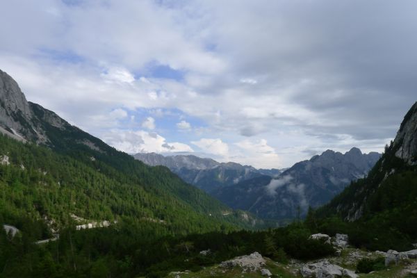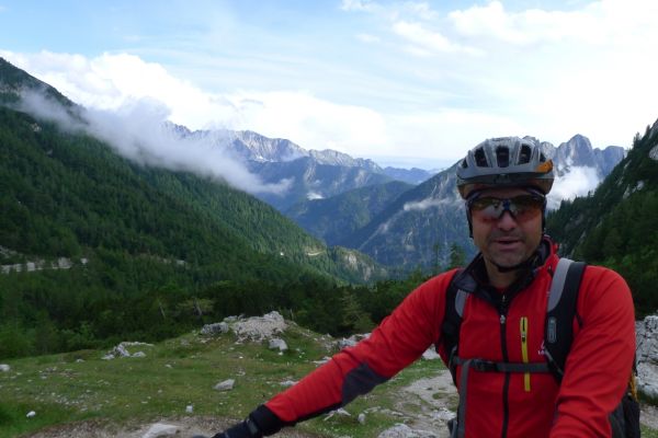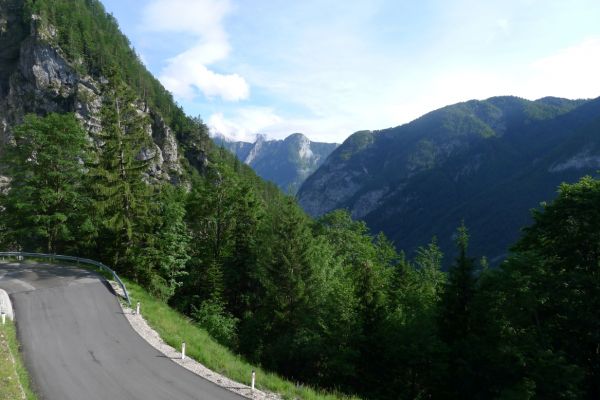 17:40 Uhr: nach einem weiteren Fotostopp mit Panoramablick auf den Triglav Nationalpark gehen wir auf die 8km lange Abfahrt, die in 26 Serpentinen nach Trenta führt und immer wieder tolle Blicke auf die Berge bietet.