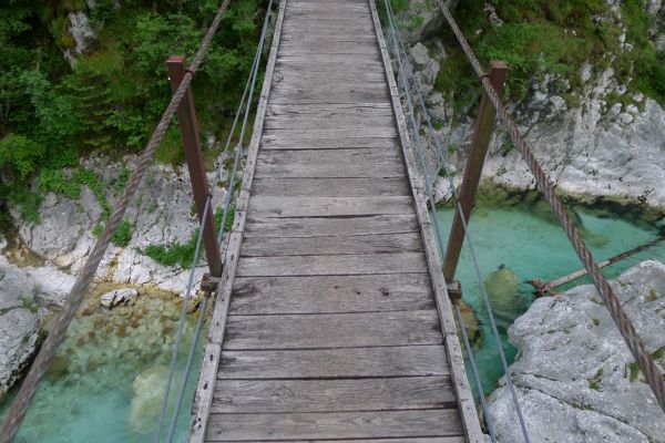 18:34 Uhr: eine wackelige Hängebrücke über den smaragdgrünen Fluß wird von uns auf ihre Belastbarkeit hin überprüft.