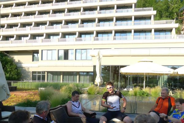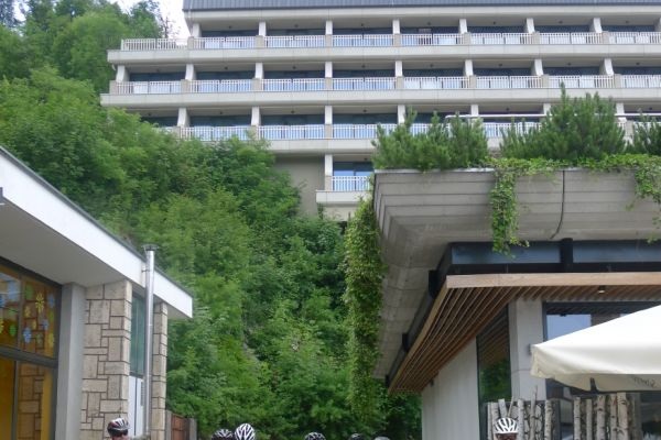 17:28 Uhr: Nach einer 8km langen Abfahrt erreichen wir das Etappenziel Cerkno, wo wir erstmal ein Cafe ansteuern und uns mit Espresso und einem Eis belohnen. Zwischen Einchecken ins Hotel und Abendessen ist noch etwas Wellness im angrenzenden Thermalbad angesagt.