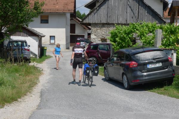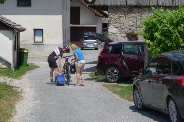 2km weiter in Slivice sprechen wir eine Frau auf der Straße an. Schnell holt sie ihre Kinder zum Dolmetschen hinzu und schon wird eifrig telefoniert. Doch alle Werkstätten haben zu (es ist Nationalfeiertag, wie wir später erfahren) und das Taxiunternehmen ist nicht bereit ein Fahrrad mitzunehmen. Spontan erklärt sich die Frau bereit Armin ins 40km entfernte Ljubljana zu fahren. Wow, mit so viel Hilfsbereitschaft haben wir nicht gerechnet….