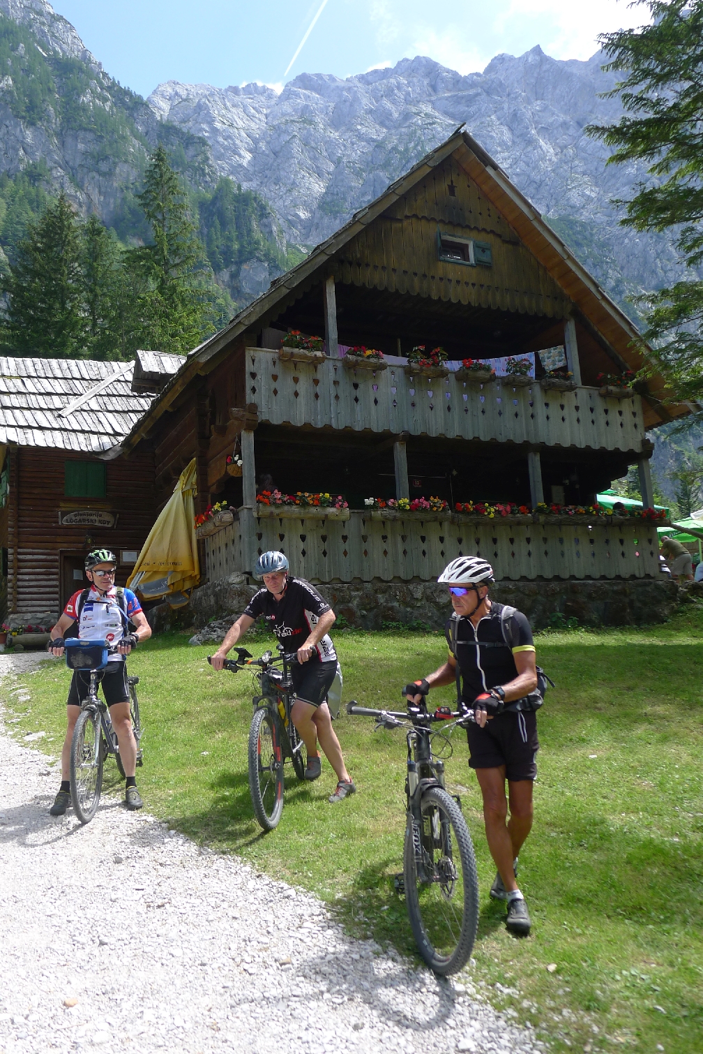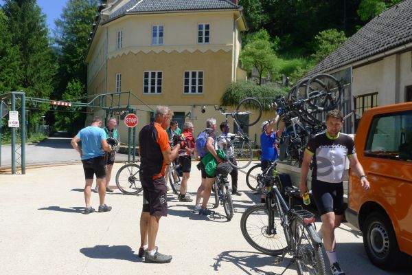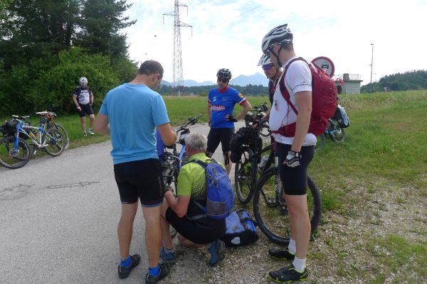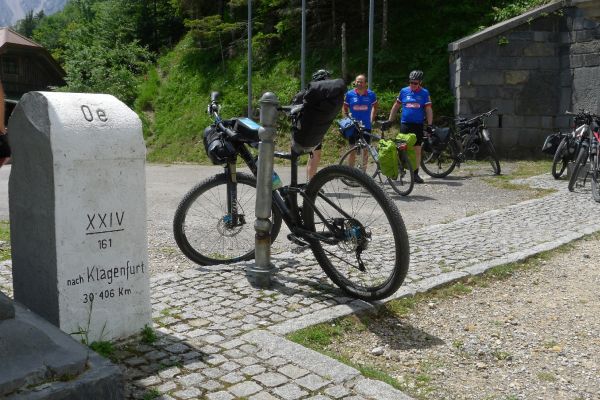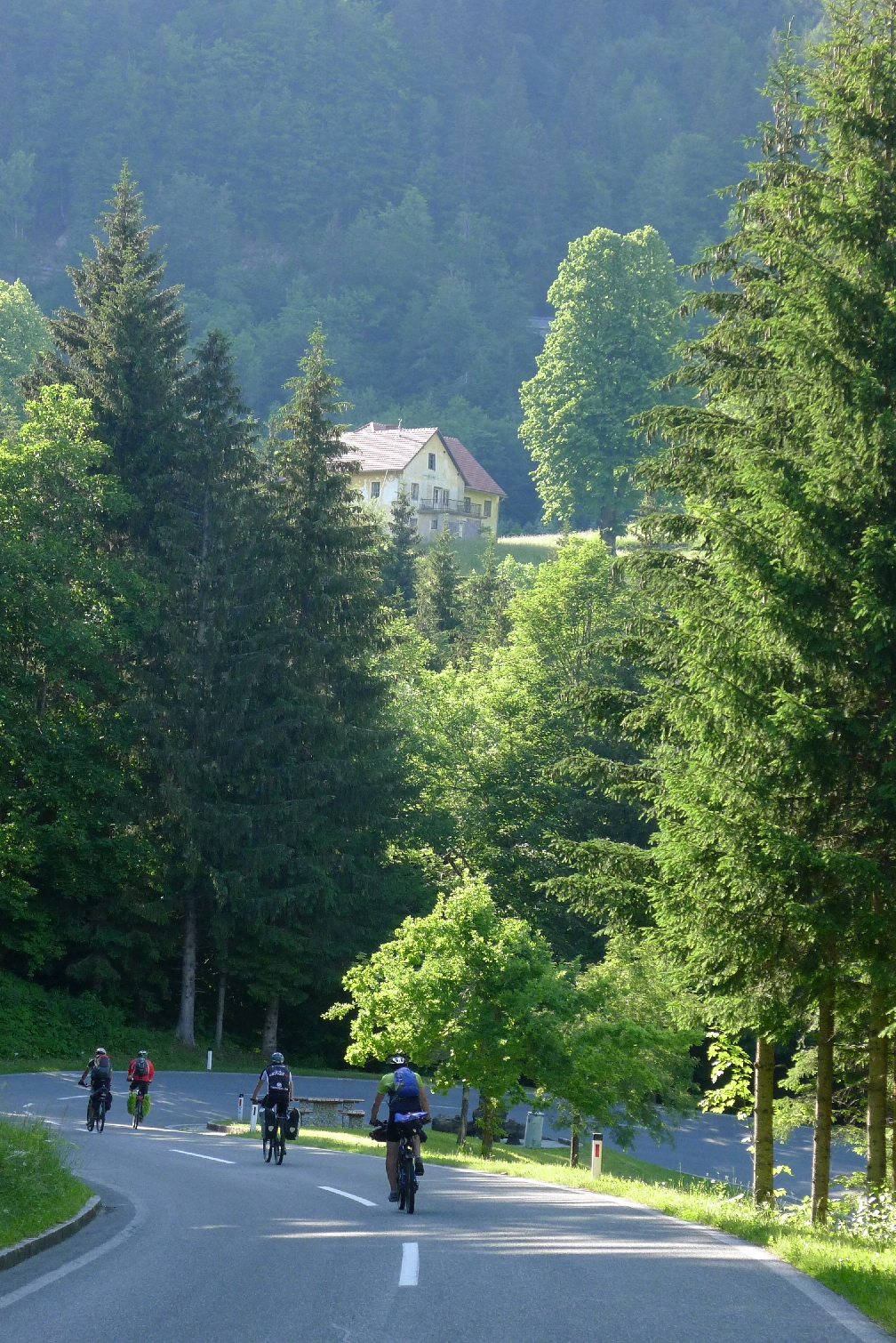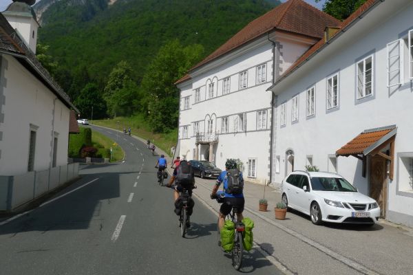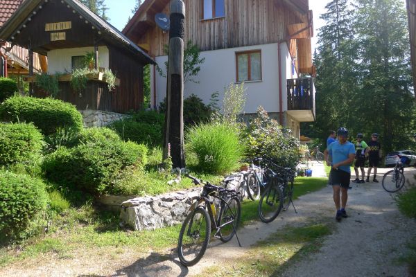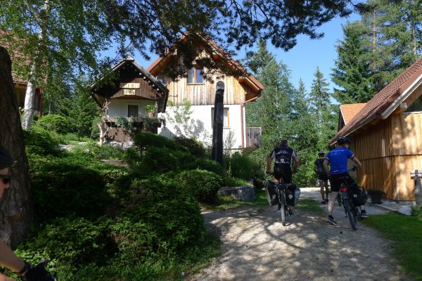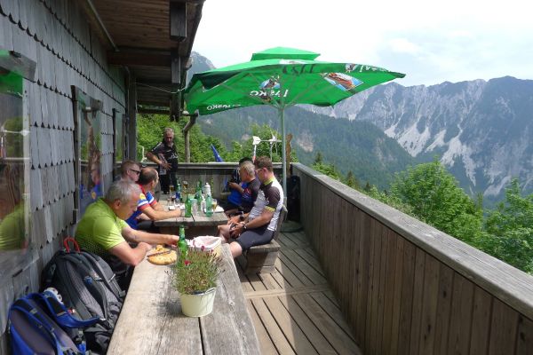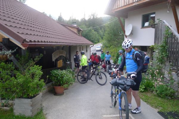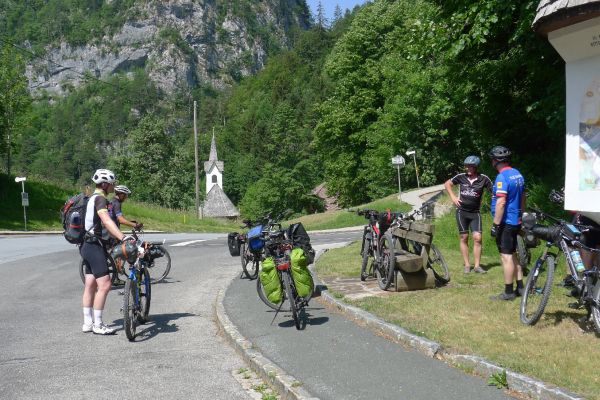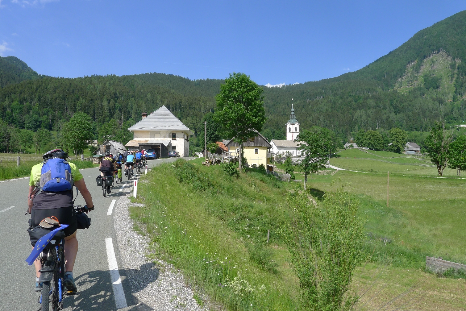 14:30 Uhr: nach 56km erreichen wir Spodnje Jezersko/Unter Seeland. Eine Gastwirtschaft mit Biergarten direkt an der Straße lädt zur Mittagsrast ein. Die Wirtin ist aber allein, bekommt angesichts 10 hungriger Radfahrer Angst und verweist uns auf den nächsten Ort.