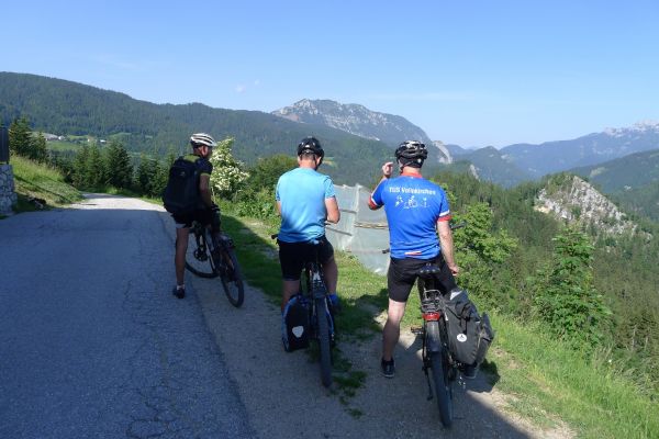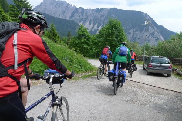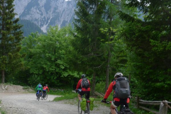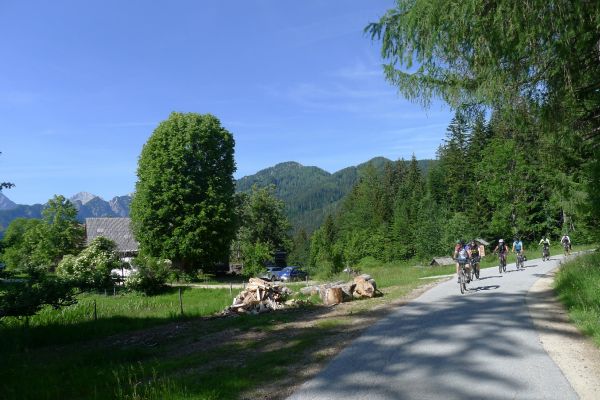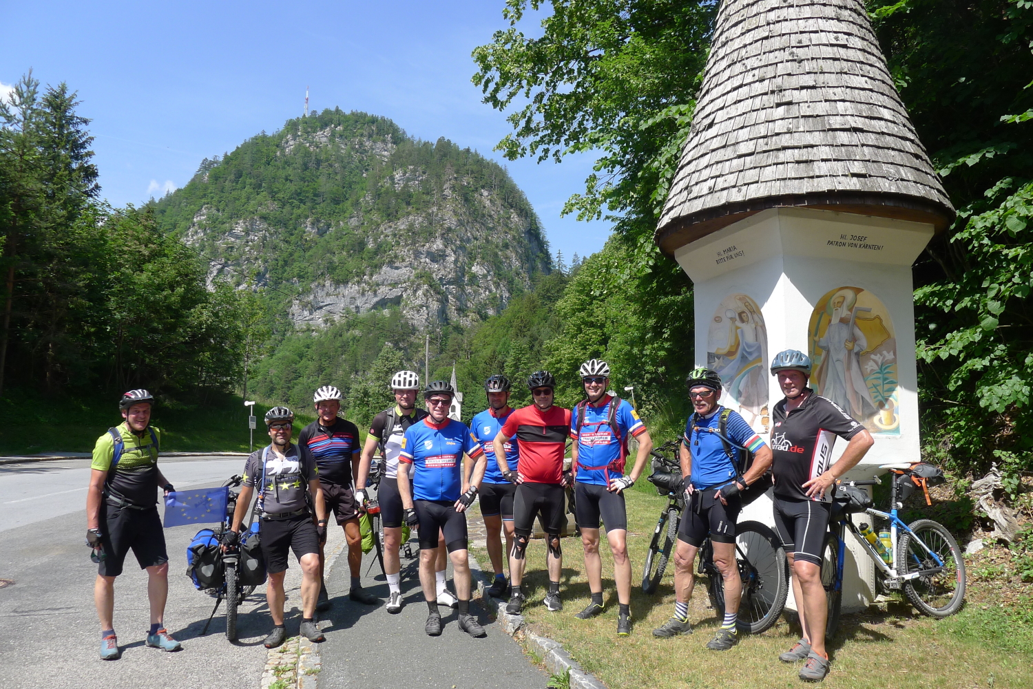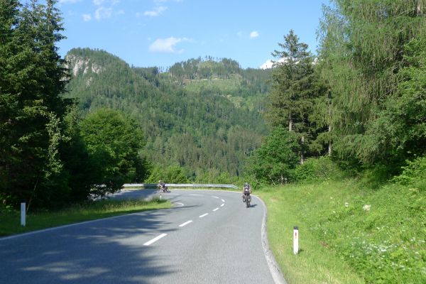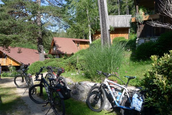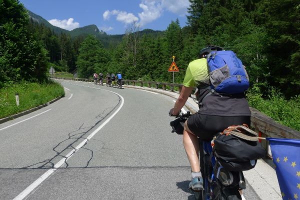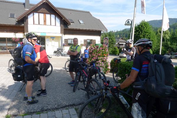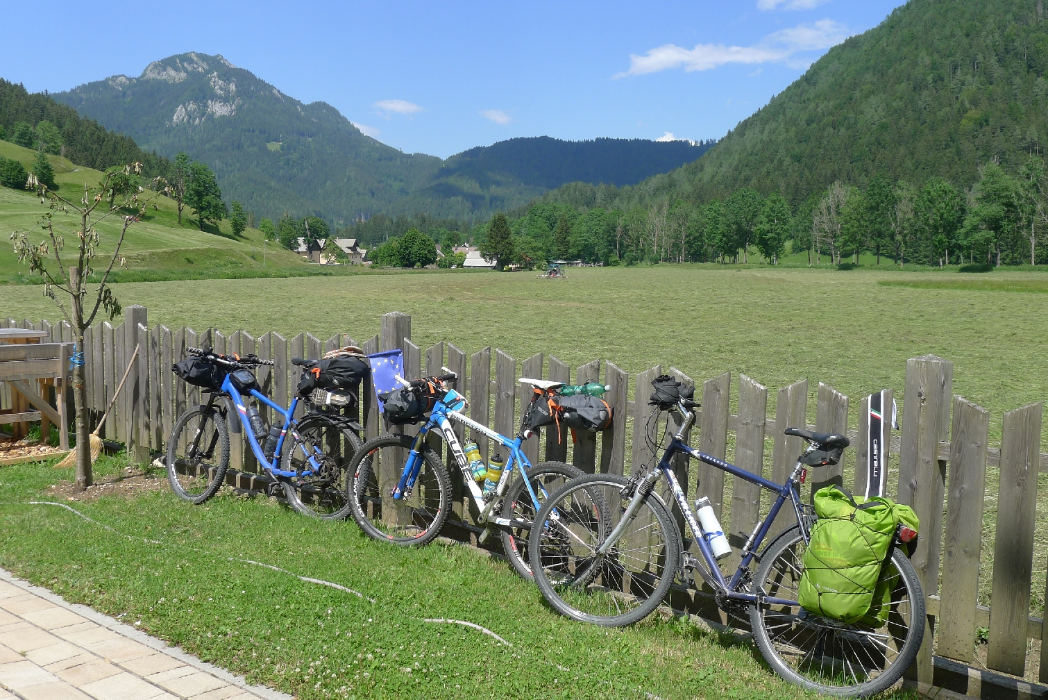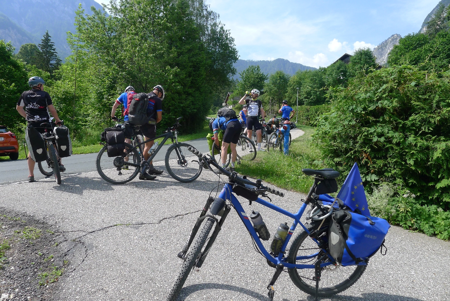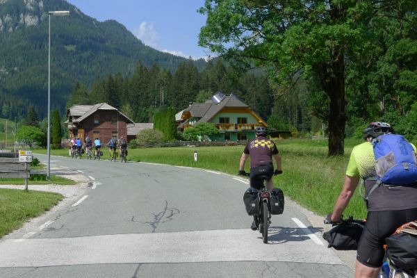 14:30 Uhr: nach 56km erreichen wir Spodnje Jezersko/Unter Seeland. Eine Gastwirtschaft mit Biergarten direkt an der Straße lädt zur Mittagsrast ein. Die Wirtin ist aber allein, bekommt angesichts 10 hungriger Radfahrer Angst und verweist uns auf den nächsten Ort.
