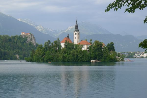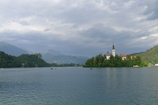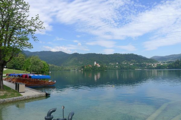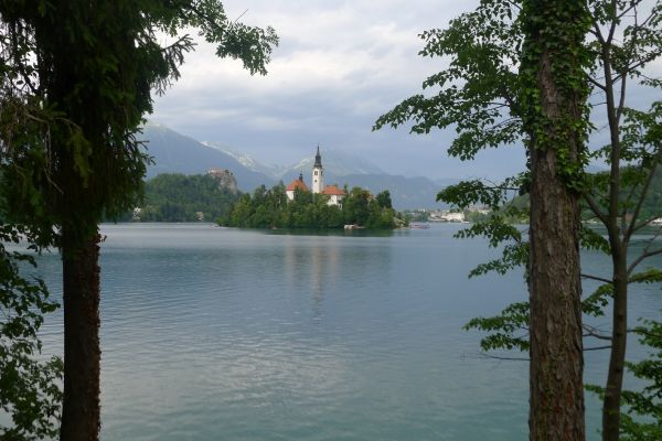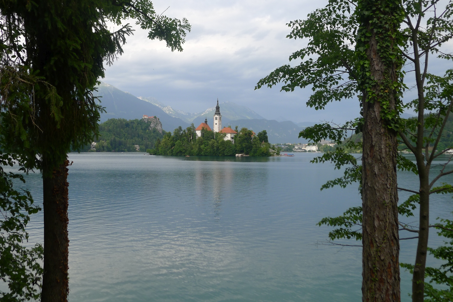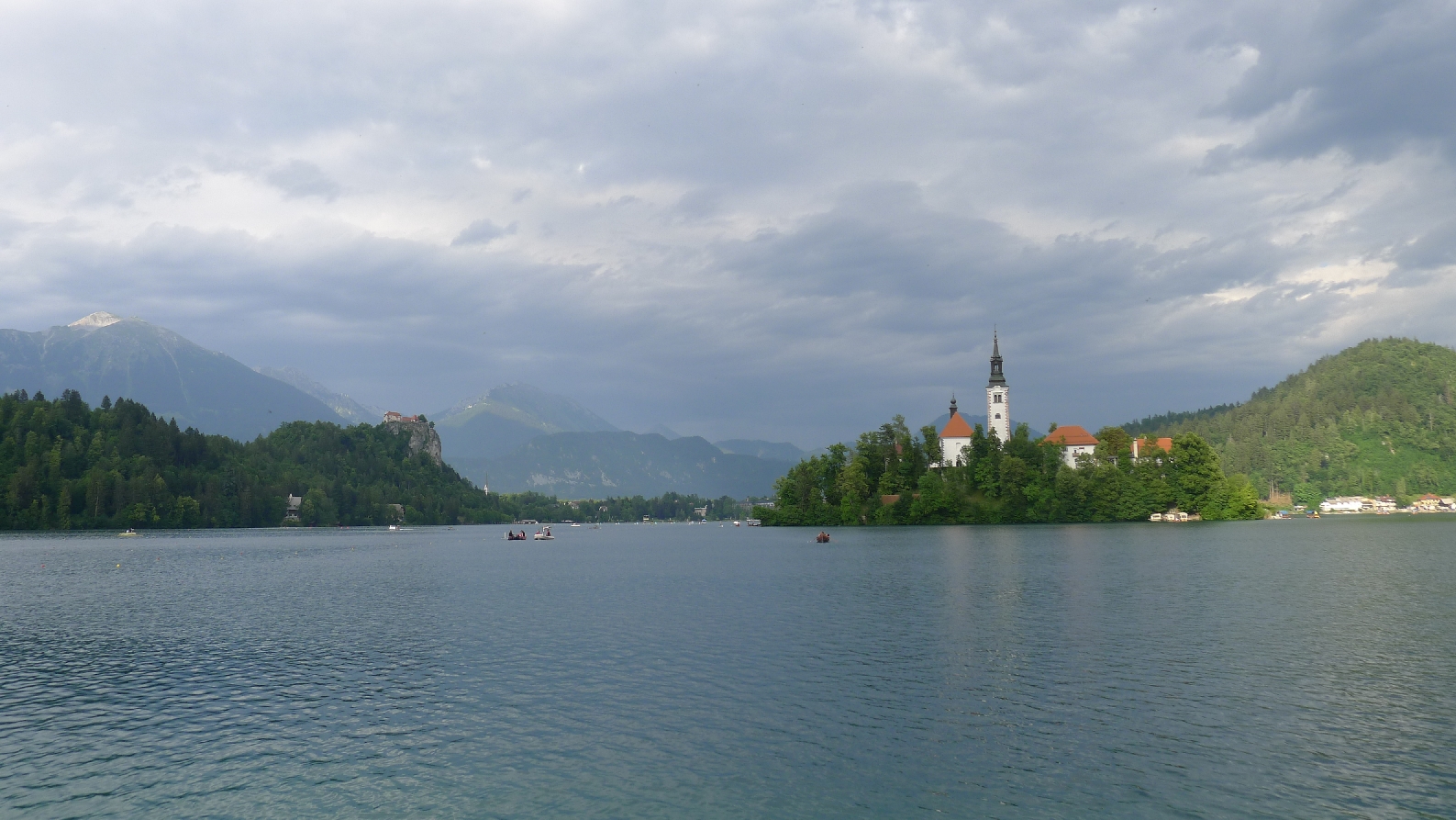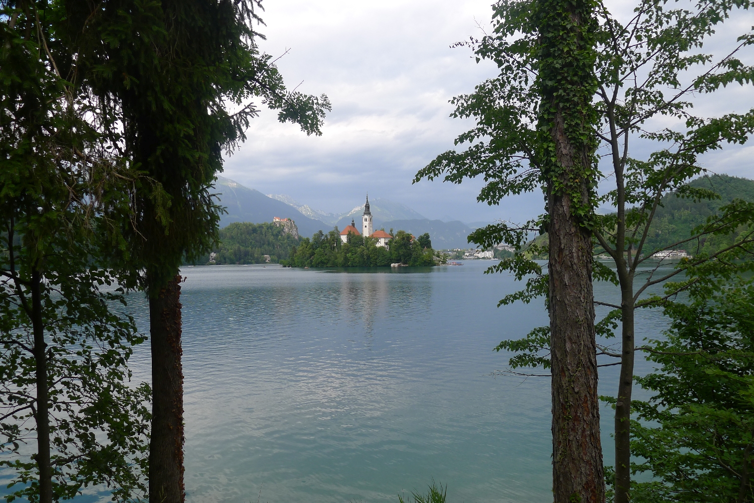17:48 Uhr: wir kommen am Seeufer in Bled an und begeben uns auf eine Runde um den See. Immer wieder gibt es schöne Ausblicke auf die Marieninsel, die alte Burg und die dahinter liegenden schneebedeckten Gipfel der Karawanken.