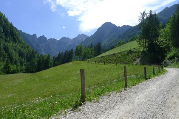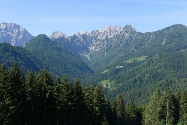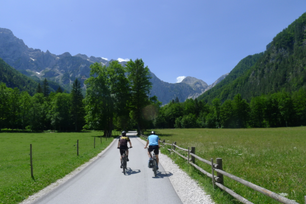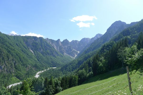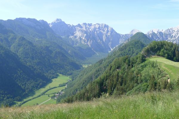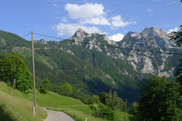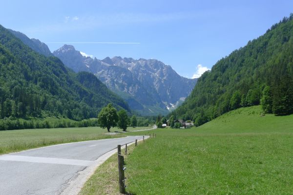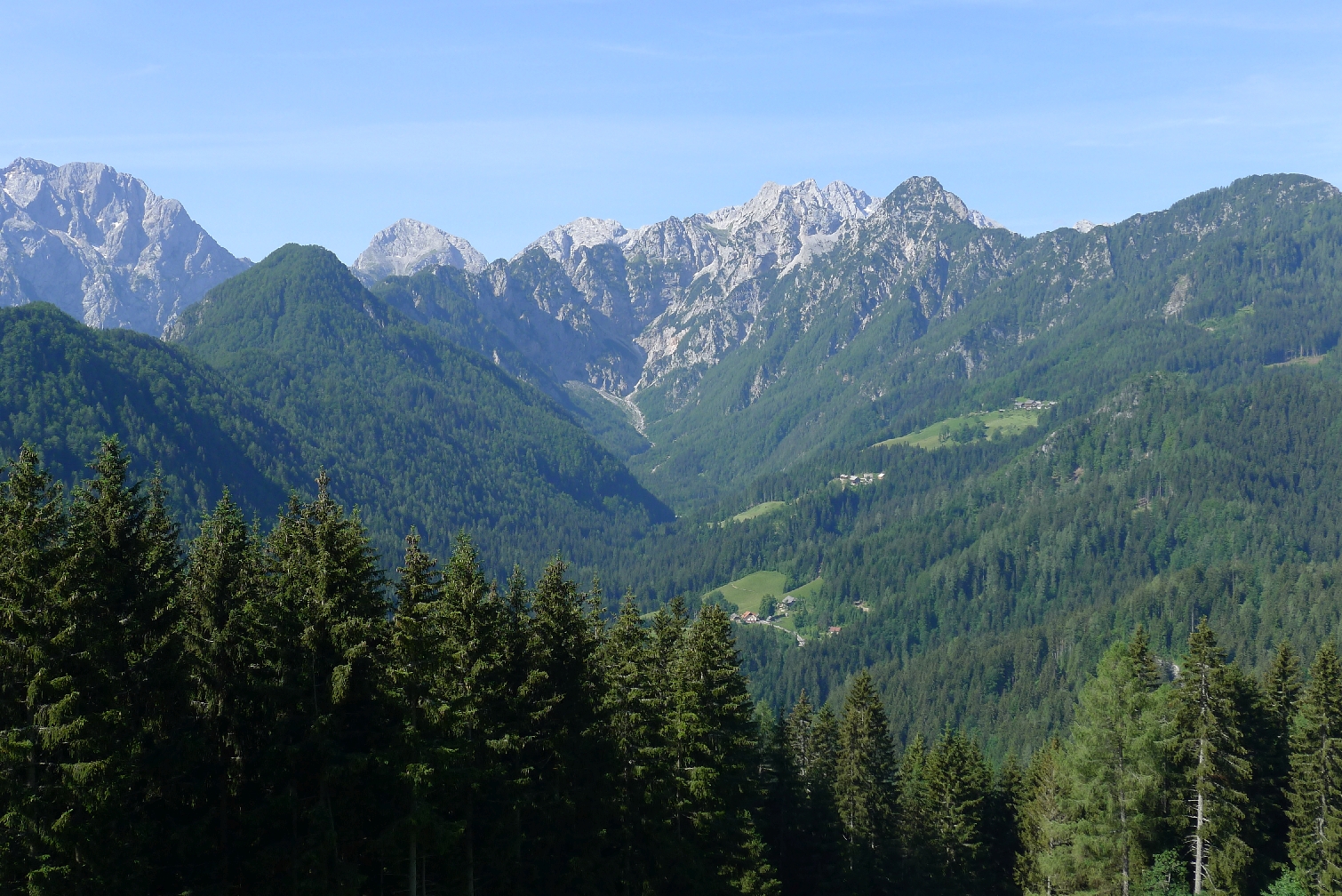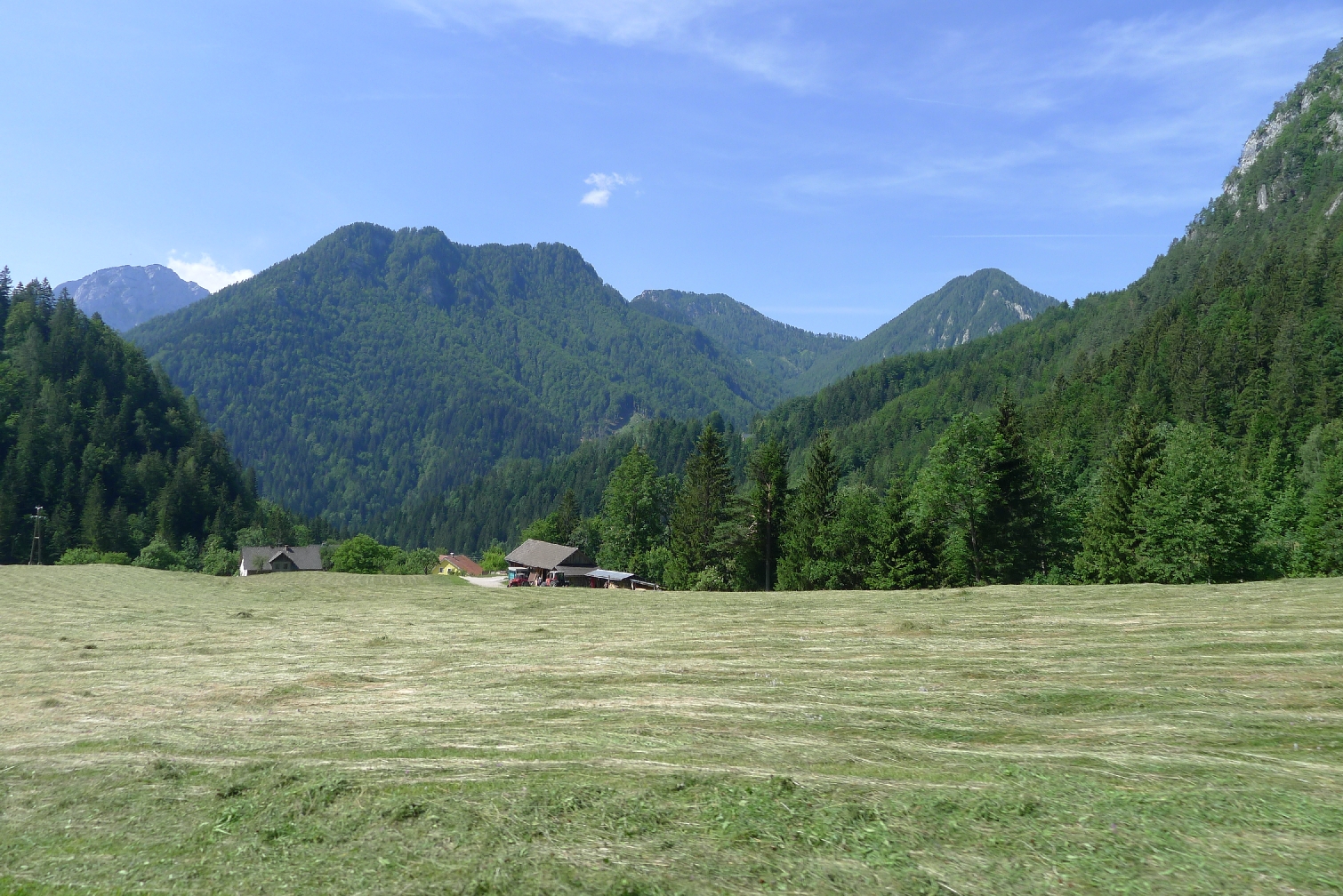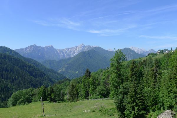 Über zwei, drei Kehren kommen wir nach in Zgornje Jezersko/Seeberg. Das enge Tal öffnet sich zu einem weiten Kessel. Von hier aus bietet sich das schönste Panaroma der bisherigen Strecke. Ein freier Blick auf die Steiner Alpen mit den Zweieinhalbtausendern Jezerska Kočna (2540m), Grintovec (2558m) und Skuta (2532m).