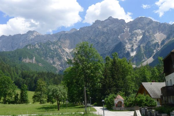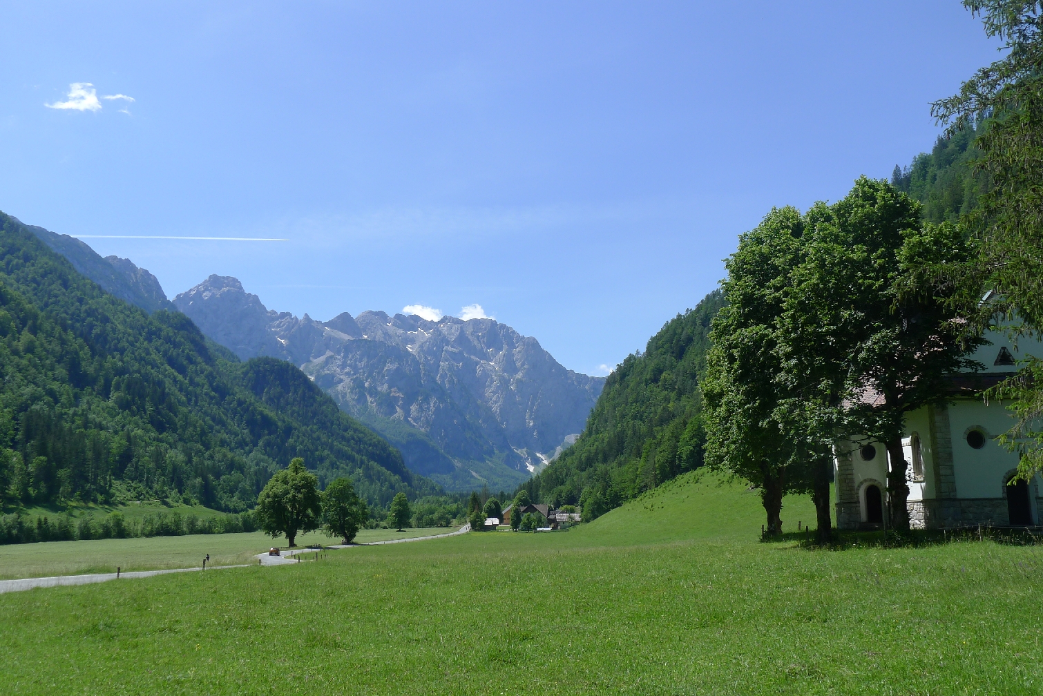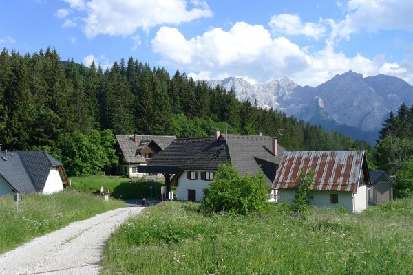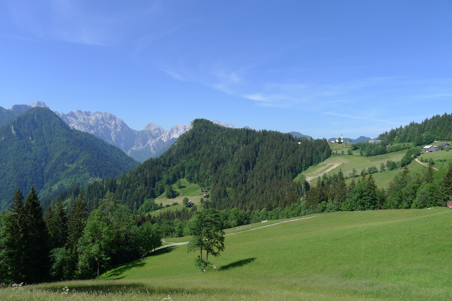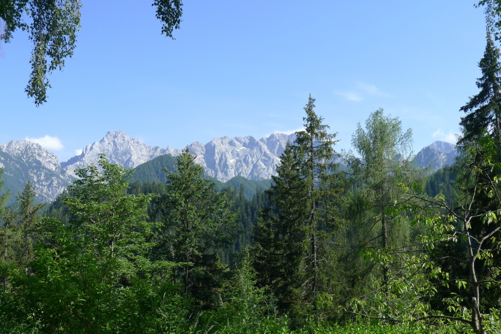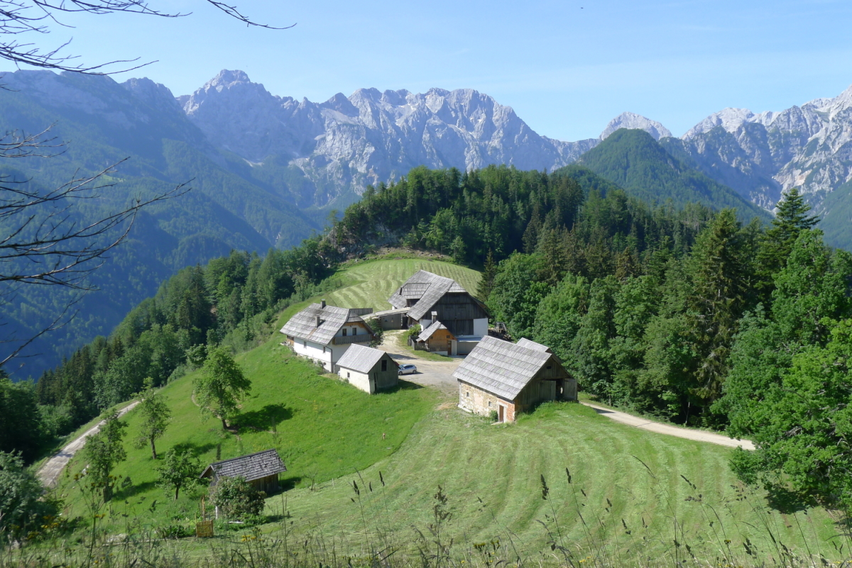 Über zwei, drei Kehren kommen wir nach in Zgornje Jezersko/Seeberg. Das enge Tal öffnet sich zu einem weiten Kessel. Von hier aus bietet sich das schönste Panaroma der bisherigen Strecke. Ein freier Blick auf die Steiner Alpen mit den Zweieinhalbtausendern Jezerska Kočna (2540m), Grintovec (2558m) und Skuta (2532m).